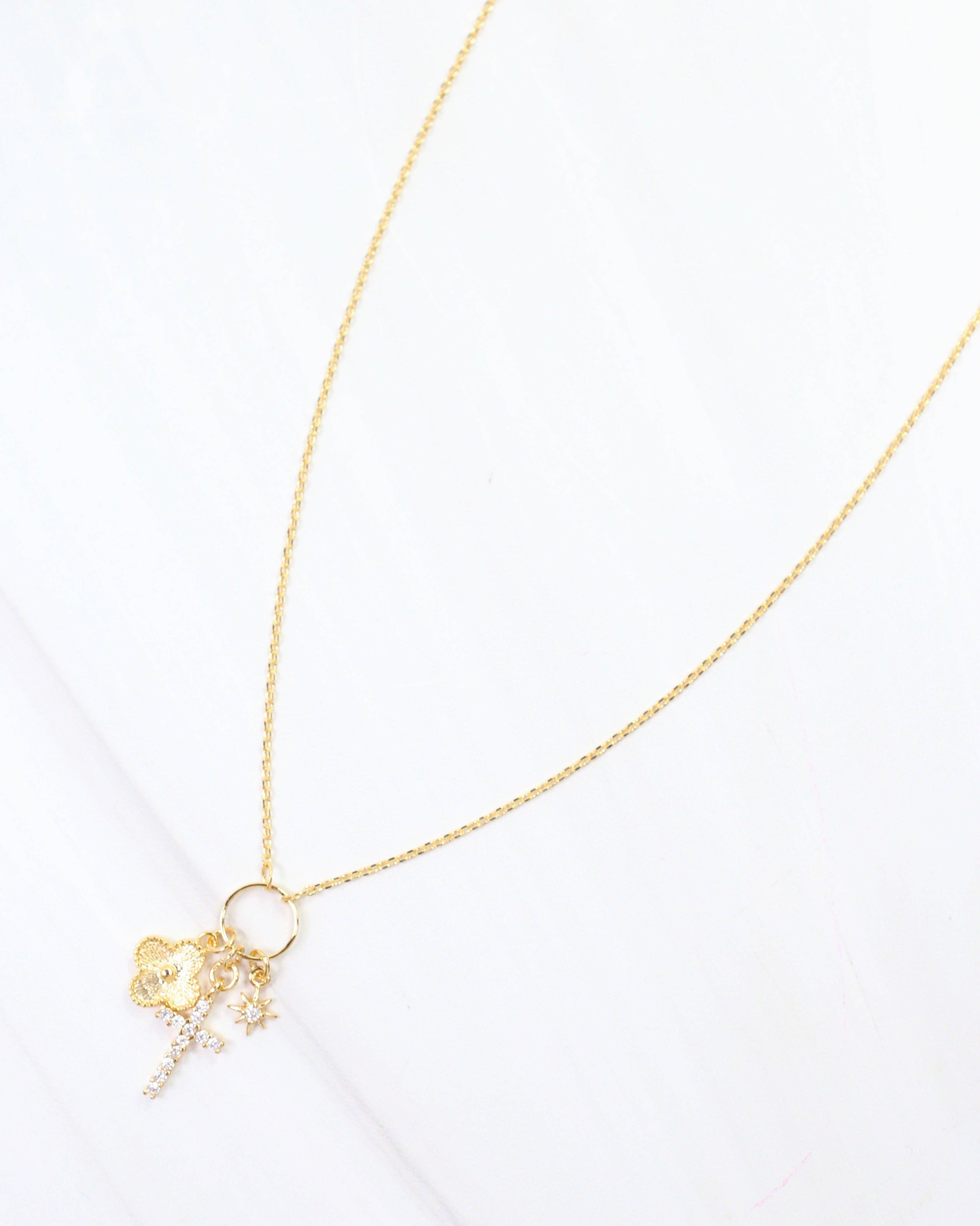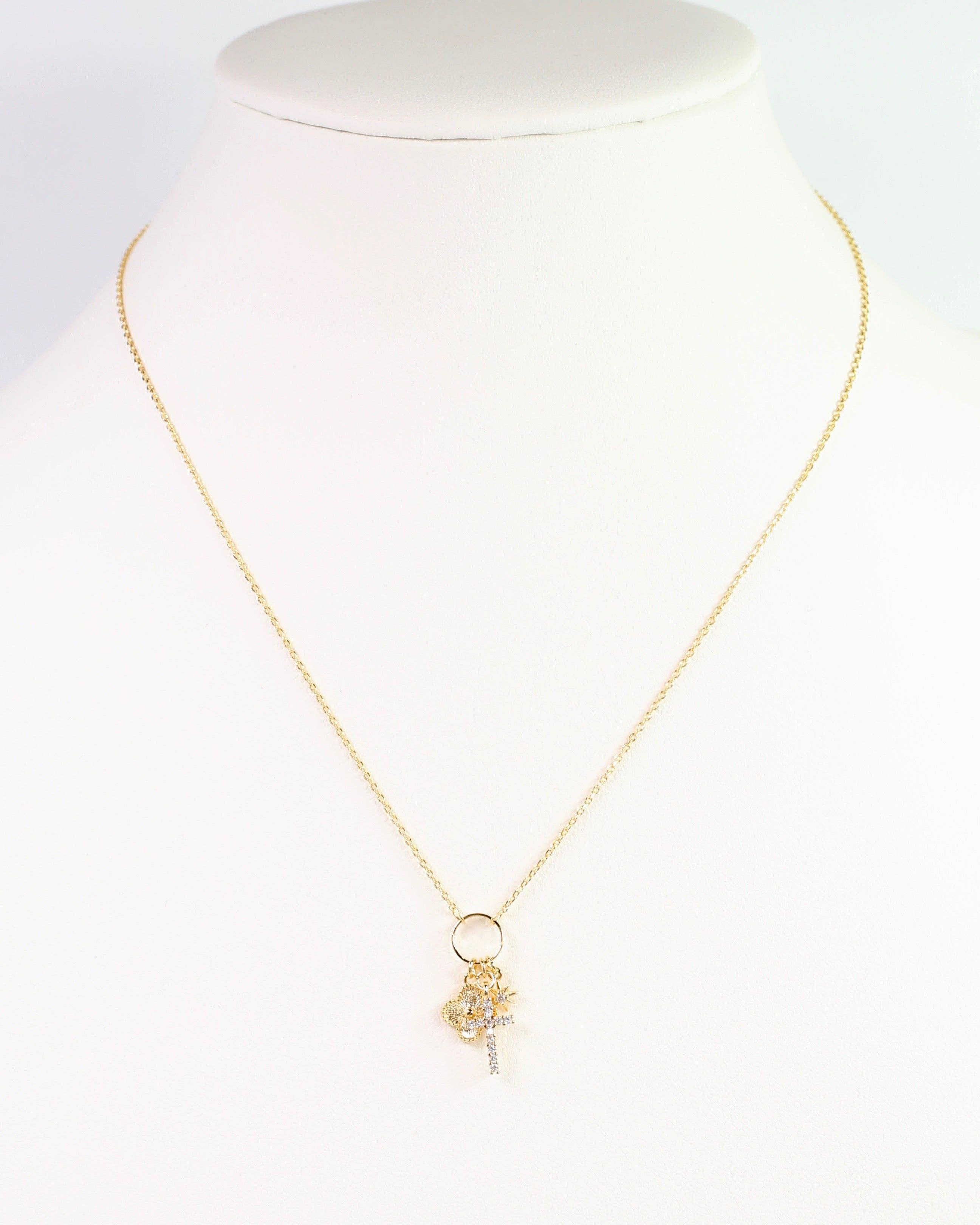 This petite charm necklace is all about subtle style with a playful twist. Featuring a delicate gold chain adorned with a cross, clover, and starburst charm, it adds just the right touch of charm without overwhelming your look. Perfect for layering or wearing solo, it’s the must-have accessory to keep your vibe effortlessly cool and a little lucky too.