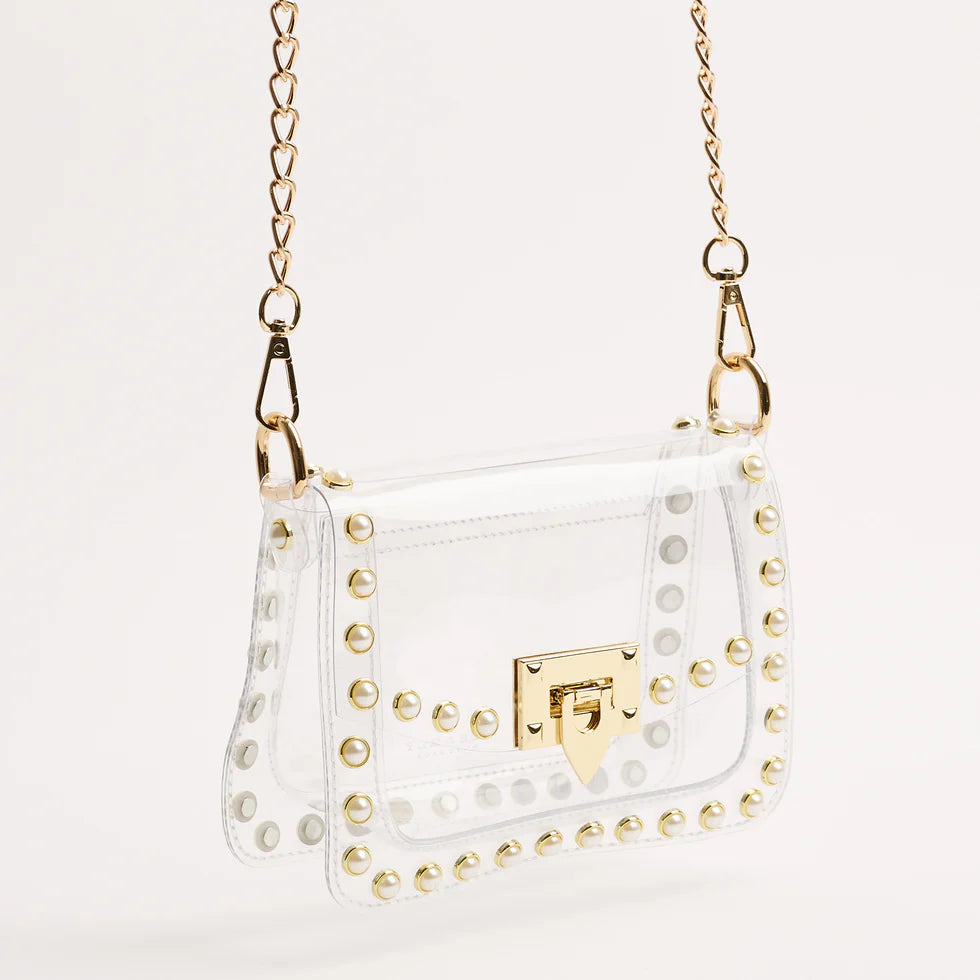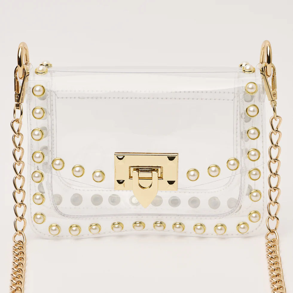 Score with the biggest winner in our clear handbag playbook - The Jackie! The Jackie changed the handbag game by proving clear handbags could be both functional and chic. This style includes pearl metal studs and a gold chain. The Jackie is NCAA and NFL compliant and the ideal size to hold your wallet, phone, keys, lip gloss and a few other small items.