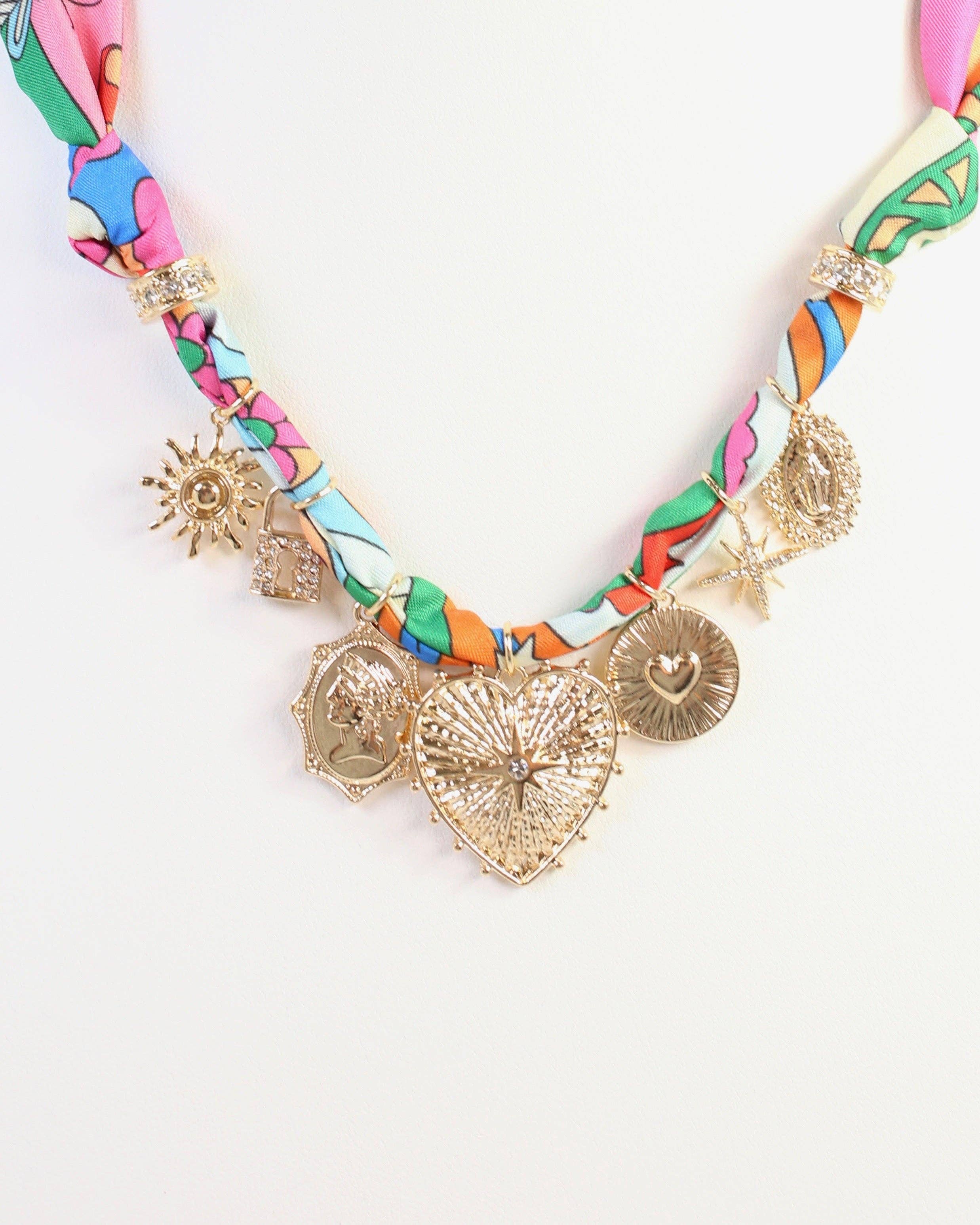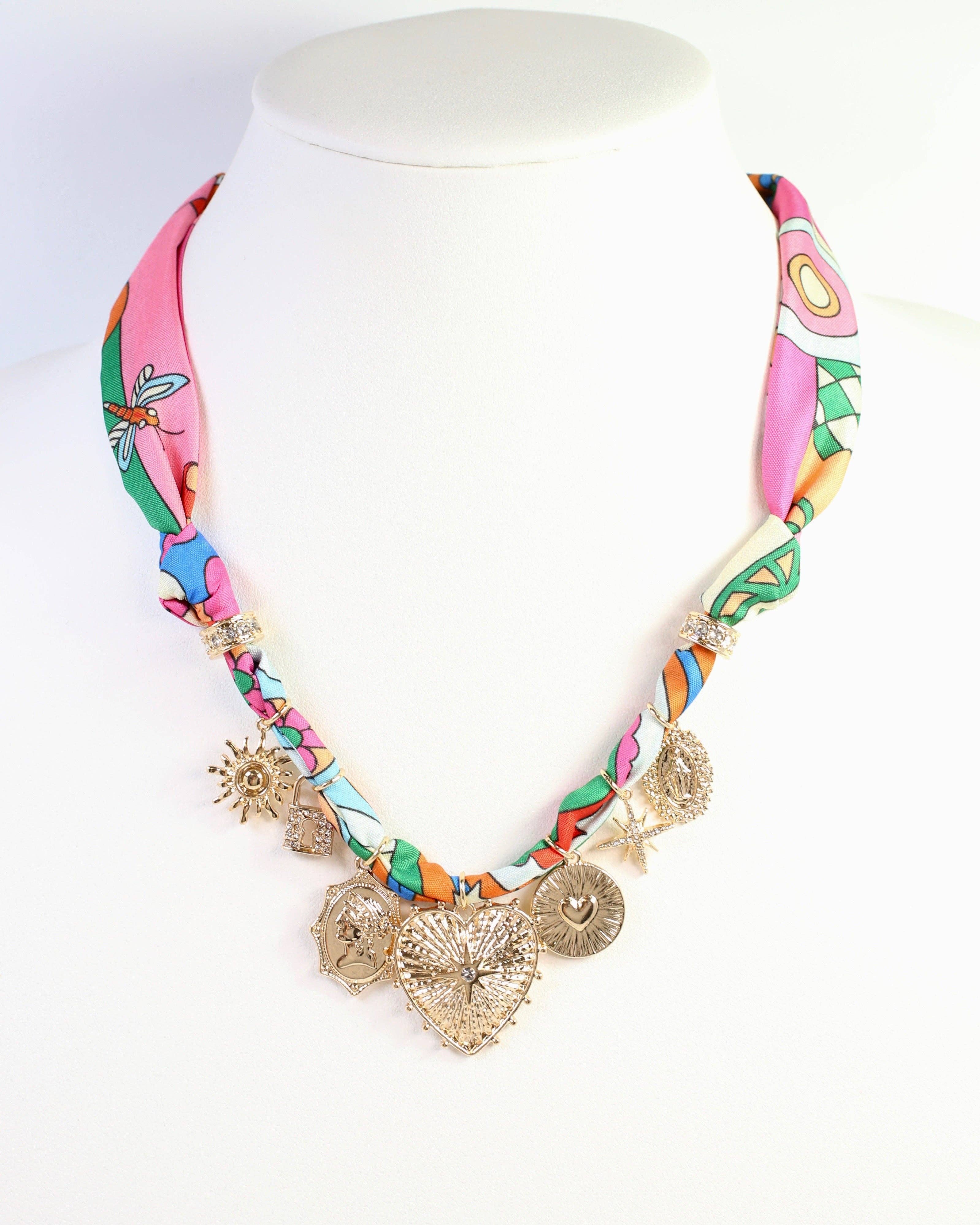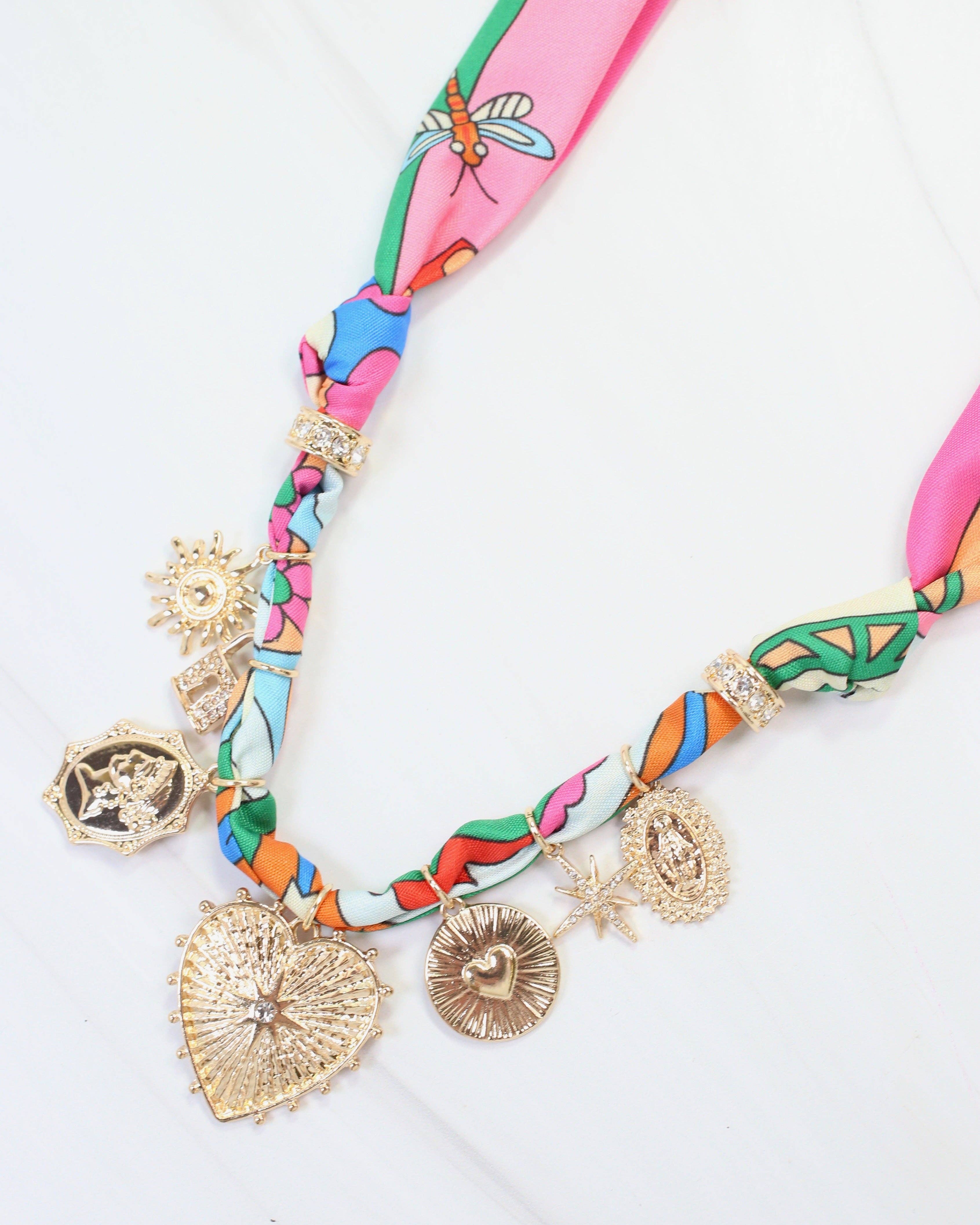 Add a splash of fun to your outfit with the Polly Scarf Charm Necklace in Pink Multi. This playful geometric retro scarf features seven charming accents—heart, sun, lock, star, and three unique medallions—perfectly knotted and accented with two gold sliders. It’s a whimsical blend of style and personality that effortlessly brightens any look!