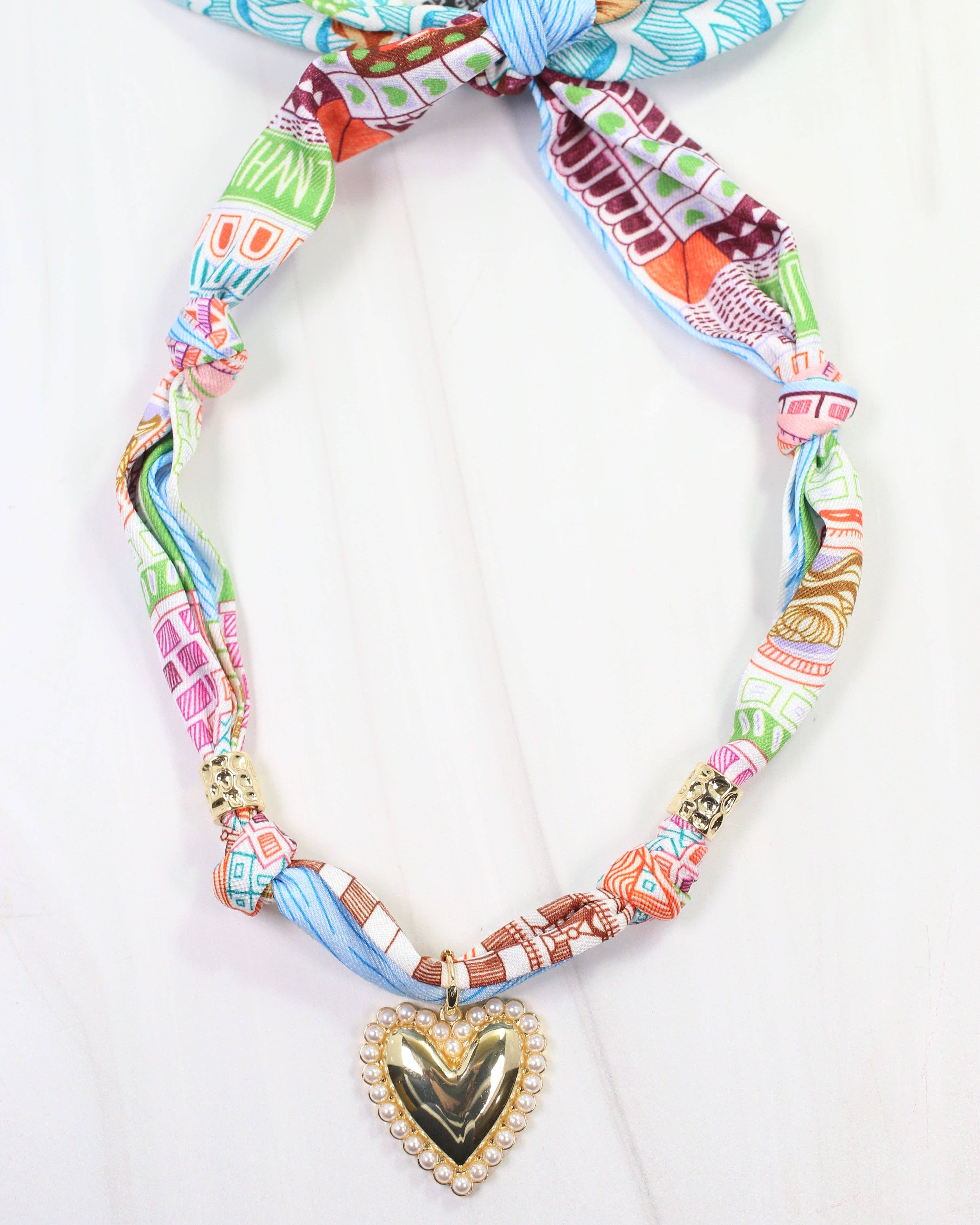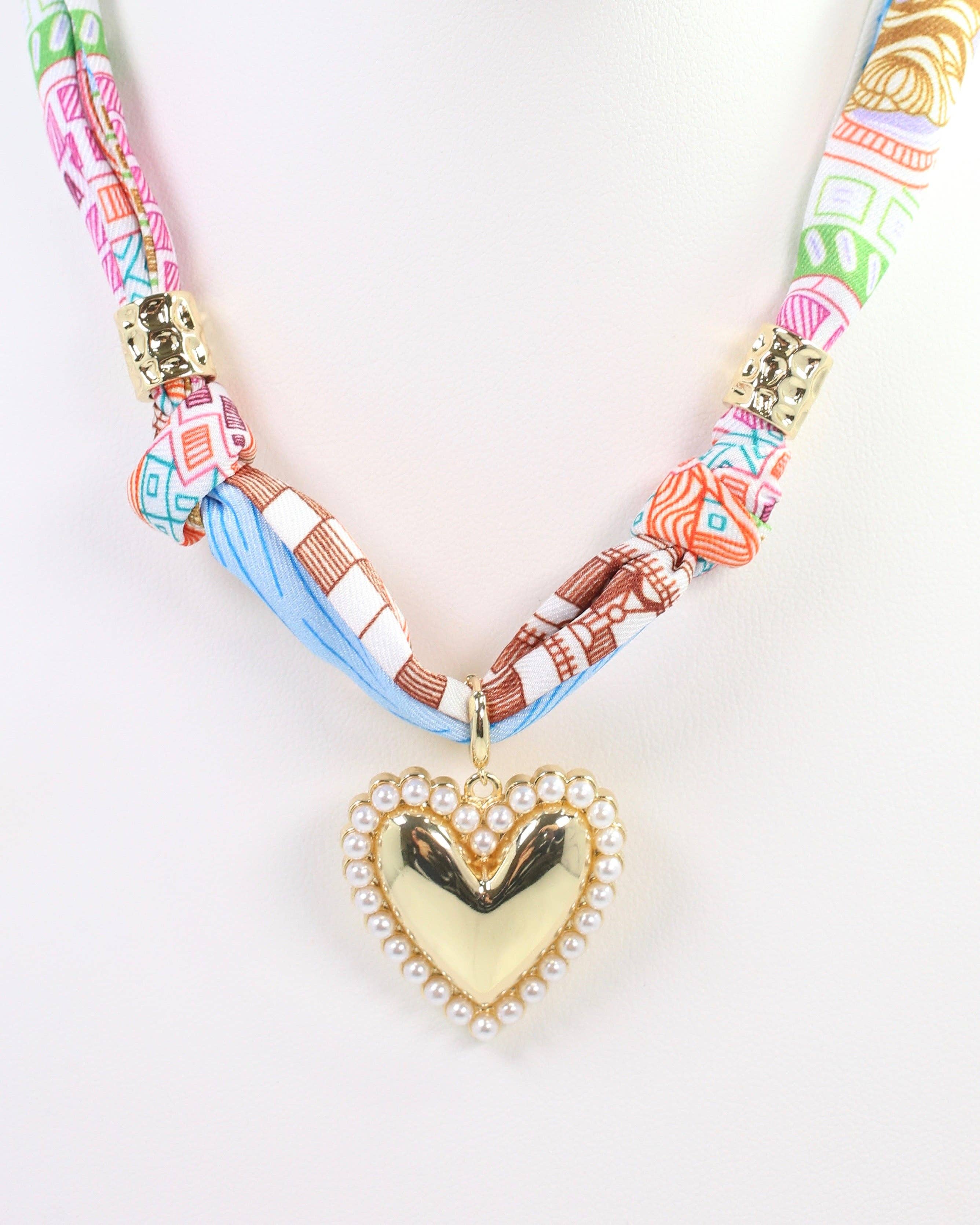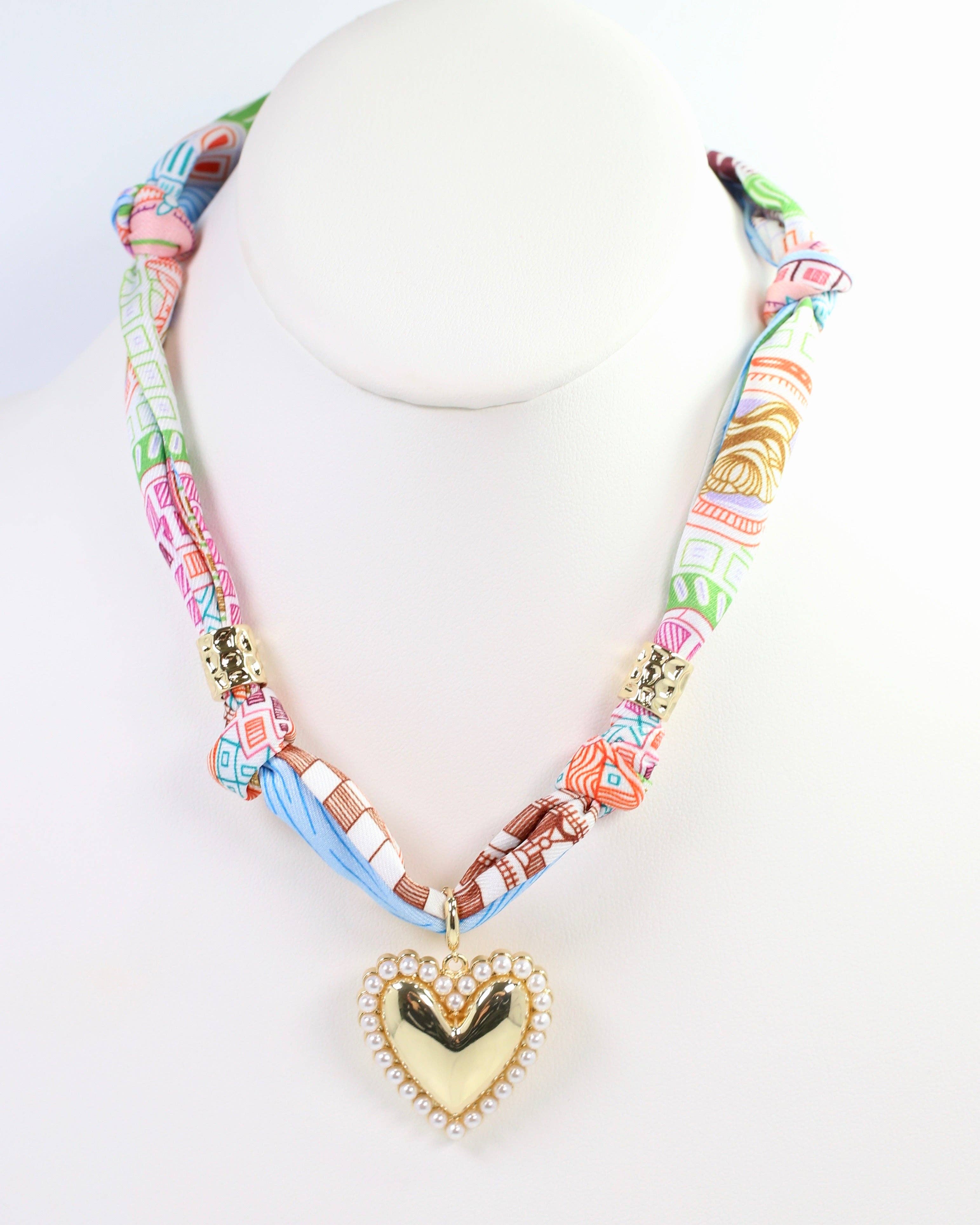 Add a splash of color and charm to any outfit with the Sullivan Scarf Charm Necklace in playful blue and orange hues. Featuring a vibrant printed scarf combined with a hammered gold spacer bead and a shiny gold heart charm accented with delicate pearls, this necklace brings a fun, whimsical touch to your look. Perfect for brightening your day with a mix of texture and sparkle!