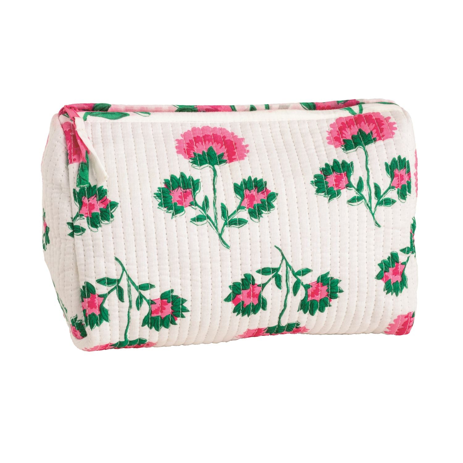 Quilted cotton block print carry-all case with contrast stripe lining and zipper closure.