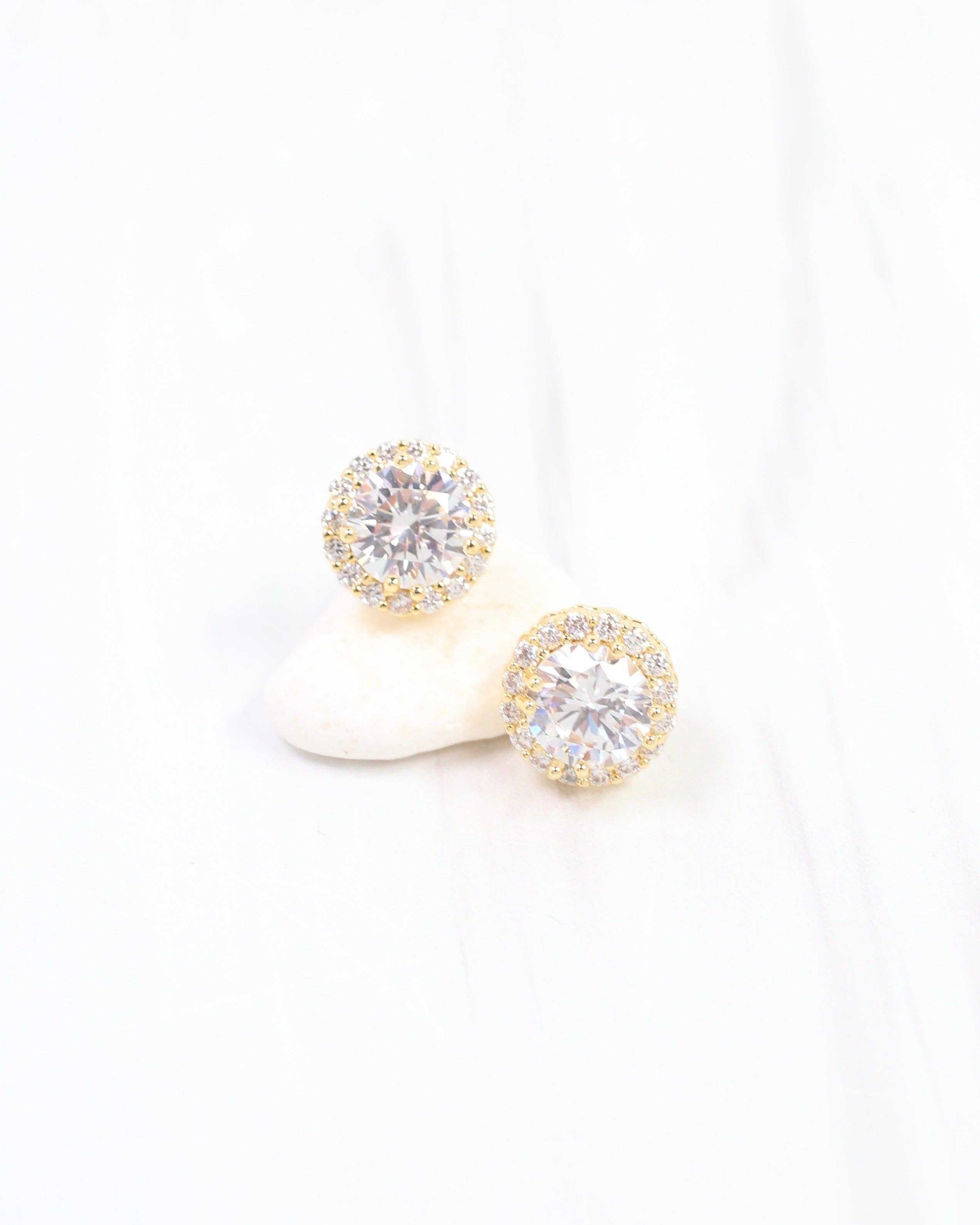 Add a sparkly twist to your look with the Winslow Embellished CZ Stud Earring in Gold. Featuring a dazzling large center stone surrounded by a twinkling halo of smaller crystals, these round studs shine bright with gold-dipped trim and posts. Perfect for making a statement with a touch of glam, these earrings bring playful elegance to any outfit.