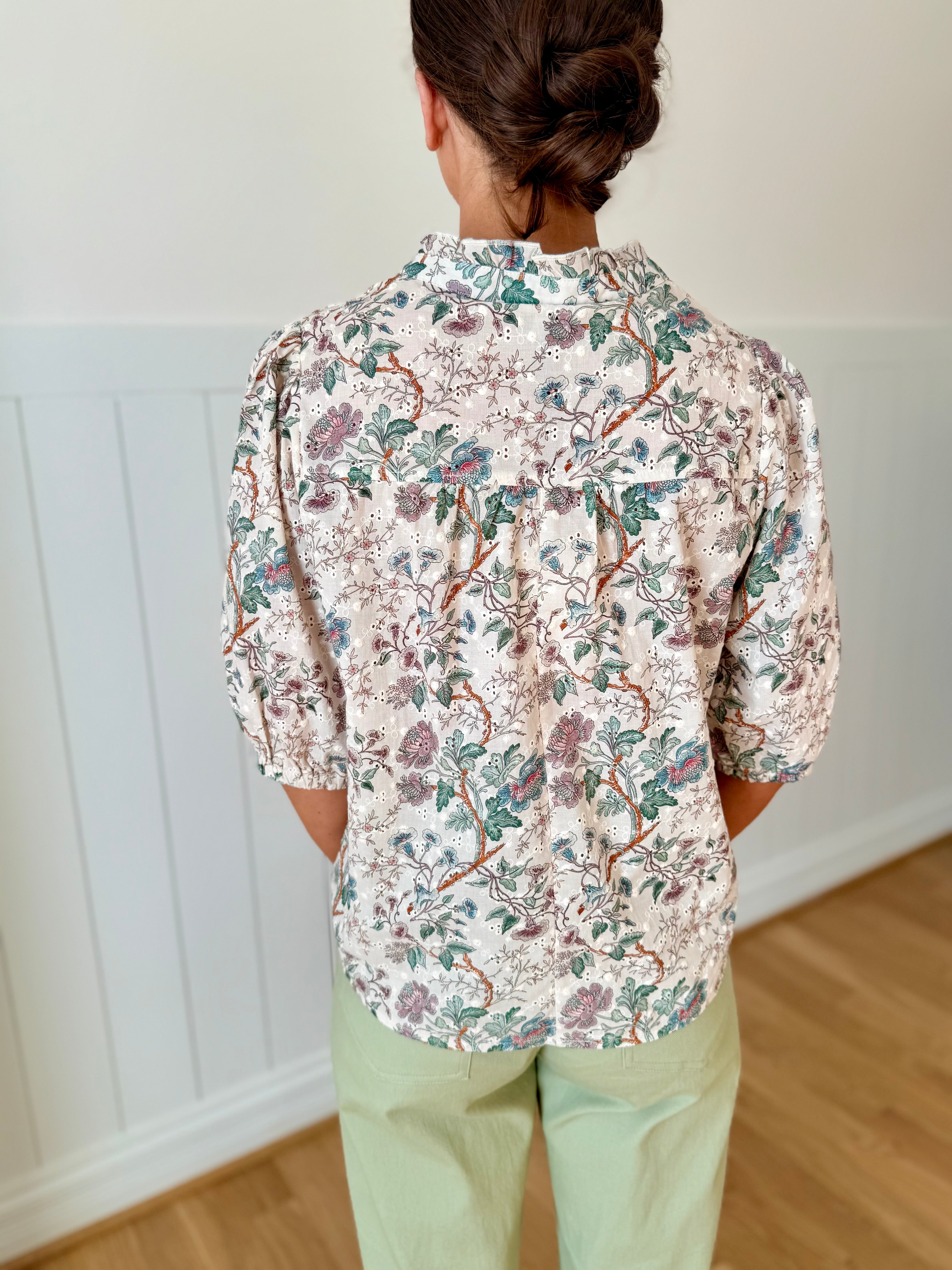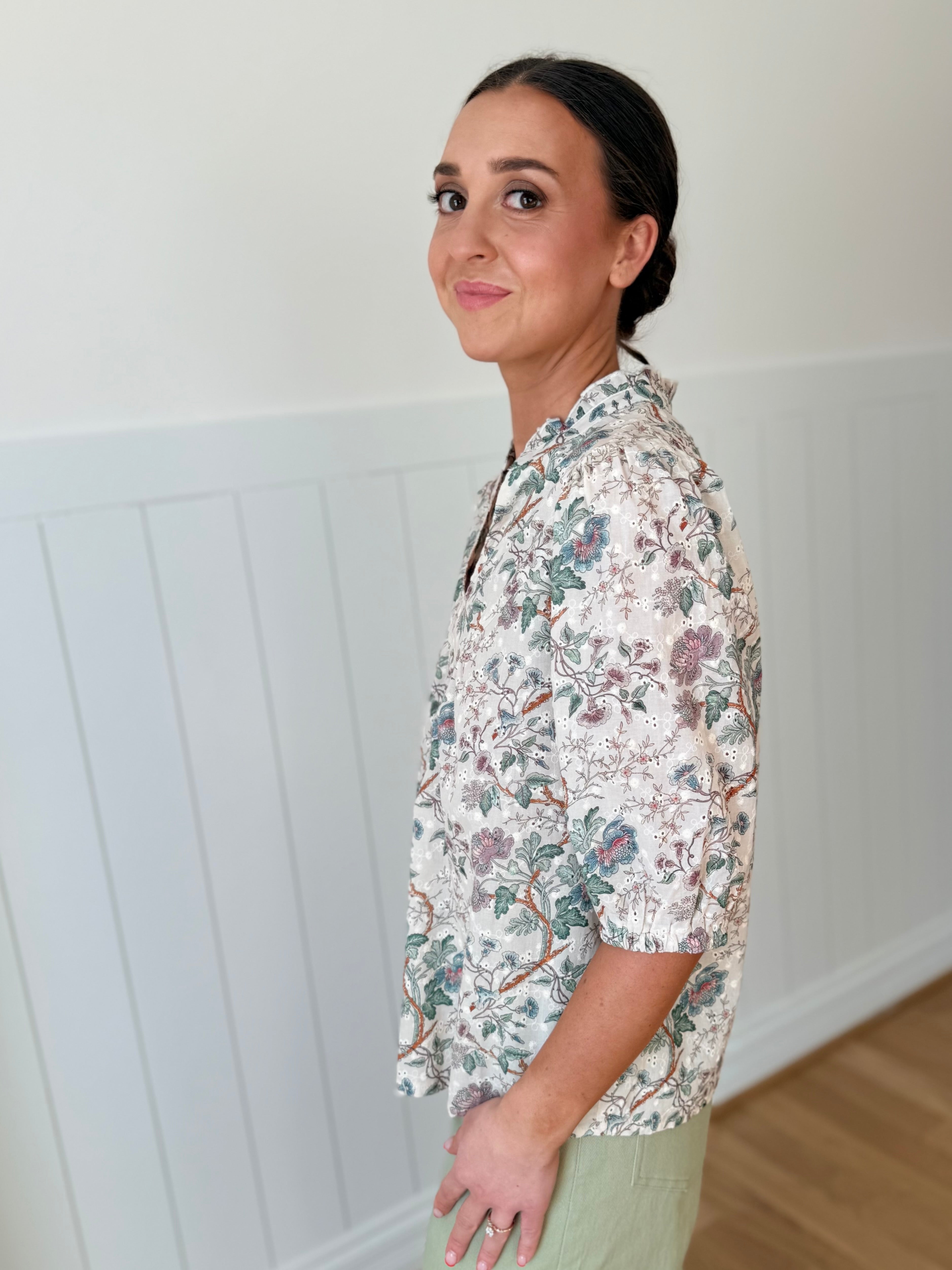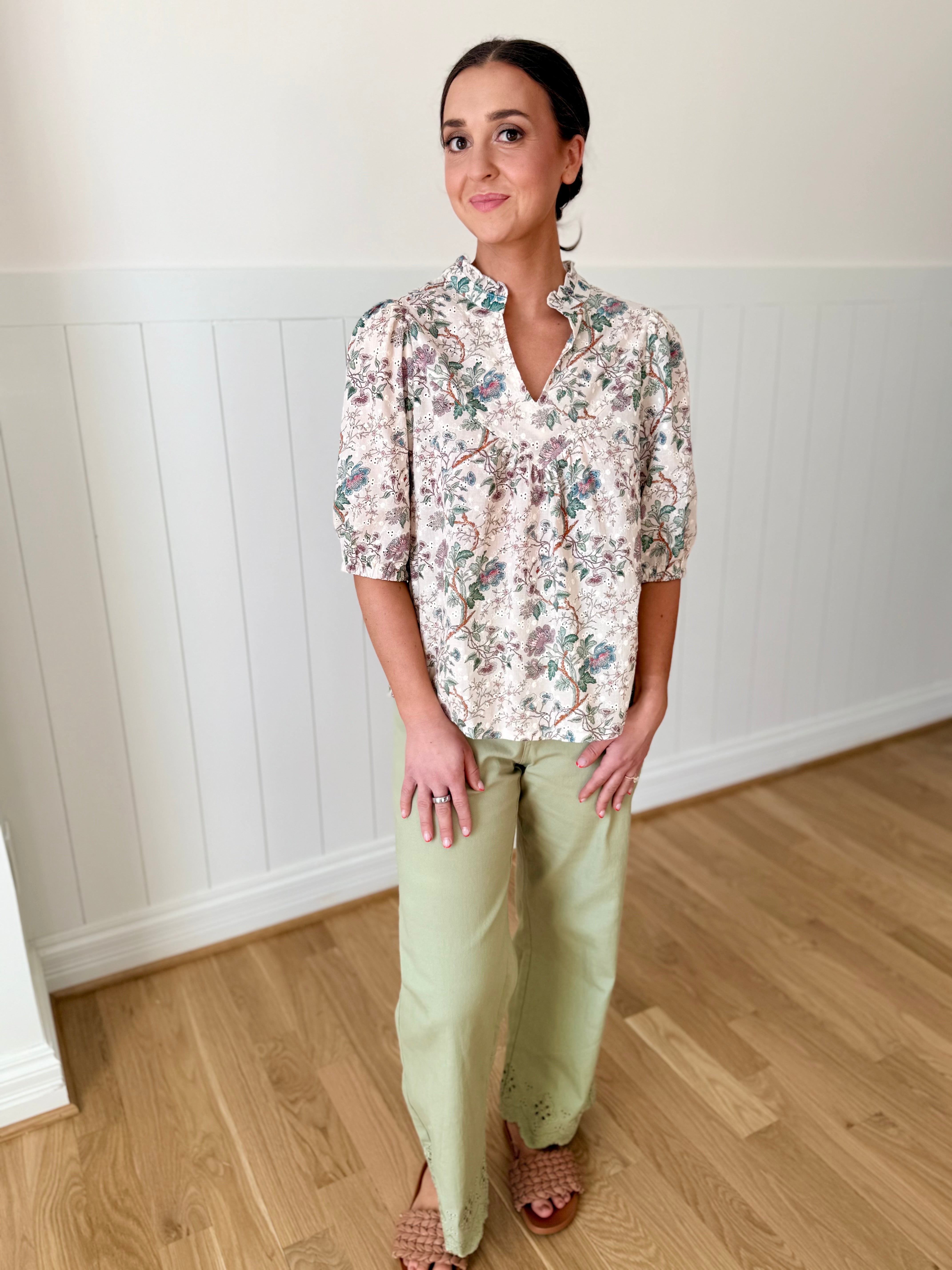 Elevate your everyday wardrobe with this charming floral top! Featuring delicate eyelet details against a soft tan backdrop, it's the perfect piece that transitions seamlessly from the office to weekend adventures. The breezy design keeps you comfortable all day long, while the timeless floral pattern adds just the right touch of personality. Whether you're dressing it up for work or keeping it casual, this versatile top is sure to become a go-to favorite in your closet.