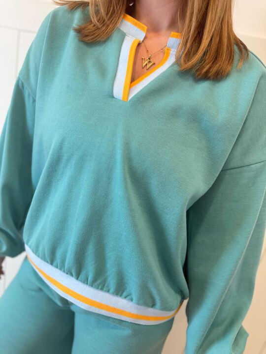 Snuggle up in this stunning teal v-neck sweatshirt that's part of an adorable matching set! The gorgeous teal hue is so flattering and brings instant joy to your wardrobe. The relaxed v-neck design adds a touch of elegance while keeping things comfy and casual. Perfect on its own or paired with its matching counterpart, this sweatshirt is ideal for cozy nights in, casual outings, or whenever you want to feel effortlessly cute. Soft, huggable, and totally you—this is comfort with serious style!