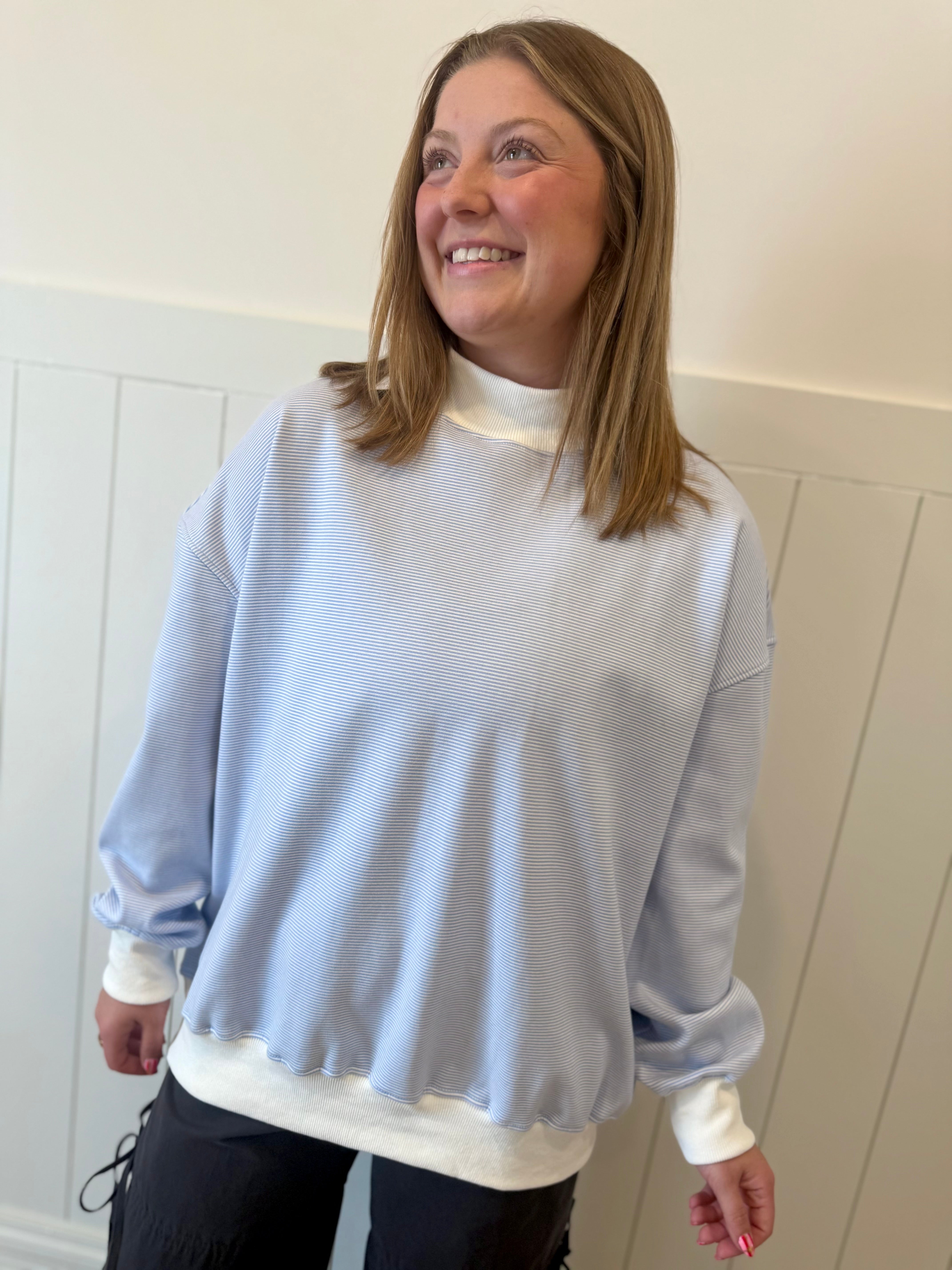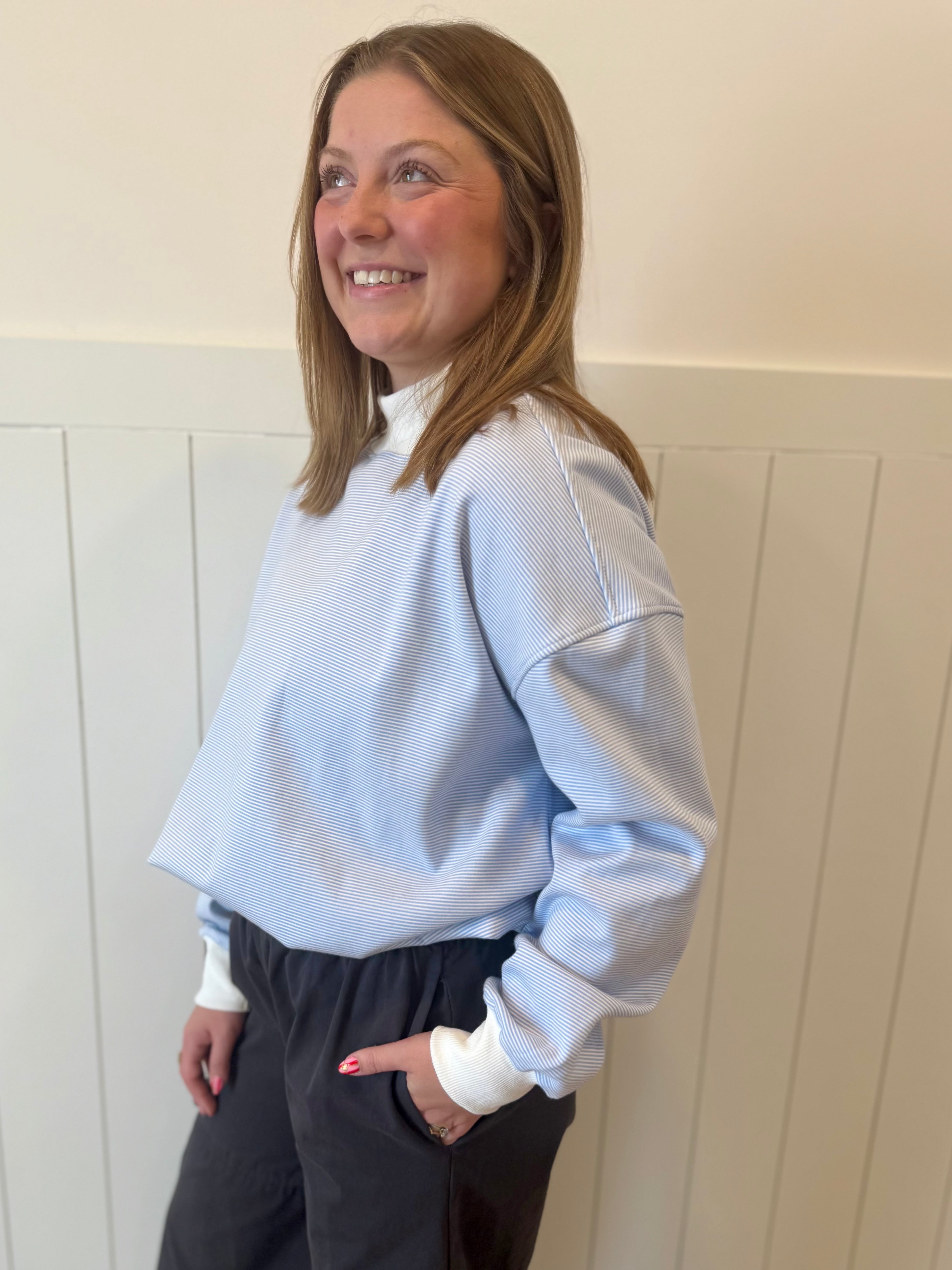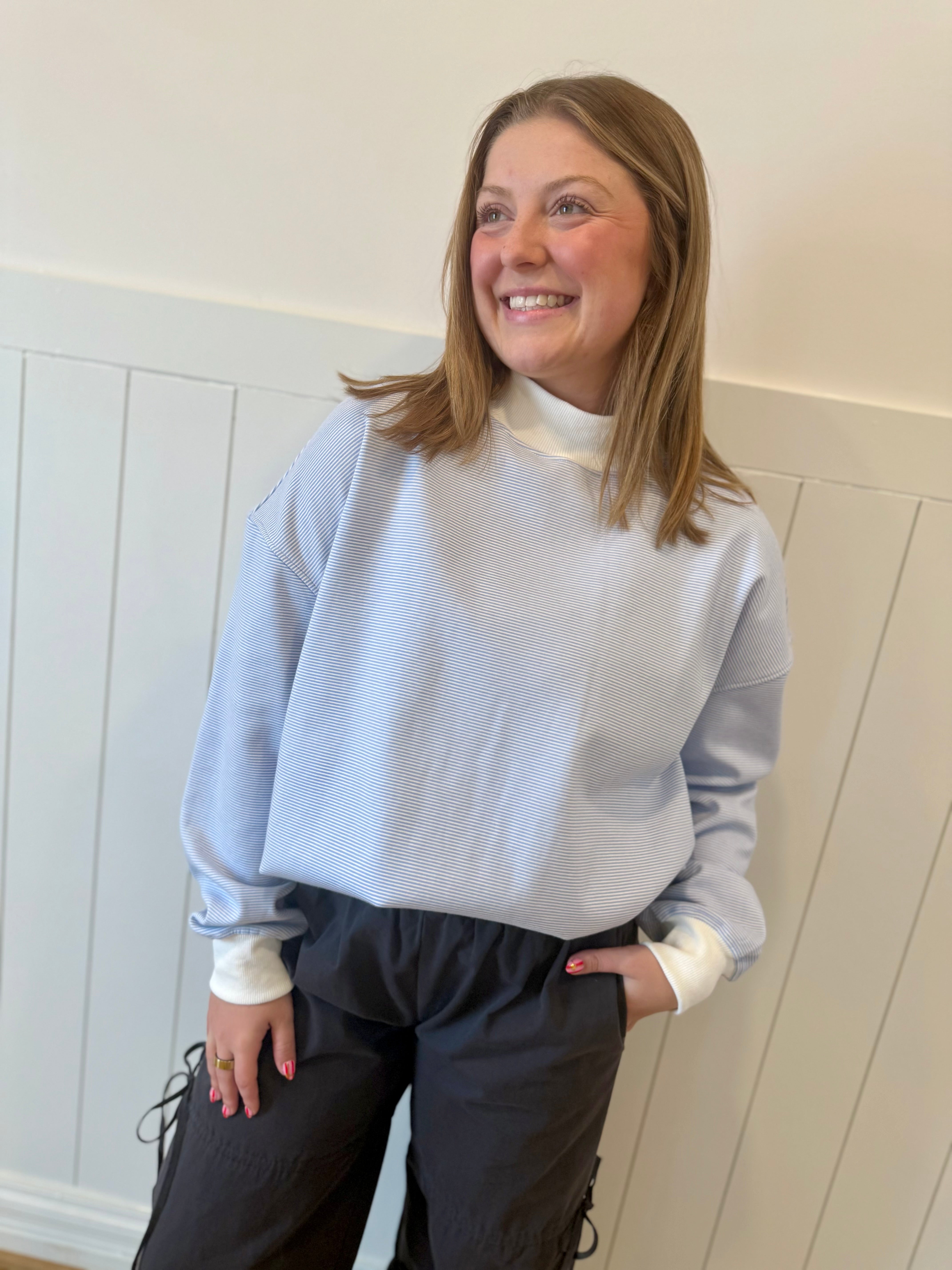 Stay cozy and stylish with our Dreamy Days Sweatshirt. This blue and white stripped mock neck design adds a touch of sweetness to your look. Perfect for chilly days and versatile enough for any occasion. Embrace comfort and style with this must-have addition to your wardrobe.