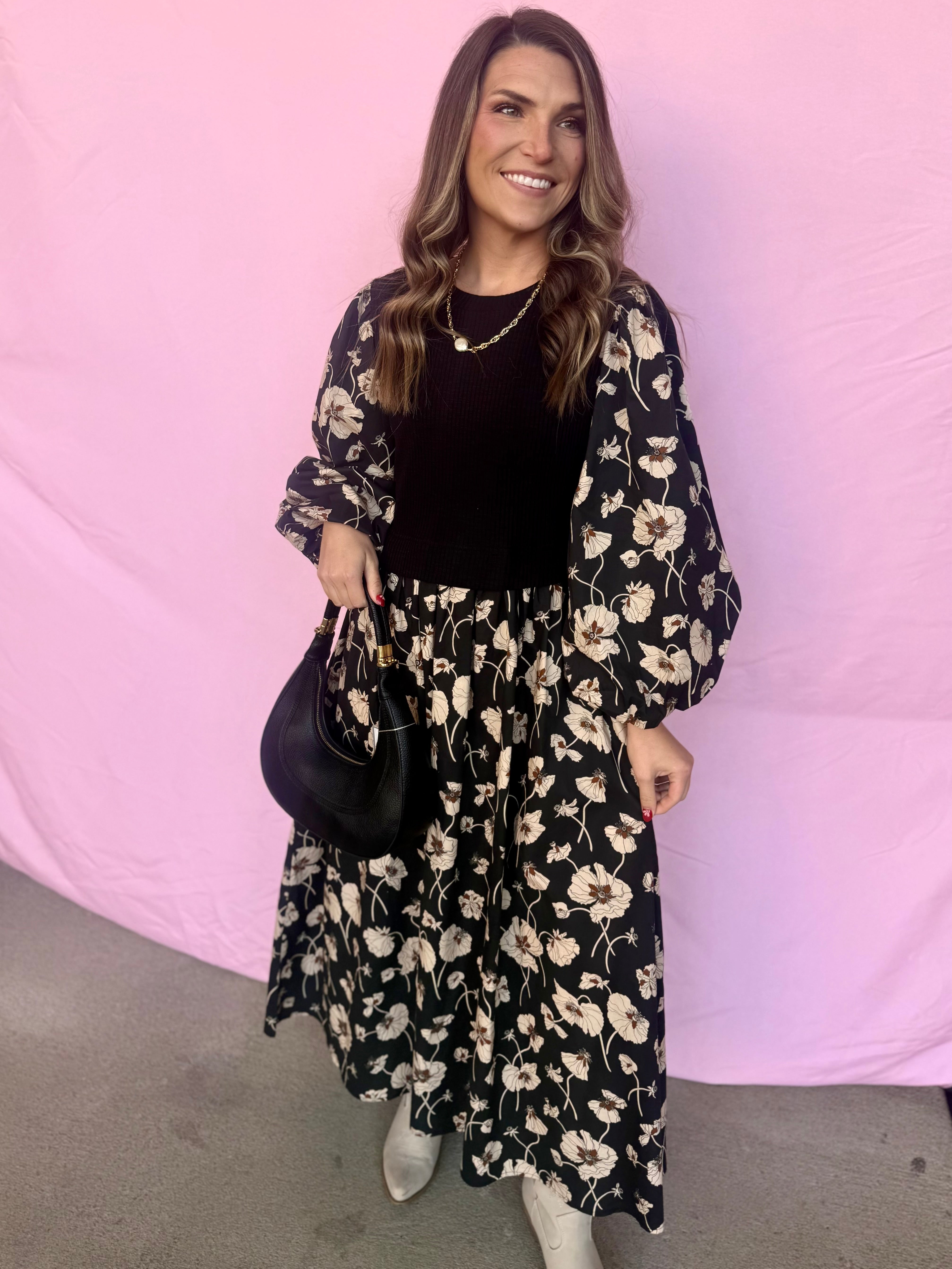 The Just My Style Dress is a charming maxi dress featuring a graceful black and floral print that adds a touch of whimsy to any day. Its long sleeves provide cozy coverage while keeping the look effortlessly elegant. Perfect for twirling into your favorite moments, this dress combines comfort with a sweet, flirty vibe you'll adore.