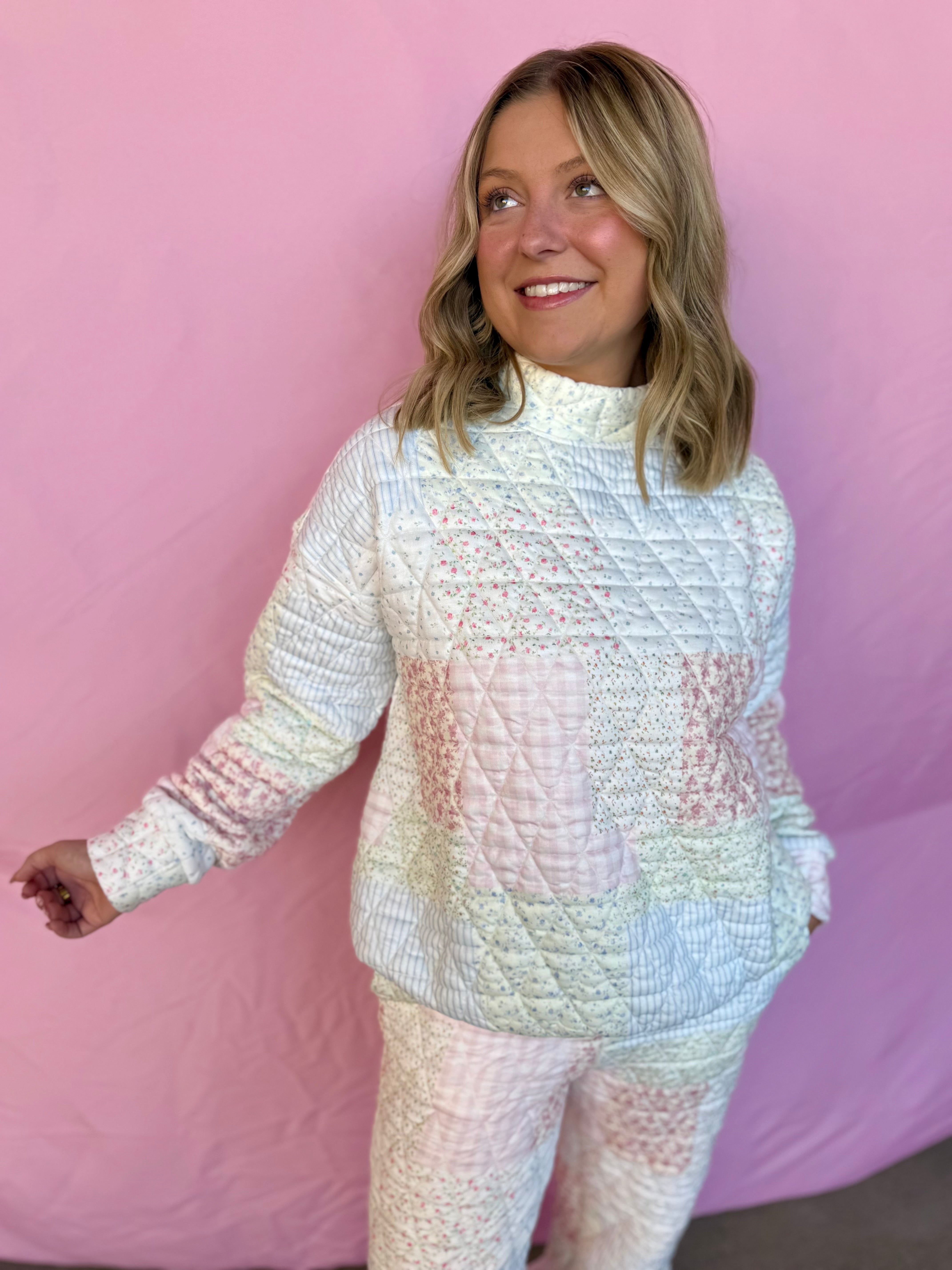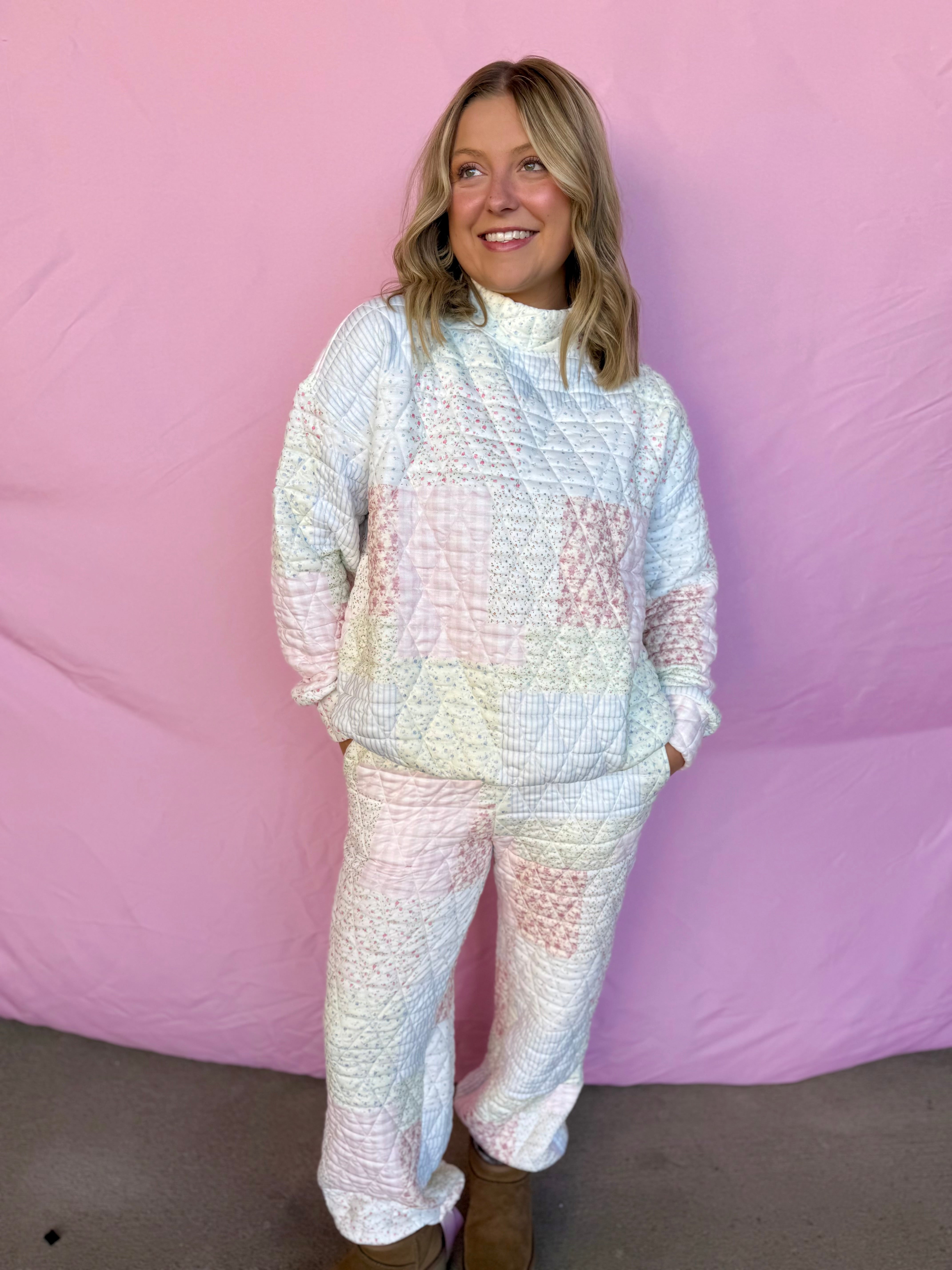 Snuggle up in the Printed Comfort Mock Neck, featuring a charming quilted floral pattern that’s as cozy as it is cute. The soft mock neck adds a sweet, bubbly vibe, perfect for lounging or casual days out. Pair it with the matching sweatpants for a coordinated look—sold separately—to double the comfy fun!