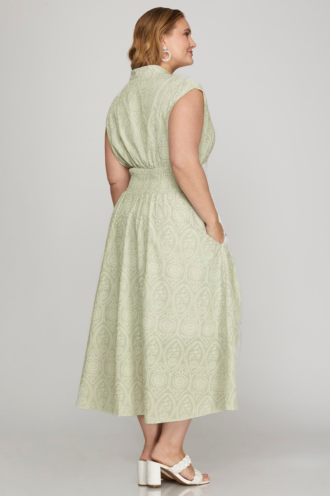 Effortlessly charming and oh-so-comfortable, this midi dress is your new go-to for looking put-together without trying too hard. The relaxed drop shoulders create a flattering silhouette, while the smocked waist cinches just right for a feminine touch. Front zip closure makes getting dressed a breeze, and delicate eyelet details add a sweet, romantic vibe. The pretty printed pattern brings personality to every outfit, and practical pockets? Yes, please! Perfect for casual days or dressed-up occasions, this curvy-friendly style celebrates your beautiful shape with confidence and grace.