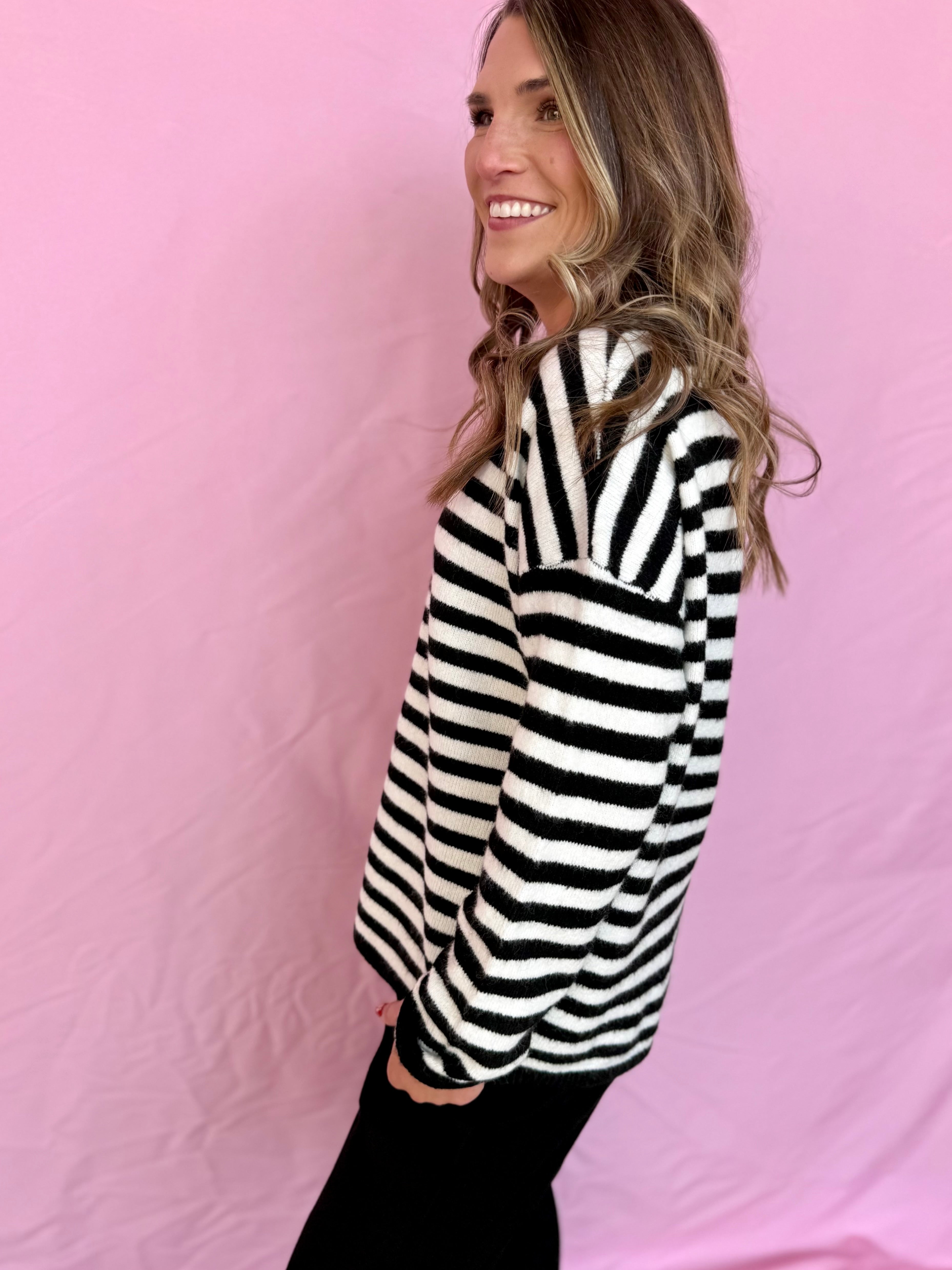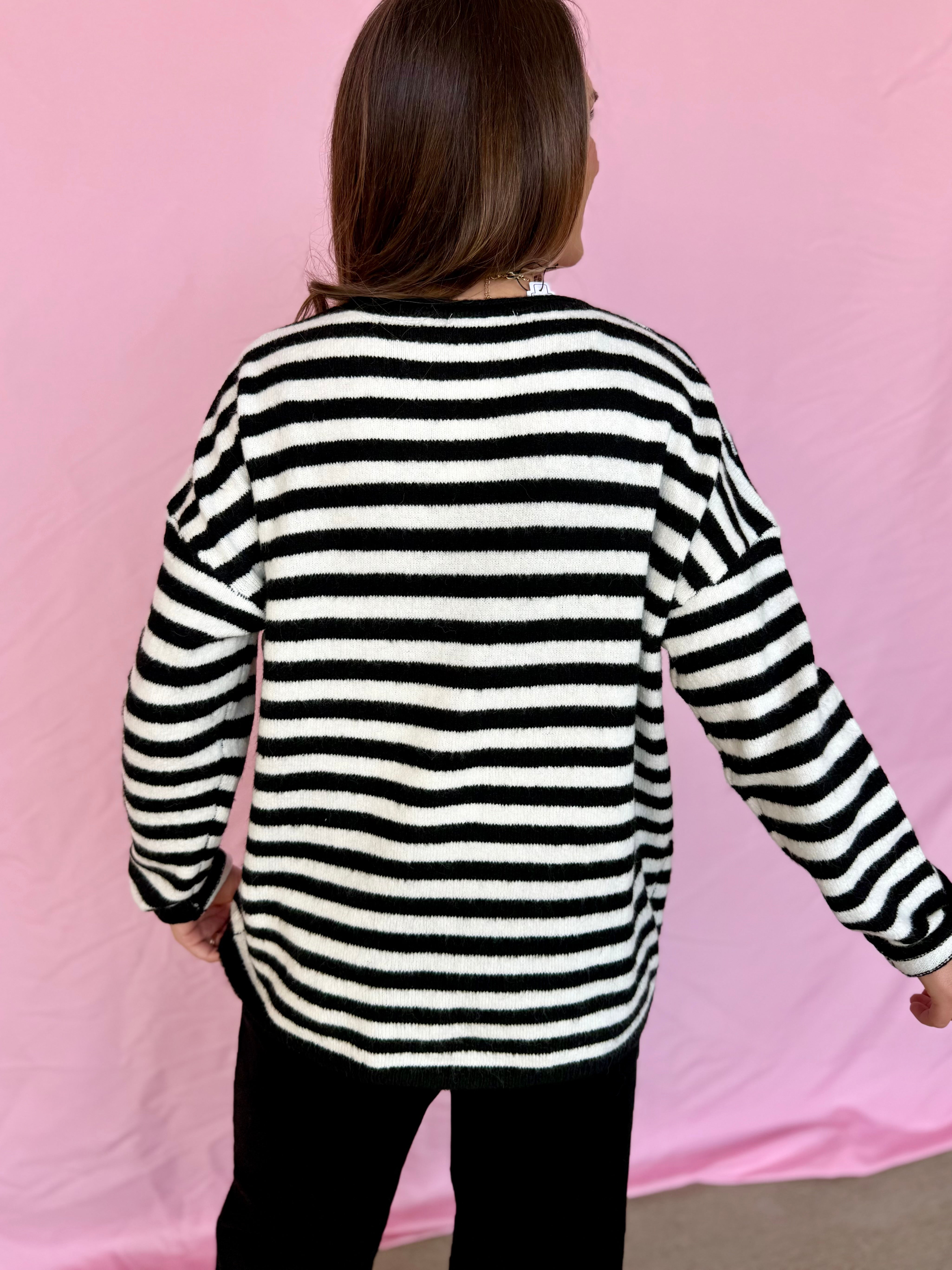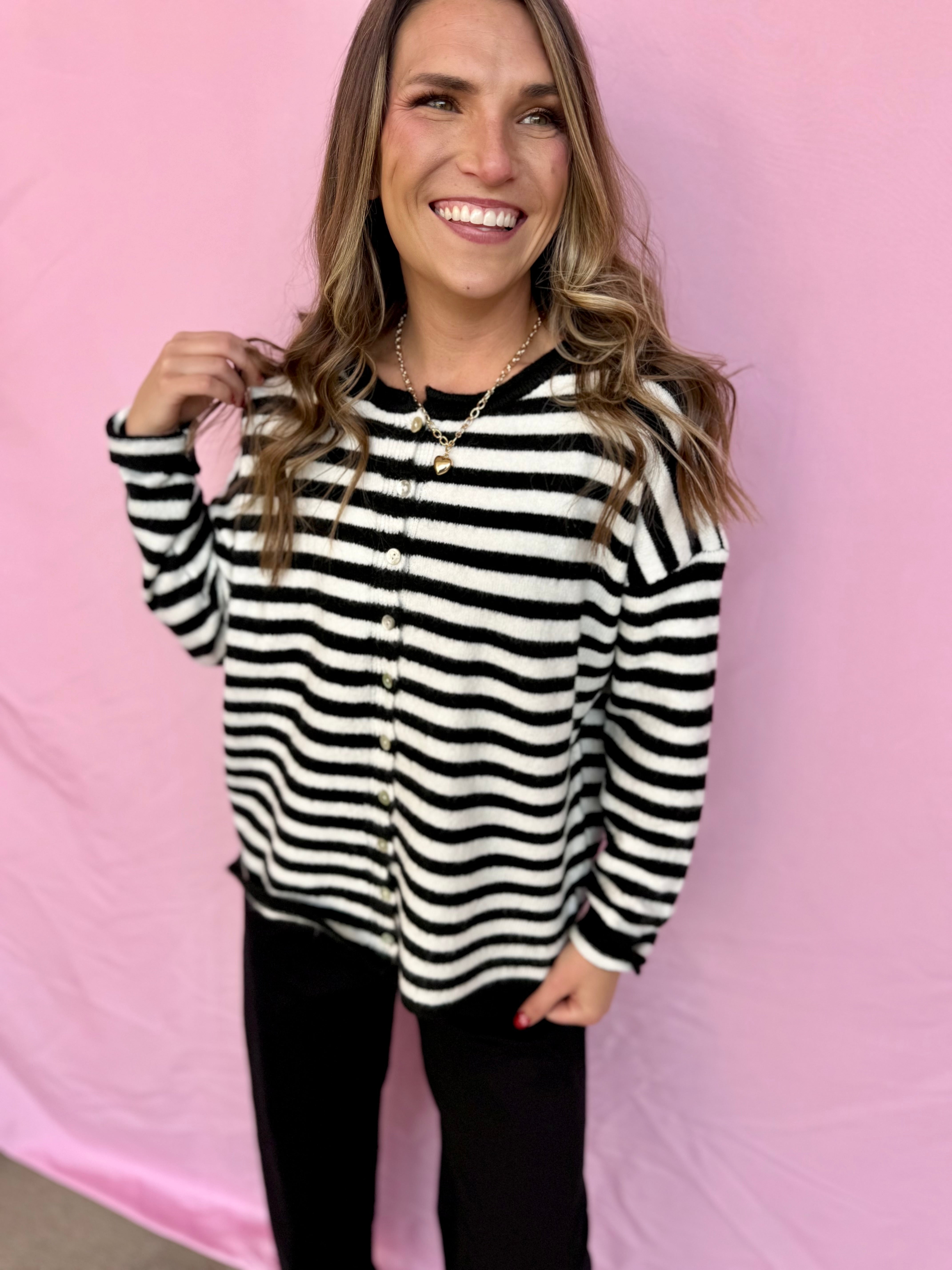 Cozy meets cute in the Stripe Story Cardi! This black and white striped button-up cardigan is your new go-to for layering with a playful twist. Soft, snug, and easy to style, it adds a dash of cheerful charm to any outfit. Perfect for brightening up cool days with sweet simplicity!