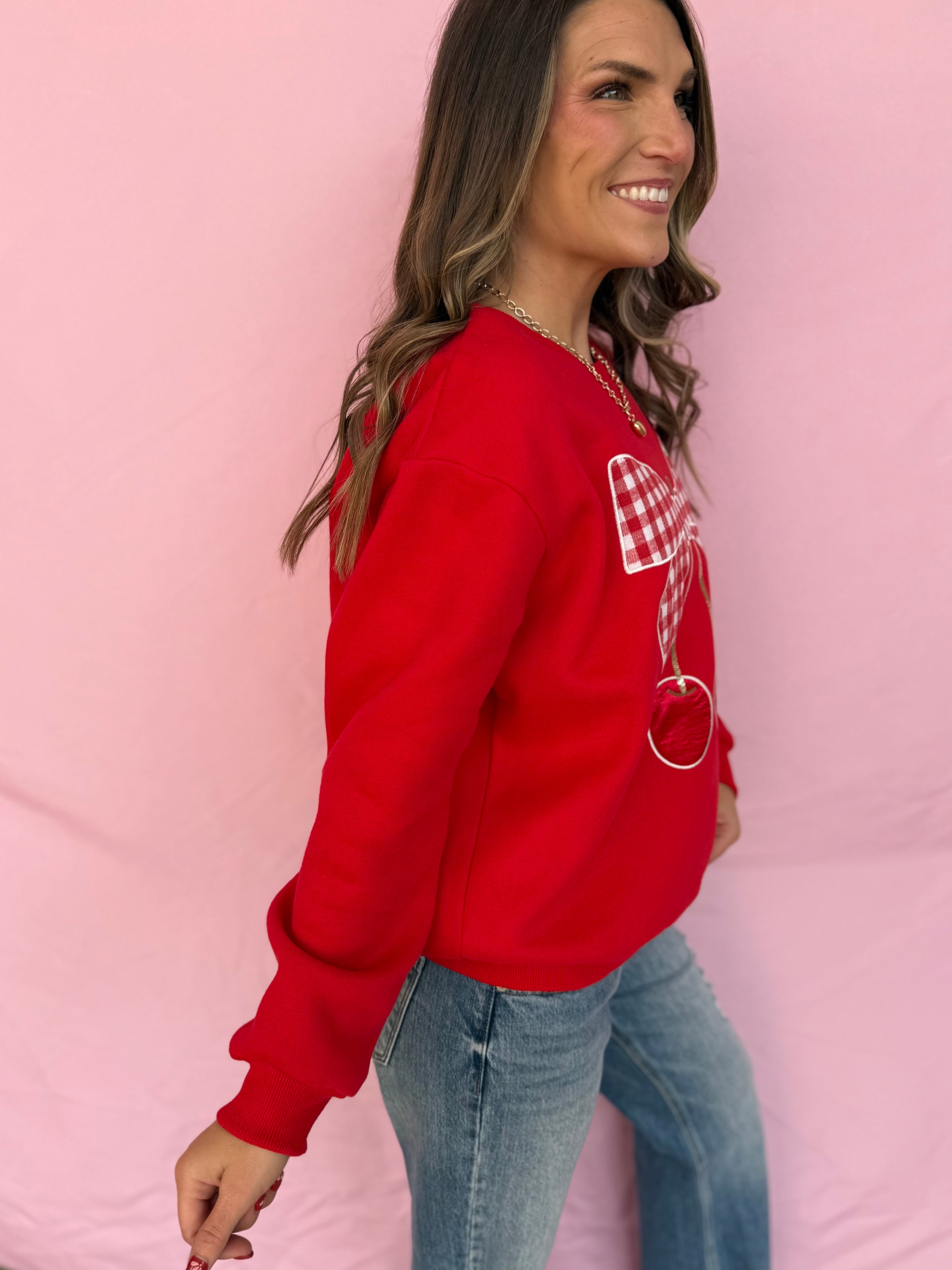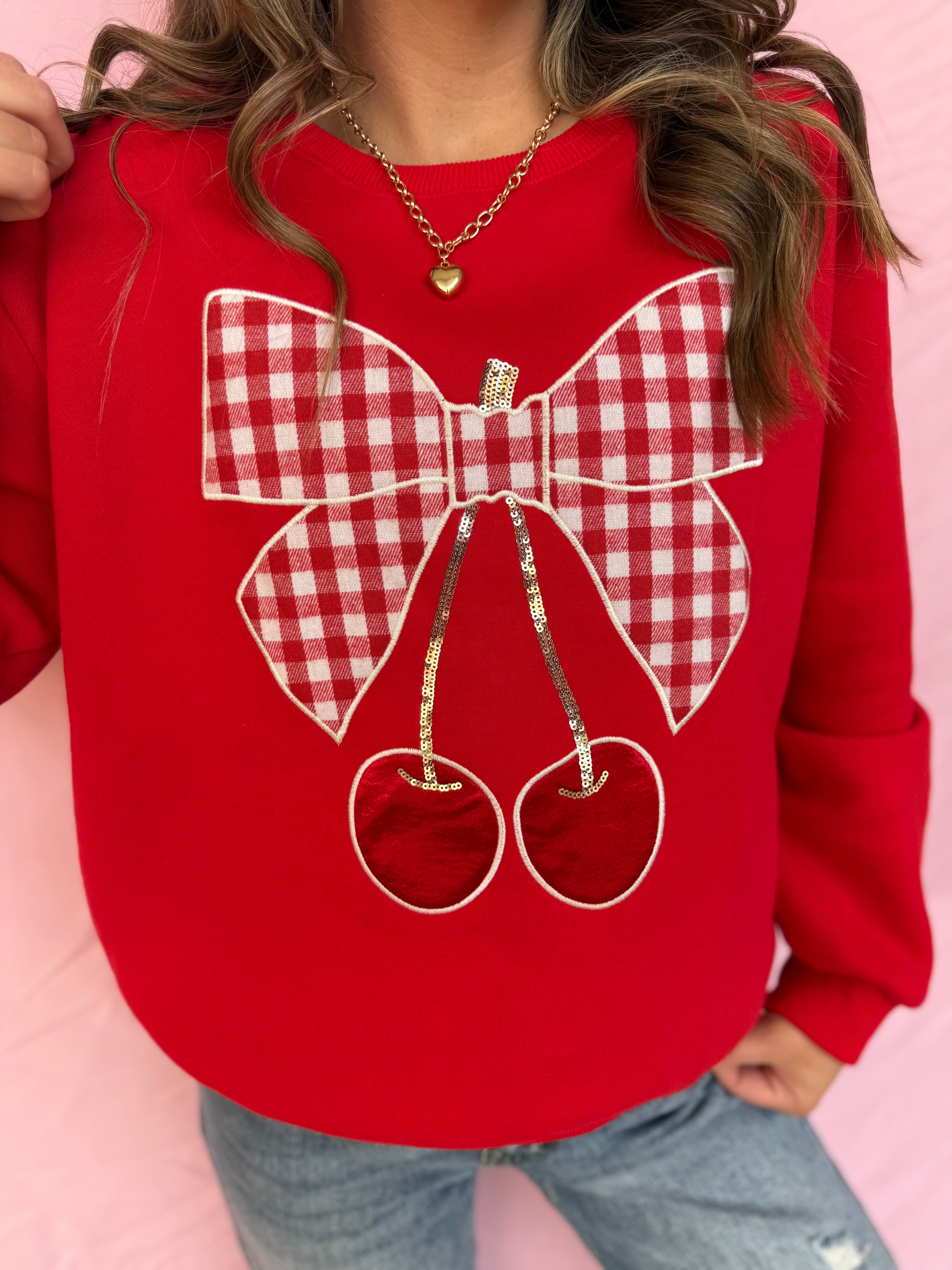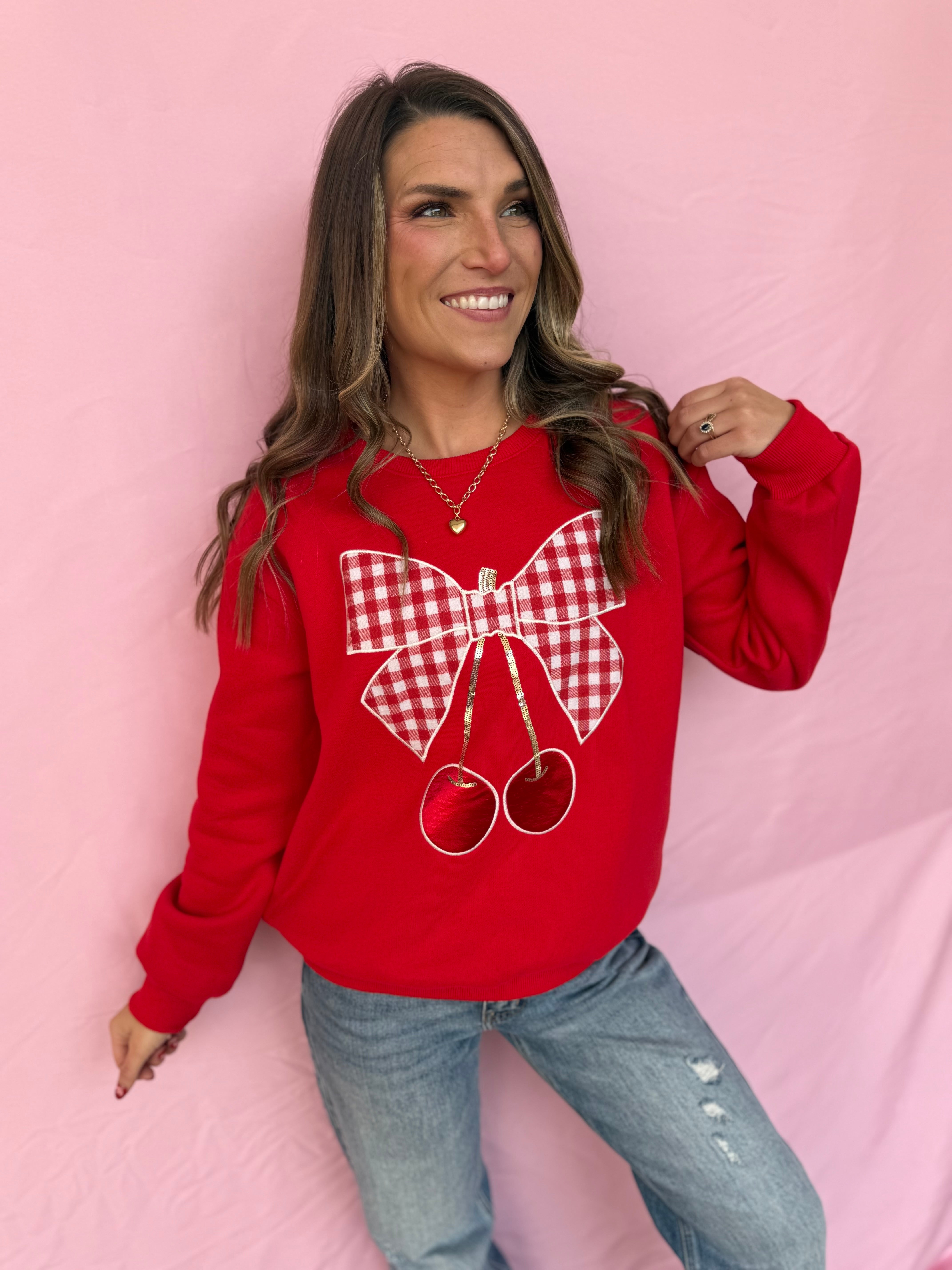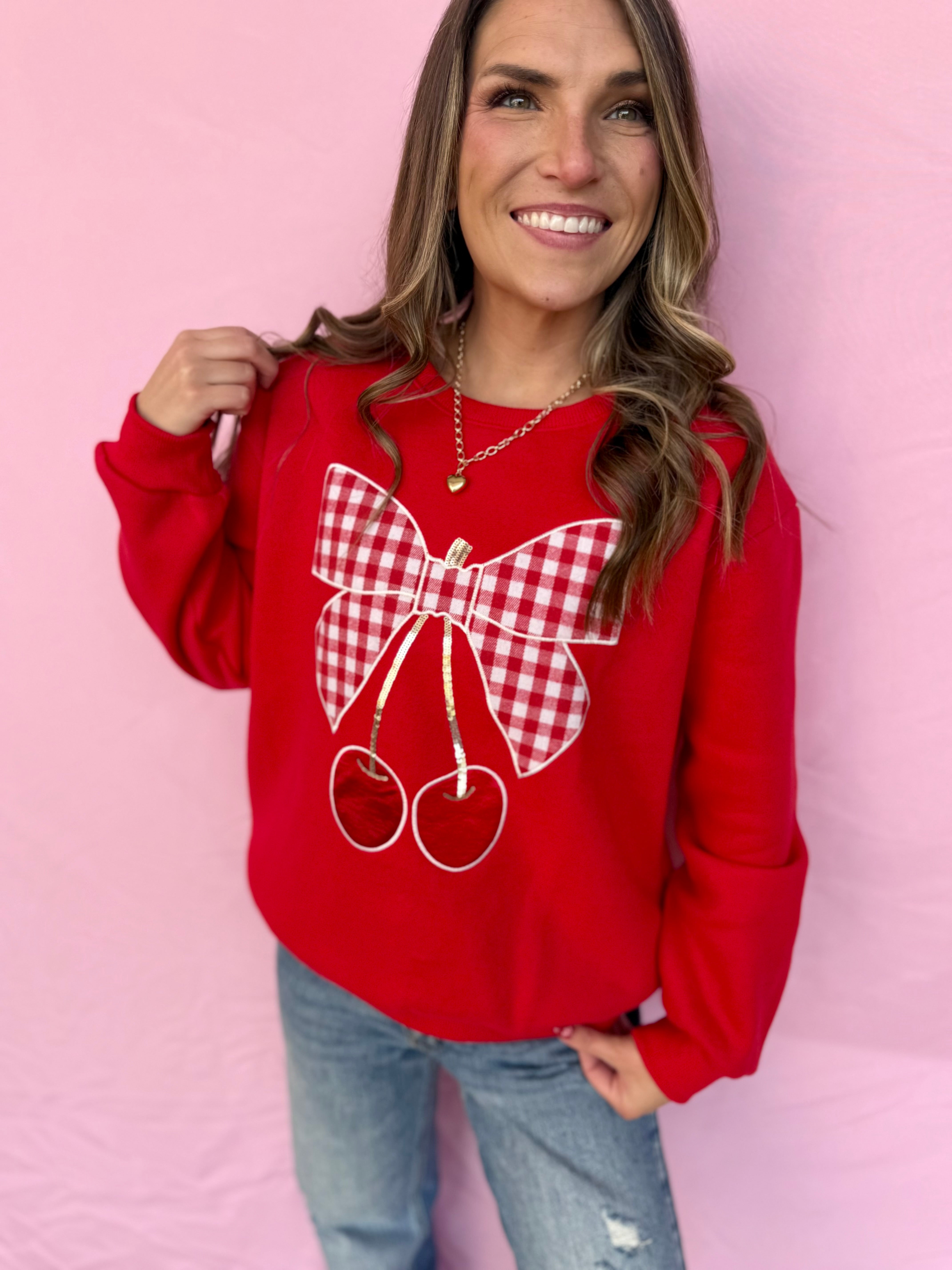 Adorable cherry red crewneck that's bursting with personality! This playful top features charming cherry appliqués and a sweet gingham bow detail that adds just the right amount of whimsy. Perfect for anyone who loves bold colors and fun, feminine touches. Whether you're dressing up for a special occasion or keeping it casual, this piece brings instant joy to your wardrobe. A delightful way to show off your love for all things cute and cheerful!