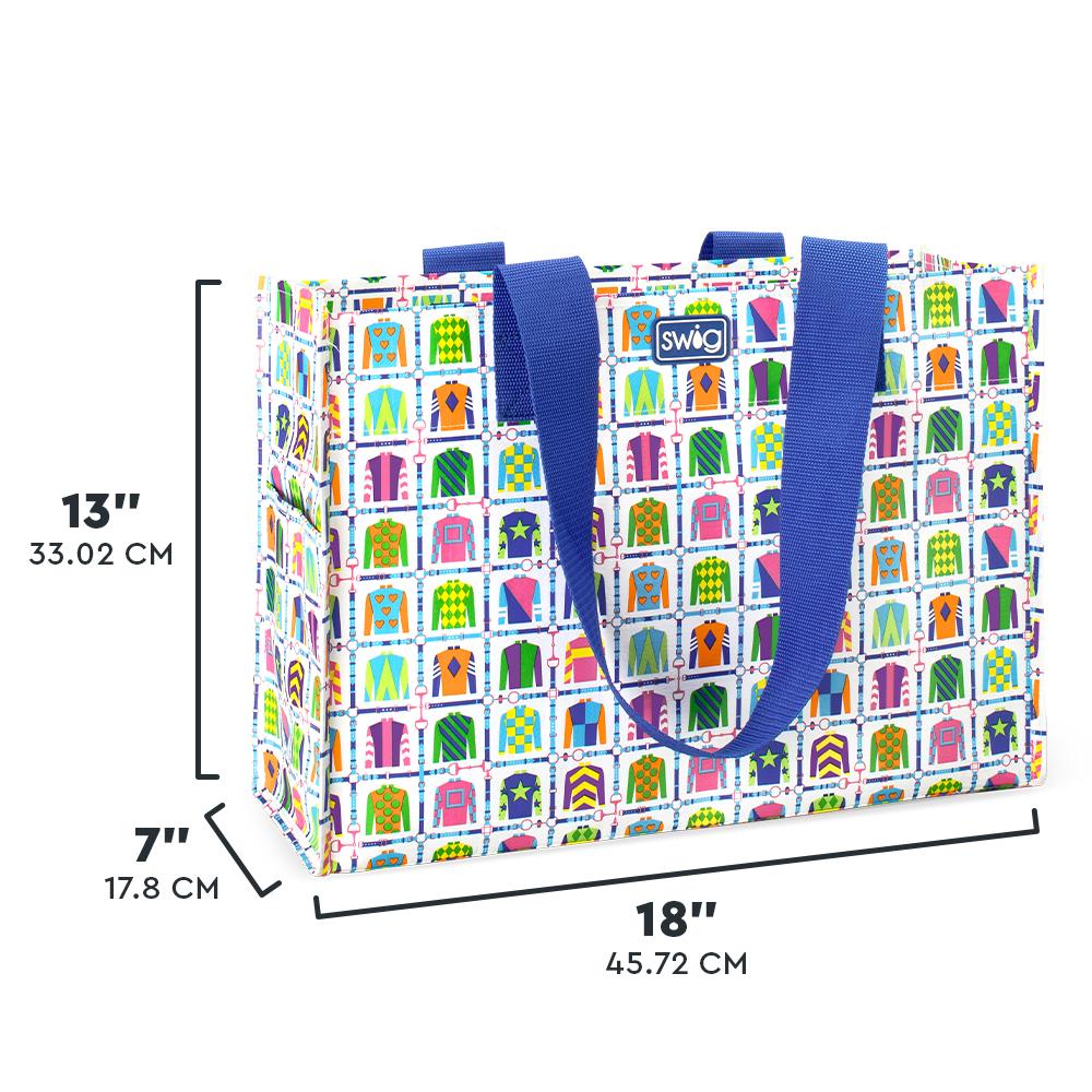 Tote-ally amazing! Place your bets, the jockeys are heading to the starting gate! Celebrate Derby Day with this bright and colorful pattern of jockey silks and bridles on a white background. Swig Life's Reusable Bags are perfect for all of life's celebrations; birthdays, weddings, and holiday parties, and are a go-to favorite for grocery shopping! This reusable bag is made for toting gifts in one quick and easy trip. Its extra-large size is great to reuse for farmer's markets and weekend trips. Features two deep side pockets for grab-and-go essentials.
