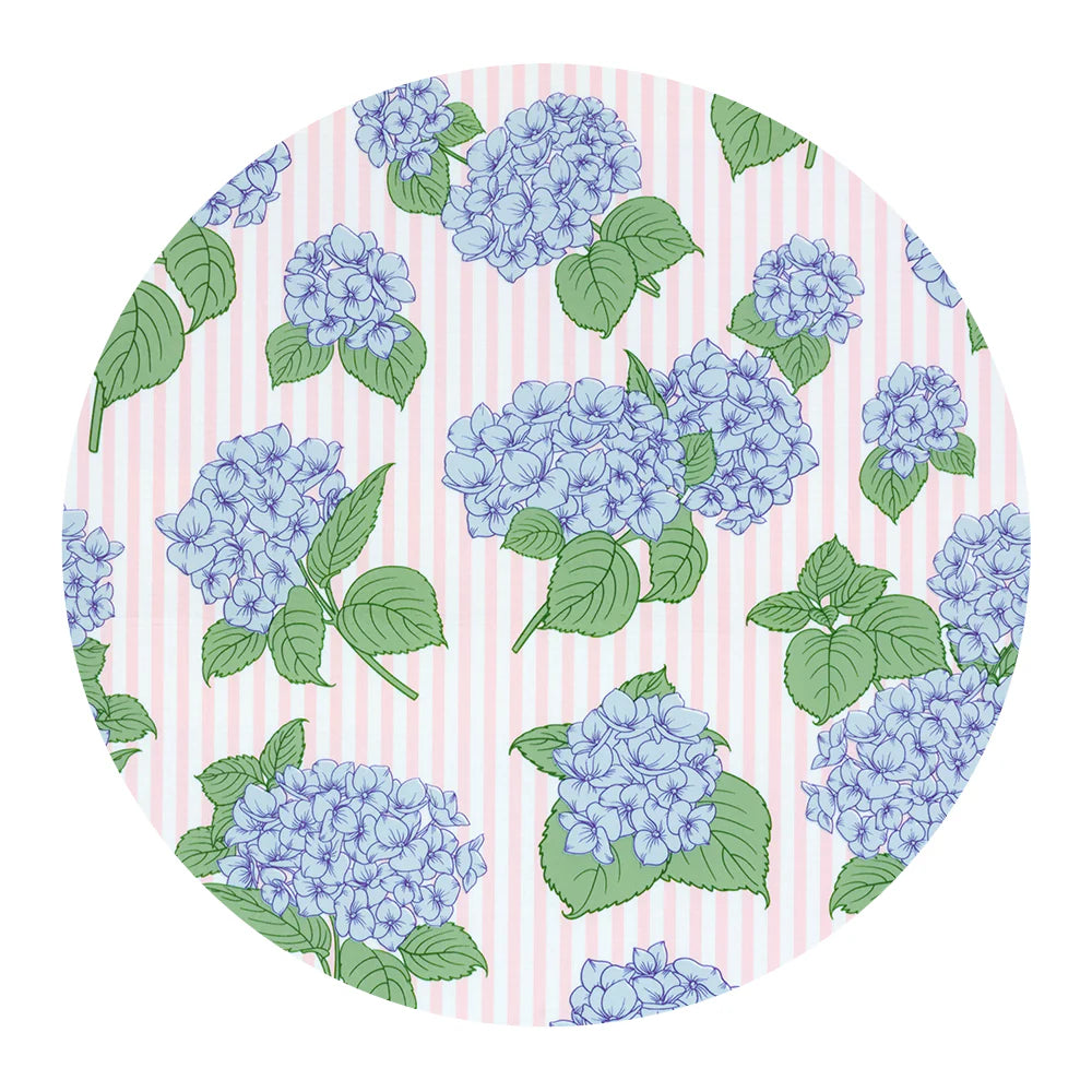 Tote-ally amazing! This print blooms with timeless charm, featuring clusters of soft blue hydrangeas scattered across a delicate blush and white pinstripes background.