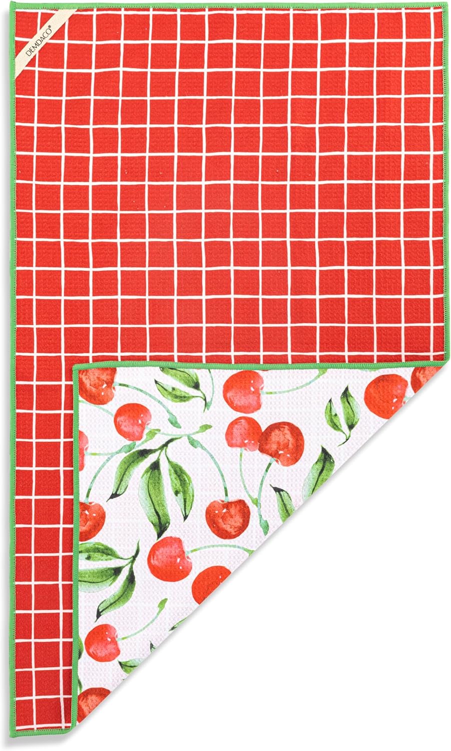- These tea towels are designed to add a touch of comfort and charm to your kitchen or dining space; One side showcases a vibrant pattern of ripe red cherries; Flip it over to reveal a classic red and white grid pattern