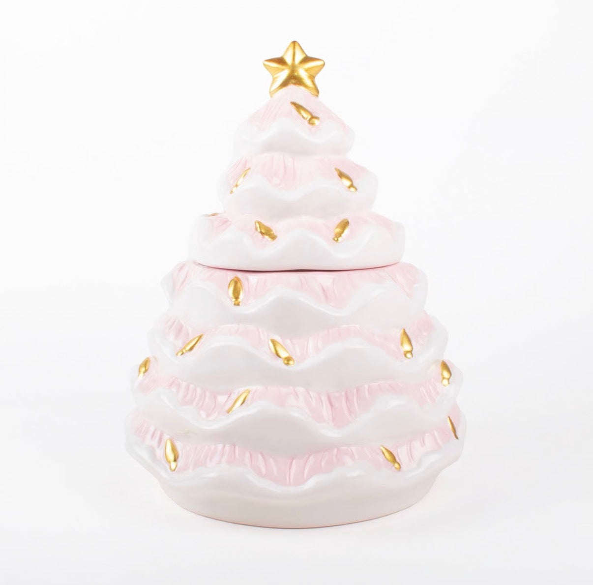 Looking to spruce up your holiday table or kitchen island this season? Our Pink Tree Cookie Jar is the perfect choice! This classic Christmas tree figure with a modern twist is sure to impress and delight all who see it. Crafted from ceramic, this cookie jar features a removable lid & is the perfect size for storing ample amounts of sweet treats. At 12" x 10", it will be the anchor to any buffet table or kitchen island at your upcoming Christmas party. And if you don't have a party planned in your future, use it as a festive planter for some seasonal cheer! Best of all, this piece comes imported but was designed in the USA and is hand wash recommended for lasting results. Let our Pink Tree Cookie Jar be your elegant holiday centerpiece this year.