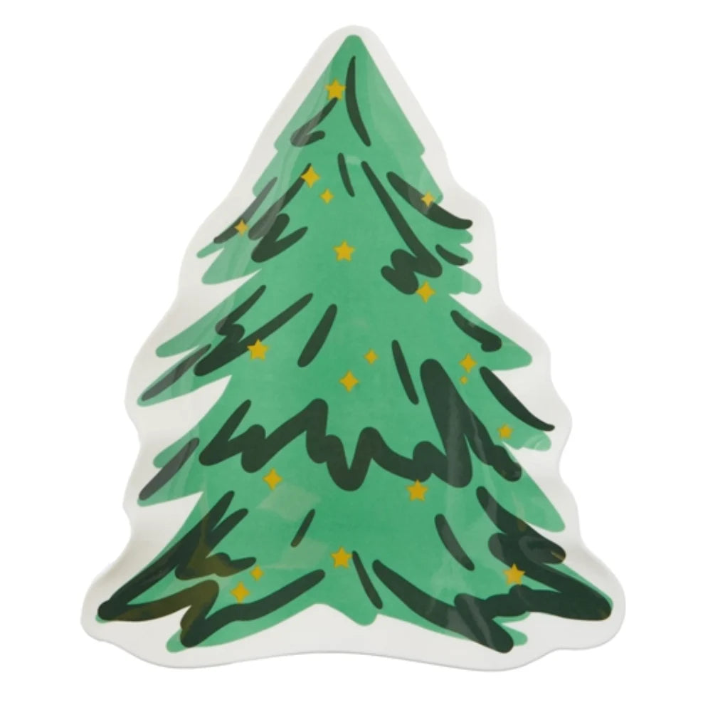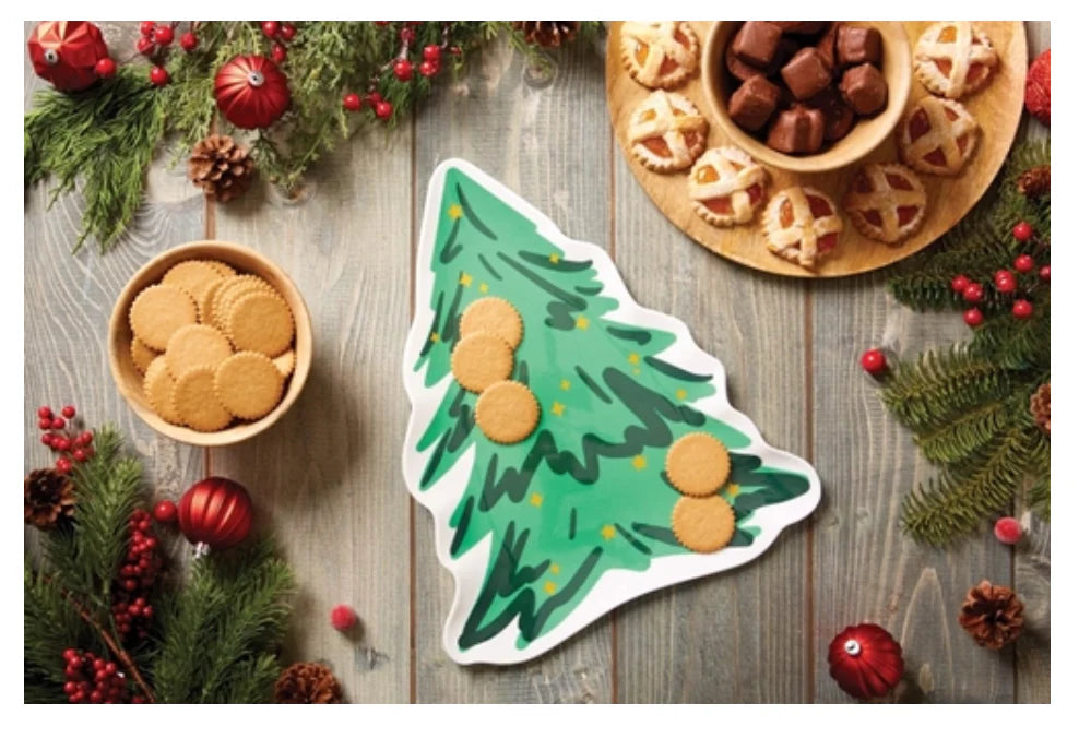 Holiday Trees Melamine Serving Platter. Features metallic gold accents. Upper dishwasher safe, but hand wash is recommended. Not suitable for microwave use. BPA-free. Coordinates with our Holiday Trees paper tableware collection.