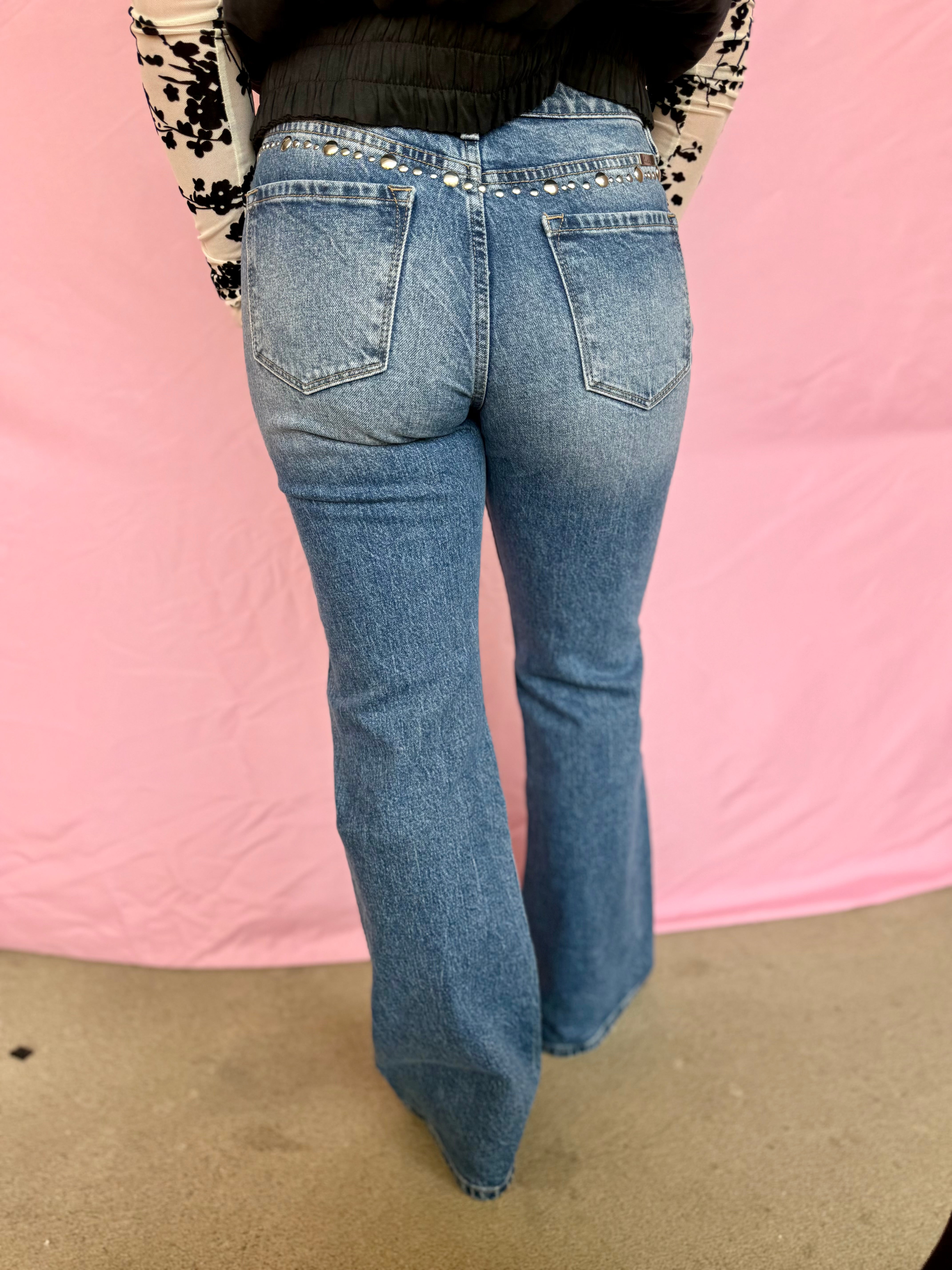 Step into style with our Lynn Wide Flare Jeans, featuring a trendy mid-rise fit that flatters every figure. Embellished with charming studs, these jeans add a playful sparkle to your everyday look. The wide flare design creates a fun, breezy vibe perfect for dancing through your day with confidence and flair!