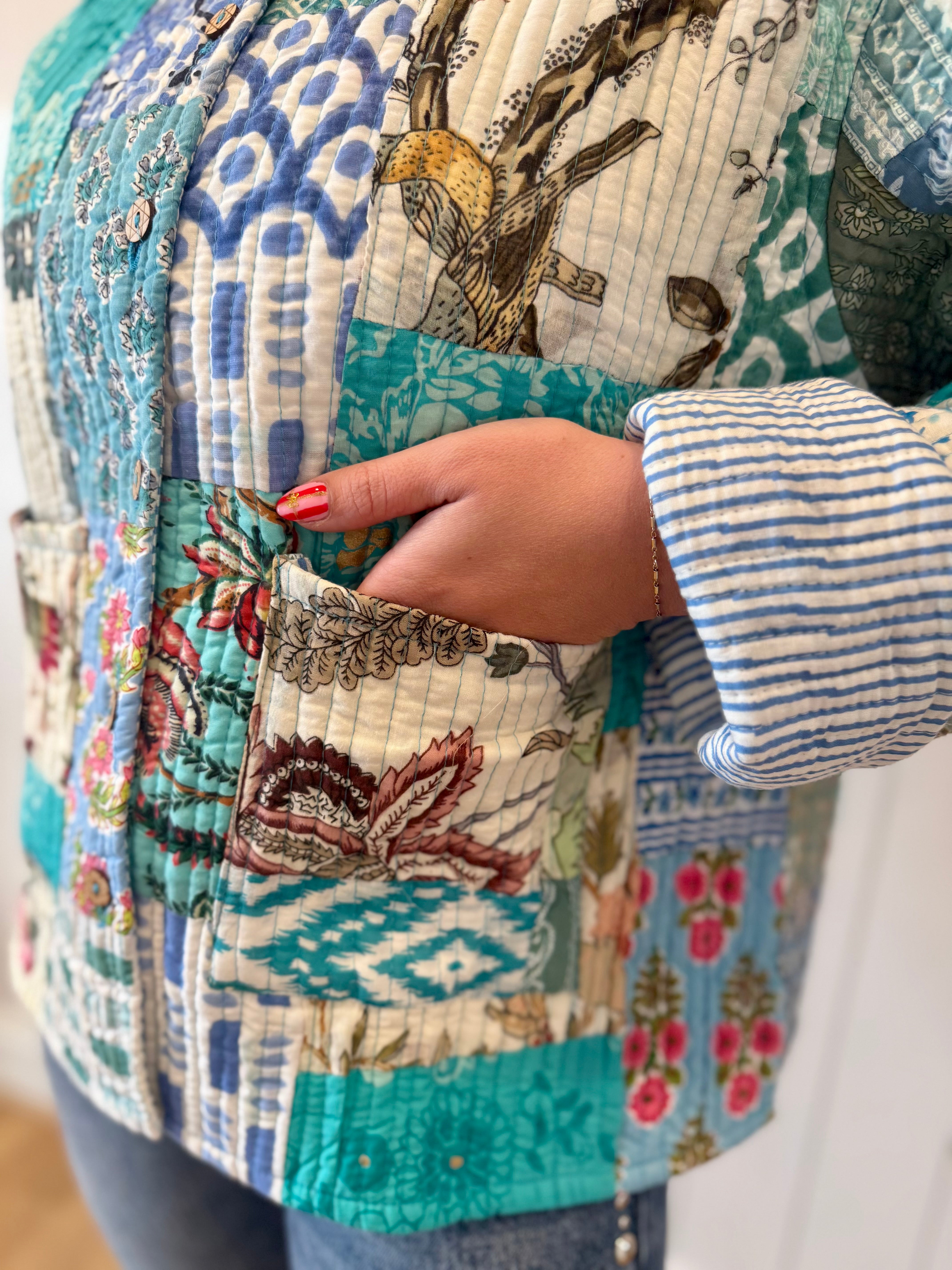 Get ready to love this adorable blue patchwork quilted button-up jacket! With its charming patchwork design and cozy quilted texture, this jacket is bursting with personality and style. The fun striped lining adds an extra surprise when you open it up, making every wear feel special. Perfect for layering over your favorite outfits, this jacket keeps you warm while adding that perfect pop of whimsy to your wardrobe. Whether you're heading out for an adventure or just want to feel extra cute and cozy, this patchwork beauty is your new must-have piece!
