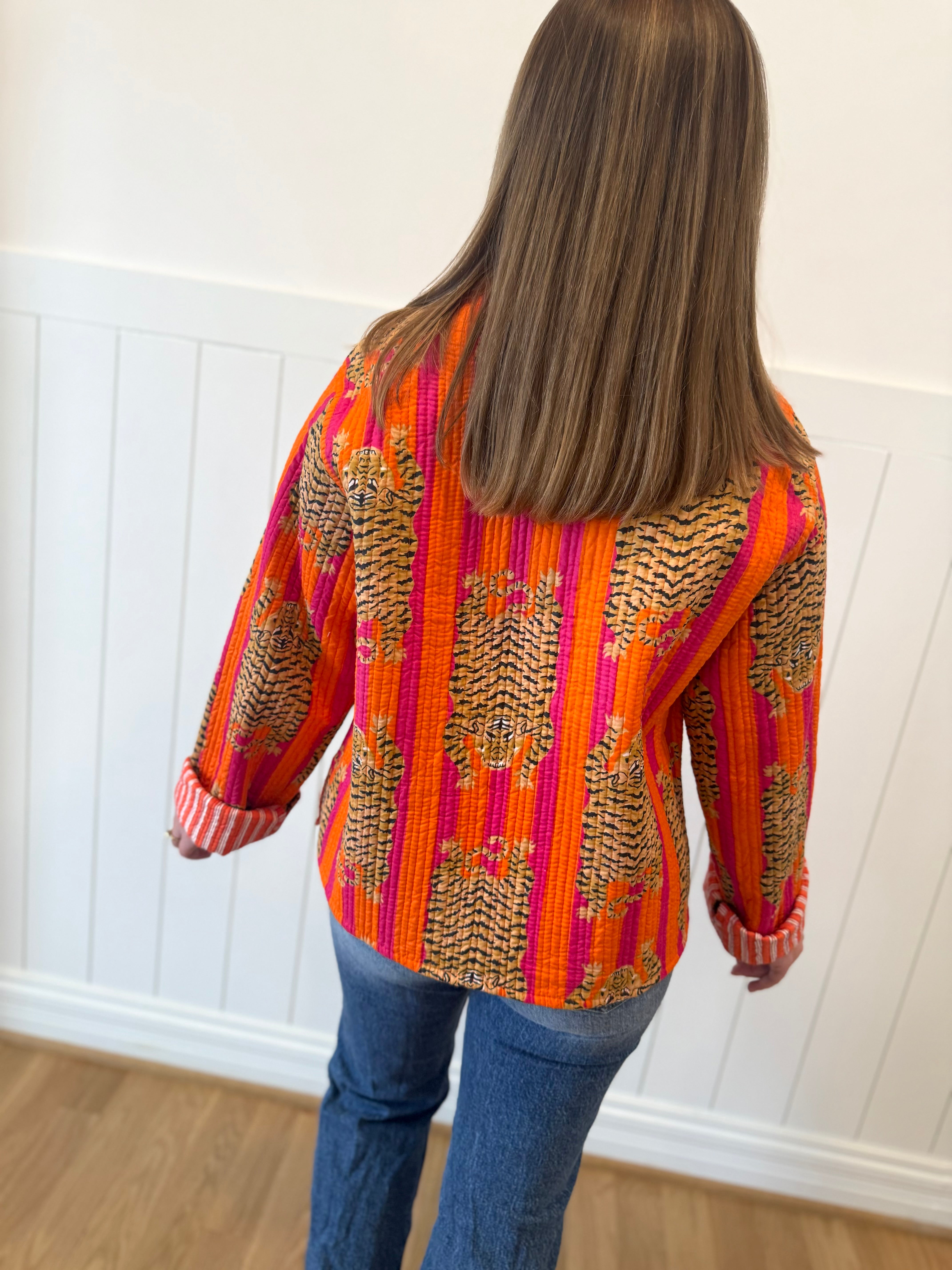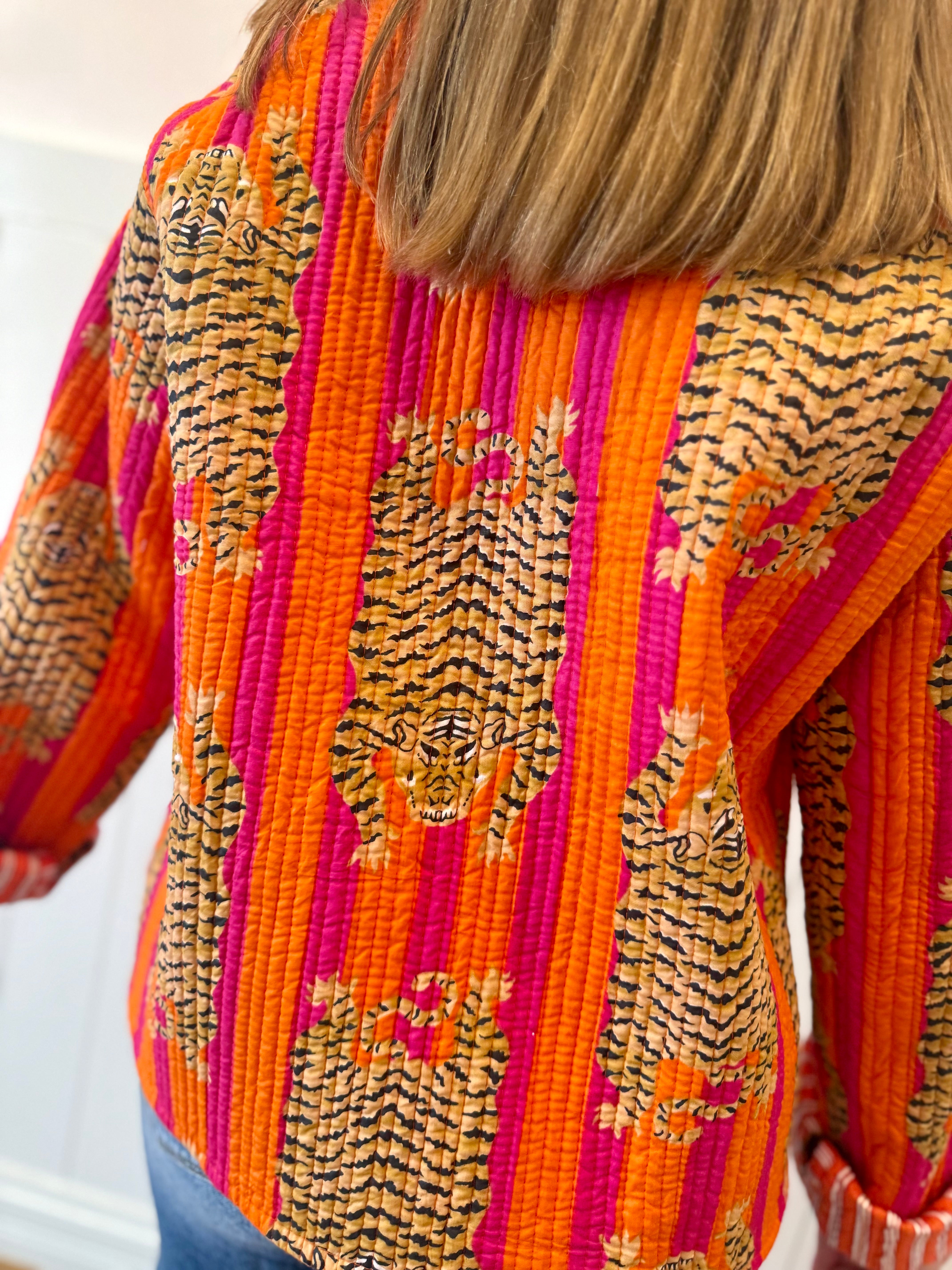 Make a bold statement with this playful orange striped tiger quilted jacket! Featuring eye-catching tiger stripes and a cozy quilted design, this jacket is perfect for adding personality and warmth to your cold-weather wardrobe. The lightweight quilting keeps you snug without the bulk, while the vibrant orange hue brings instant fun and flair to any outfit. Whether you're heading out for an adventure or just want to turn heads around town, this jacket is your ticket to looking absolutely fabulous and feeling totally comfortable!