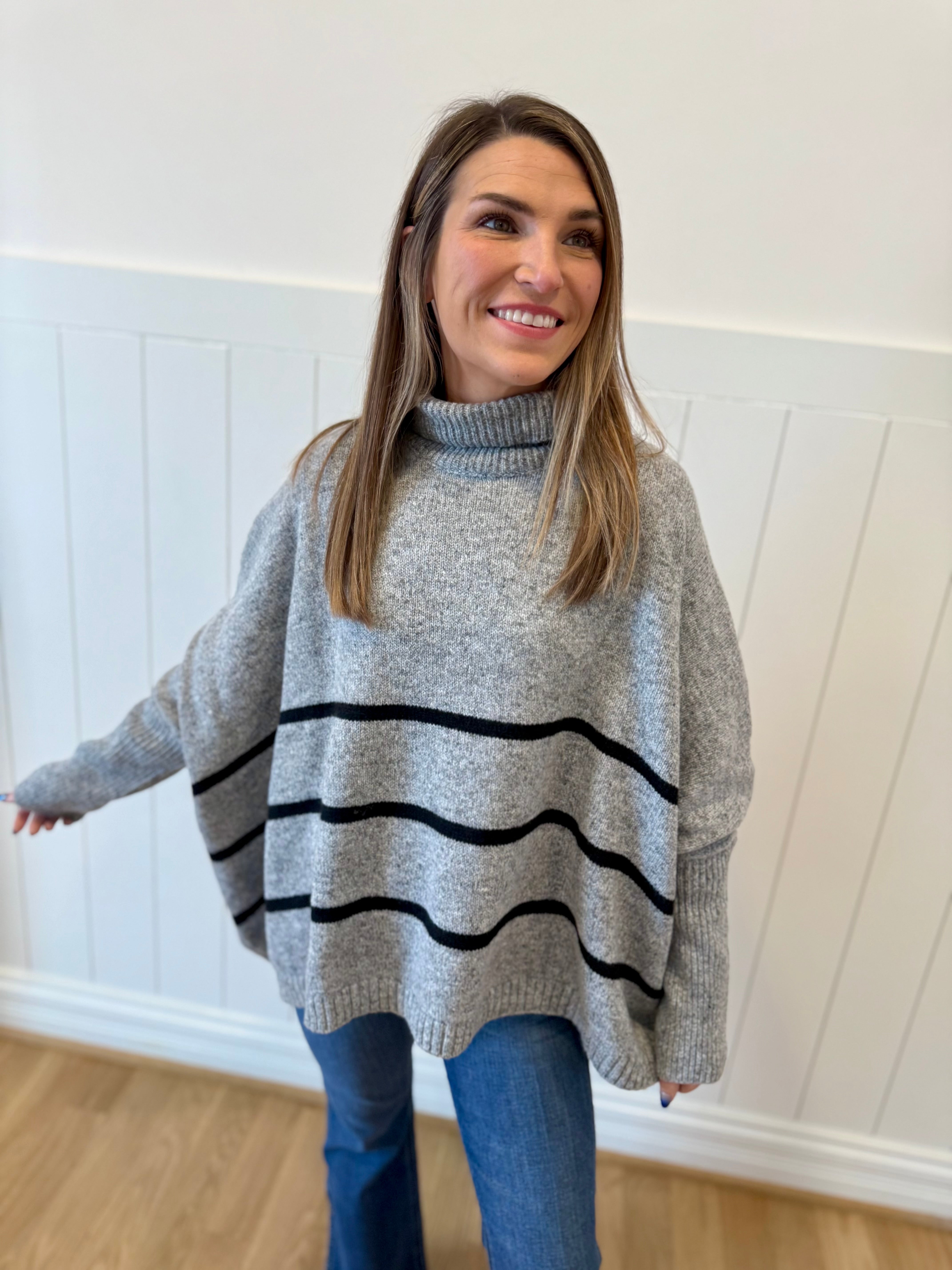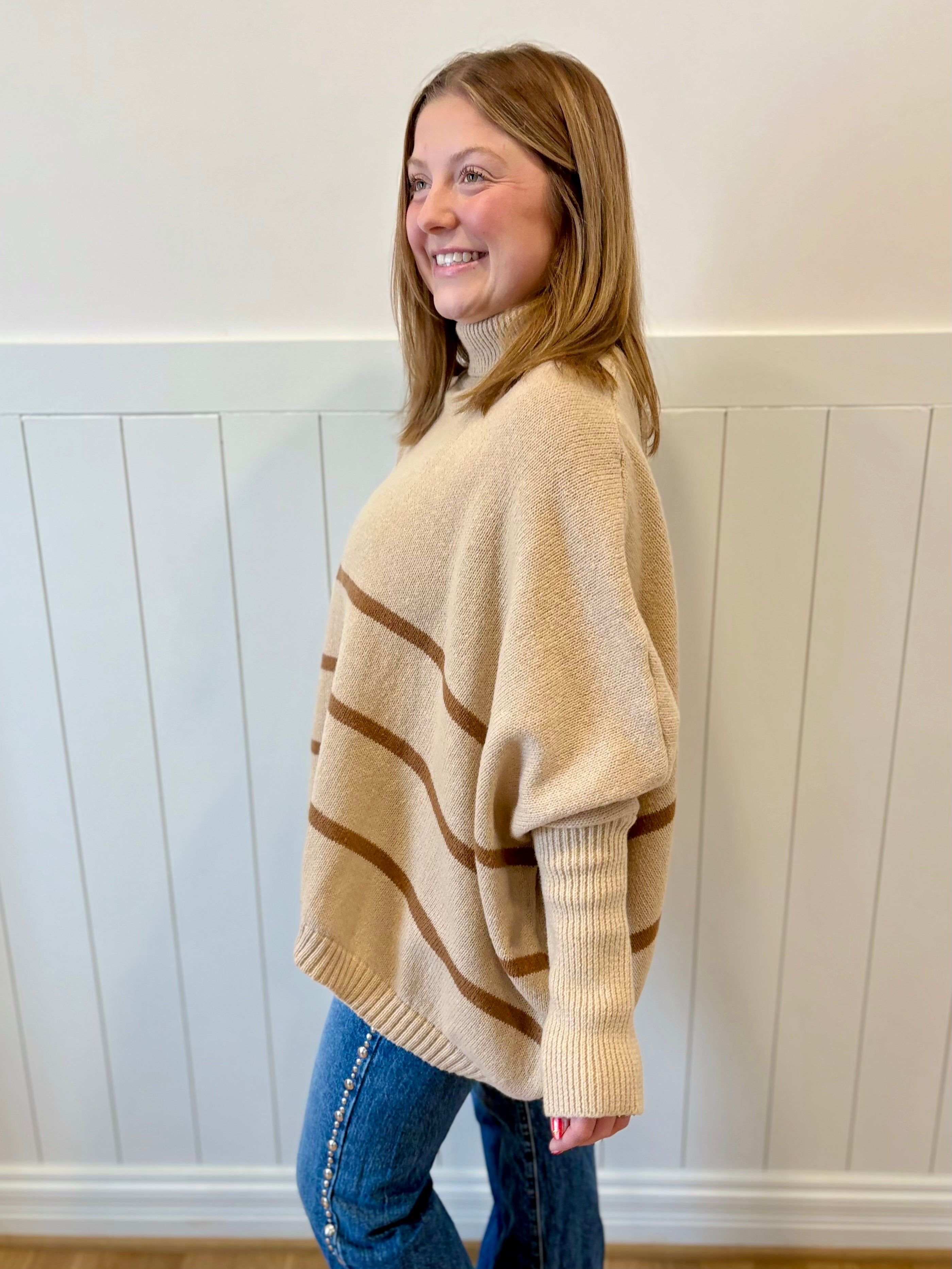 Say hello to your new wardrobe essential—this adorable striped oversized mock neck sweater! With its playful stripe pattern and relaxed fit, this top brings effortless charm to every day. The mock neck keeps things polished while the generous silhouette lets you move freely and stay comfy. Layer it over your favorite tee, pair it with leggings, or wear it solo for that perfectly put-together look. This sweater is your ticket to looking cute and feeling cozy, no matter what the day brings!