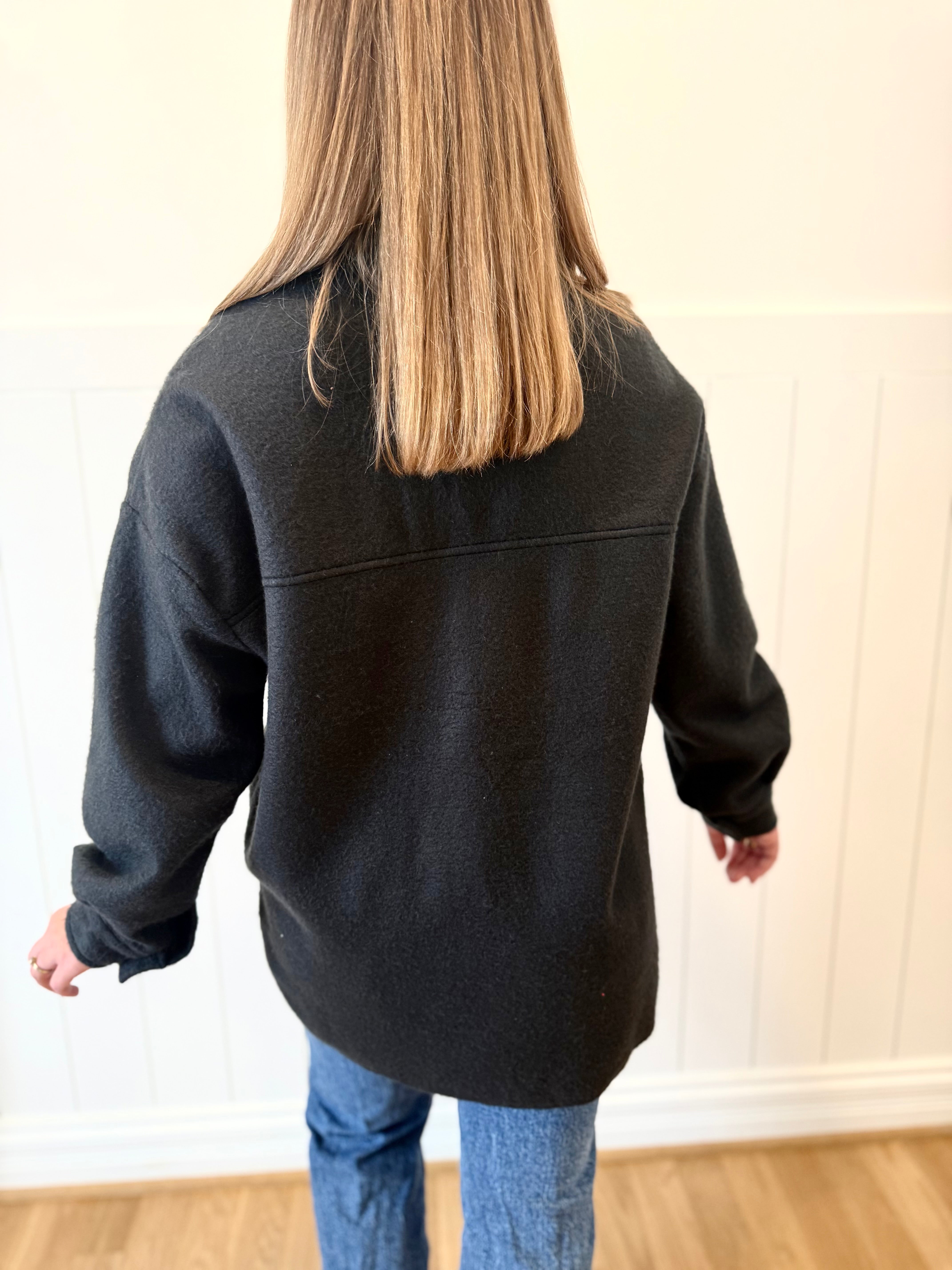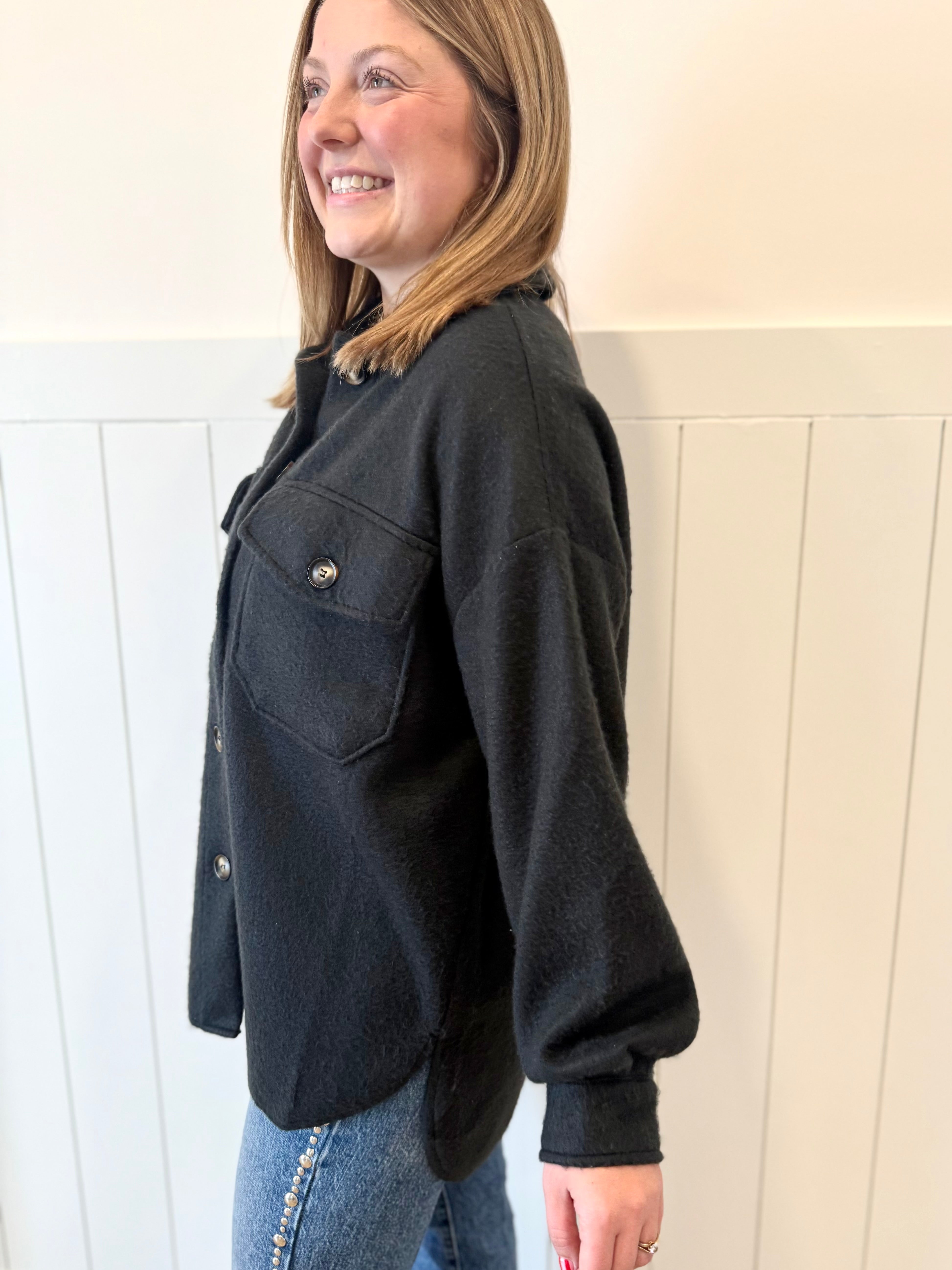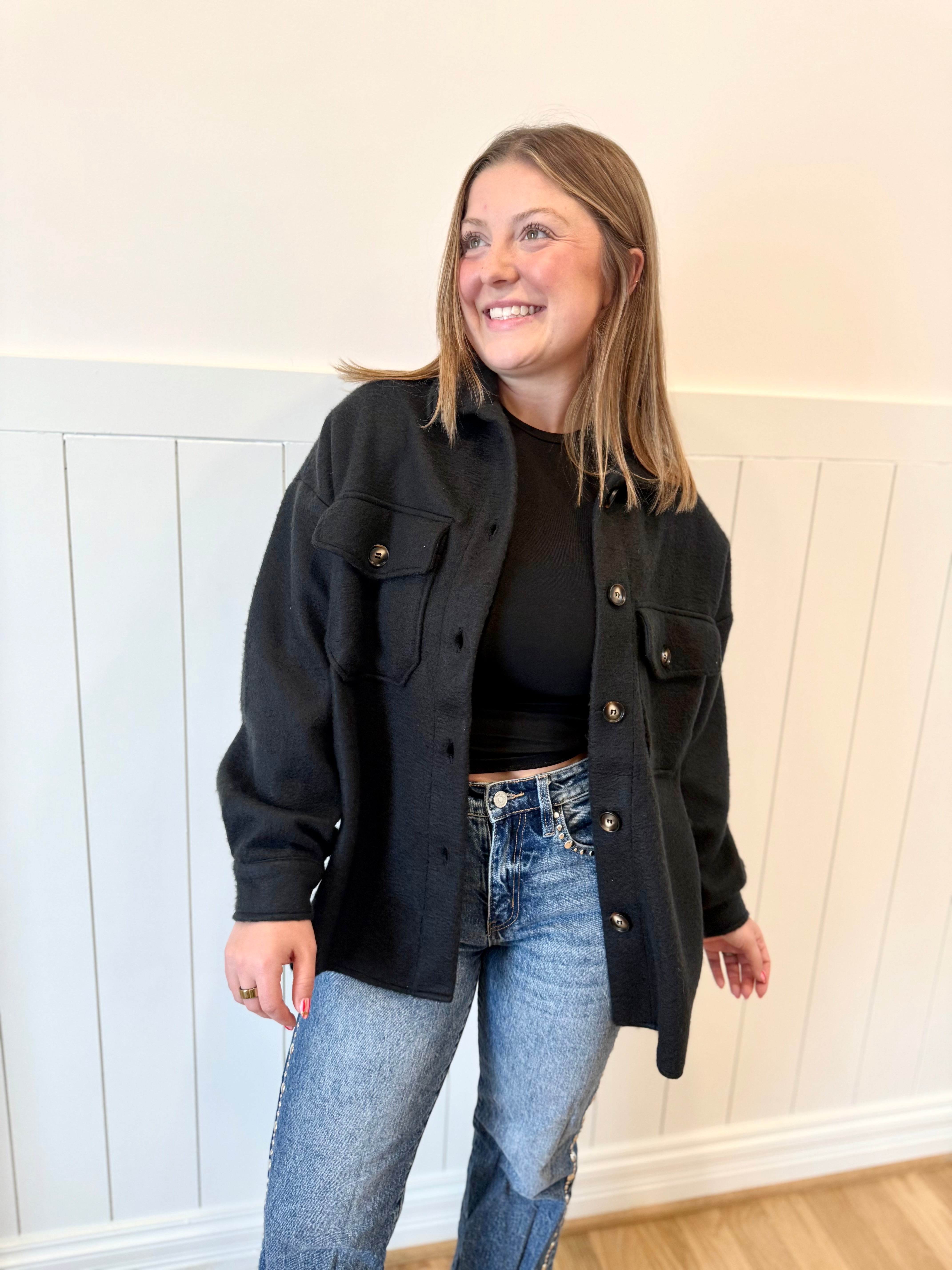 Meet your new favorite layering piece—this fabulous black oversized button-up shacket! With its relaxed, roomy fit and classic black color, this shacket is the ultimate versatile essential that works with literally everything. Button it up for a polished look or wear it open over your favorite tee for effortless cool-girl vibes. Whether you're grabbing coffee, heading to work, or just want to add an extra layer of style to your outfit, this shacket delivers comfort and chic in one adorable package. You're going to reach for this beauty again and again!