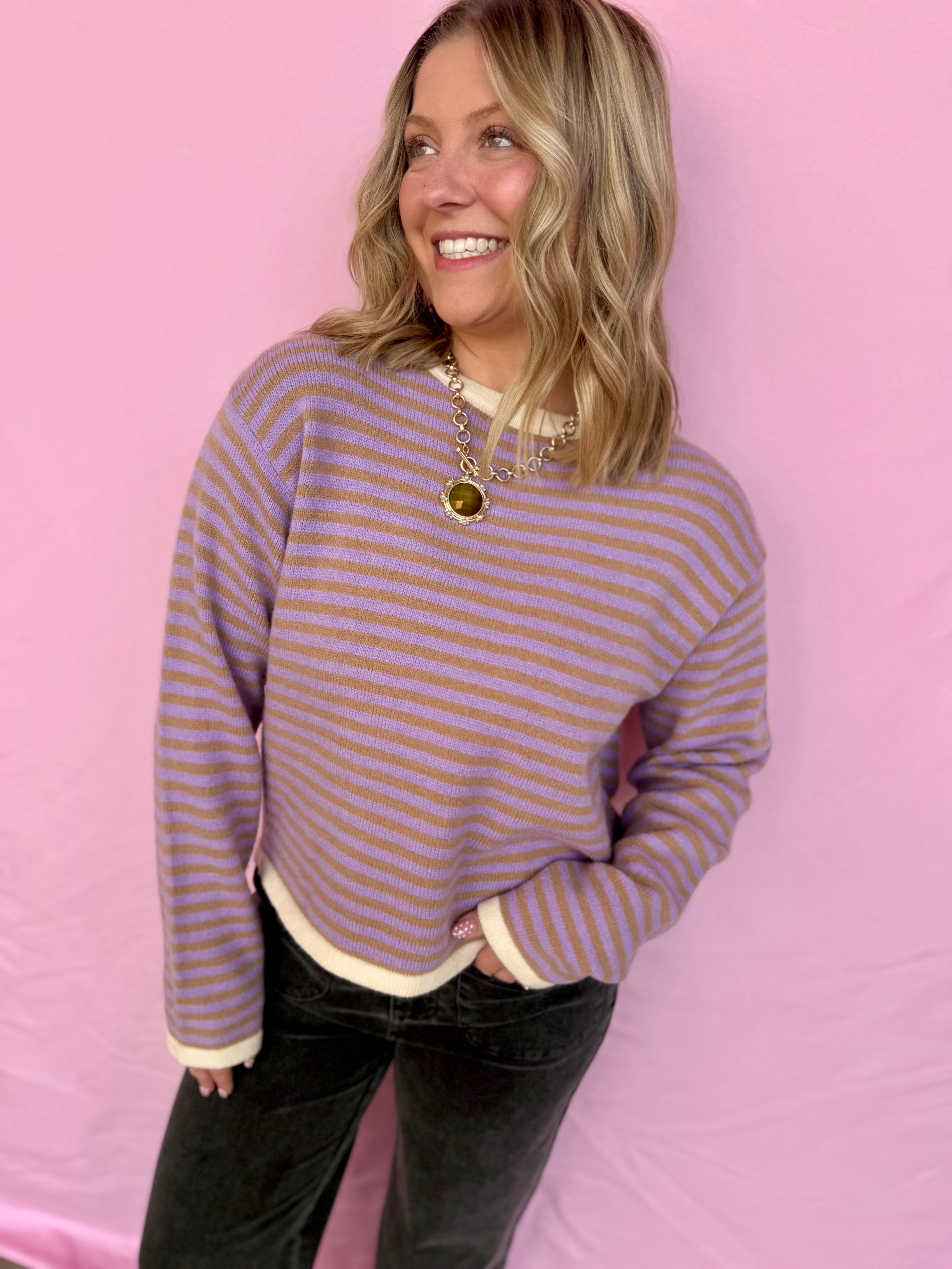 Add a pop of charm to your weekend wardrobe with the Weekend Plans Sweater! This striped cropped sweater, available in soft lavender and warm taupe, brings cozy comfort and playful style together. Its flattering cropped fit pairs perfectly with your favorite jeans or skirts, making it the sweetest choice for relaxing days and casual outings.