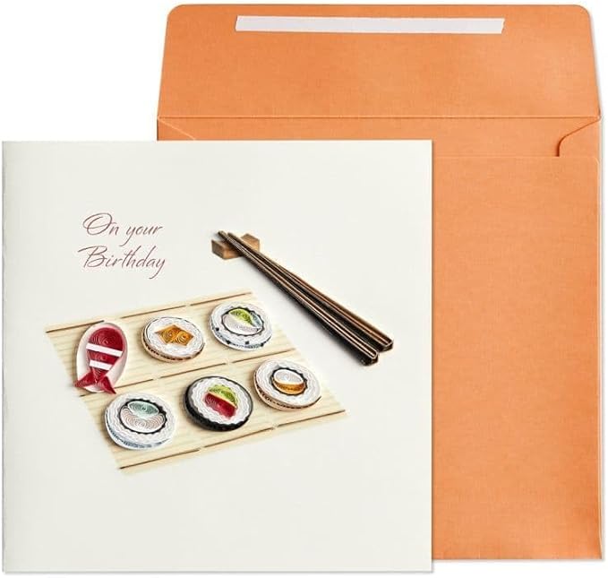 - Front features beautifully detailed and life-like sushi and chopsticks handmade with paper filigree. Front message: "On your Birthday", Inside sentiment: "Wishing you an amazing birthday in every way!"