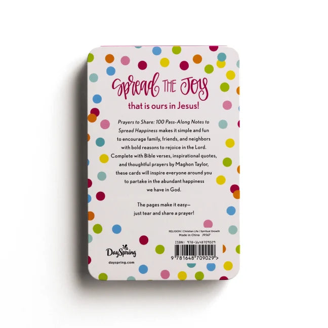 A delightful addition to DaySpring's popular Prayers to Share Series, these notes make it effortless to spread contagious happiness to the world around you. It is the perfect way to share the joy that is ours in Jesus! Prayers to Share: 100 Pass-Along Notes to Spread Happiness makes it simple and fun to encourage family, friends, neighbors, and acquaintances with bold reasons to rejoice in the Lord during the busyness of life. Complete with Bible Verses, inspirational positivity affirmations, and thoughtful prayers from Maghon Taylor, these prayer cards will inspire everyone around you to celebrate the abundant happiness, we have in God. These pages make it easy, just tear and share a prayer.