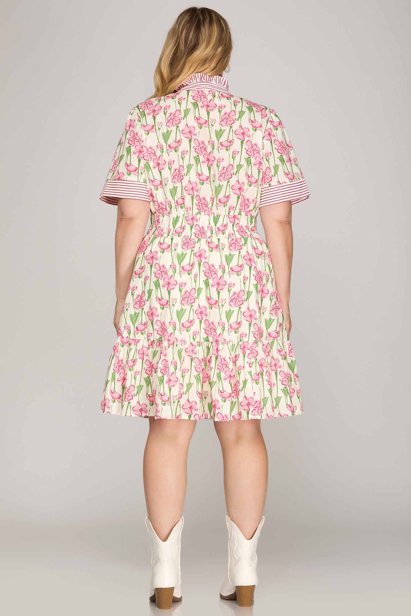 Twirl into spring with this adorable floral mini dress that's bursting with personality! Featuring a charming contrast ruffle neckline and playful half sleeves, this woven beauty celebrates curves with a flattering elastic waistband. The cheerful floral print brings instant joy to your wardrobe, while hidden pockets keep your essentials close. Perfect for brunch dates, garden parties, or whenever you want to feel like the best version of yourself. Comfort meets style in this delightful everyday dress that makes you smile every time you wear it.