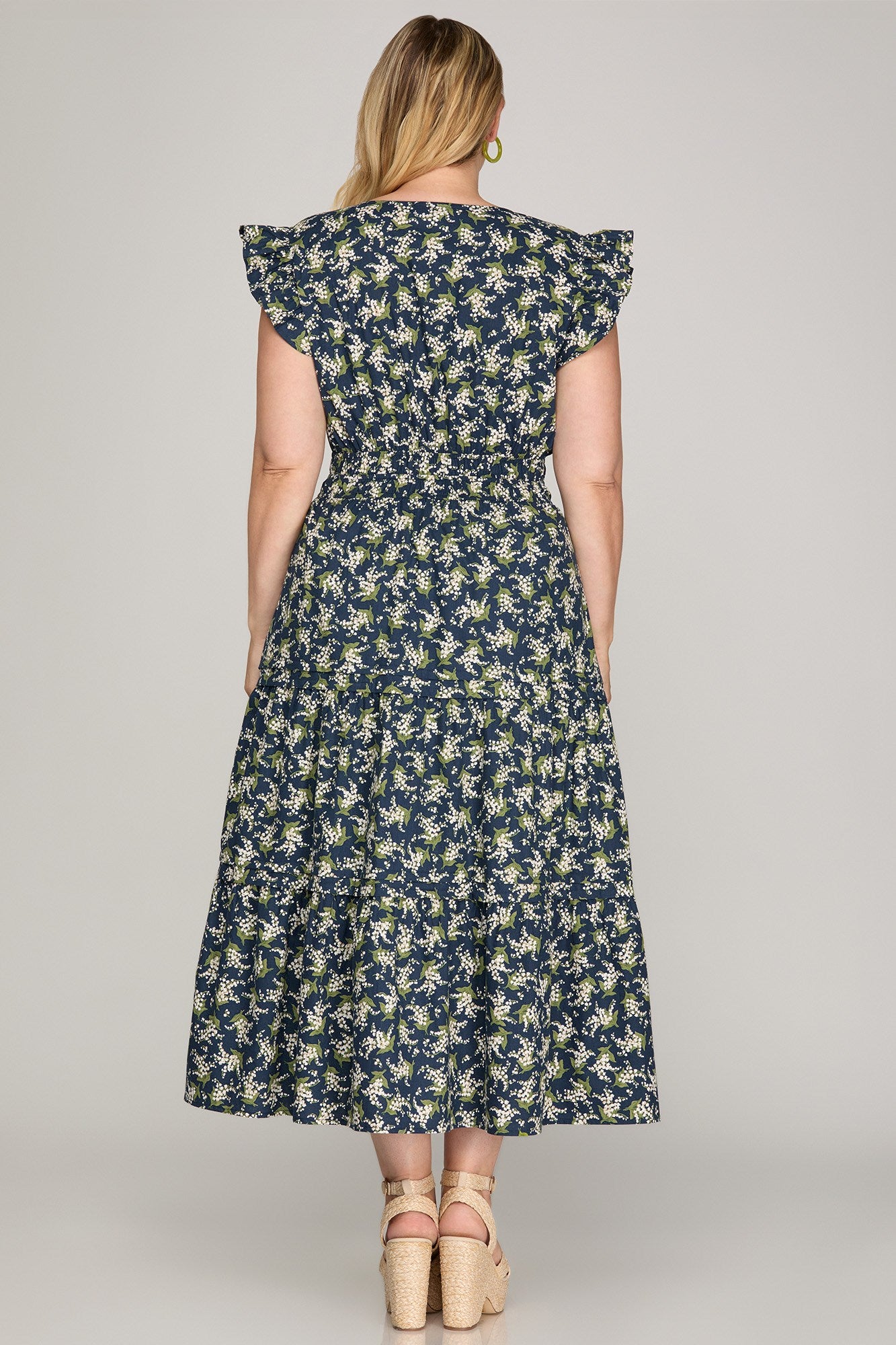 PLUS - RUFFLE SLEEVE FLORAL WOVEN PRINT TIERED DRESS WITH POCKETS