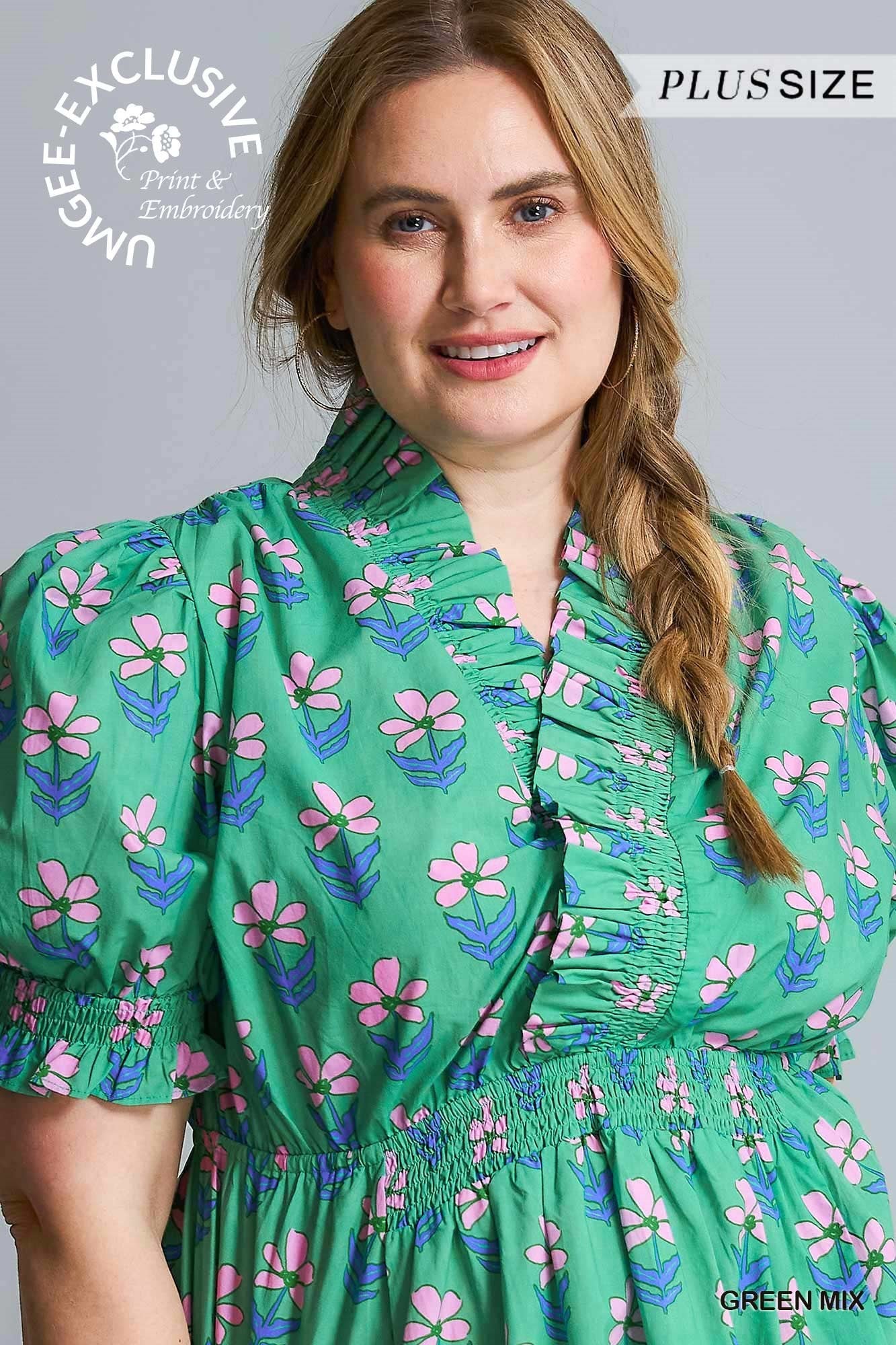 The Perfectly Placed Dress for curvy figures features a playful babydoll silhouette adorned with delicate floral ruffles. Its sweet and bubbly design offers a flattering, flowy fit that moves with you, making it perfect for sunny days and cheerful occasions. Embrace effortless charm and comfort in this delightful dress.