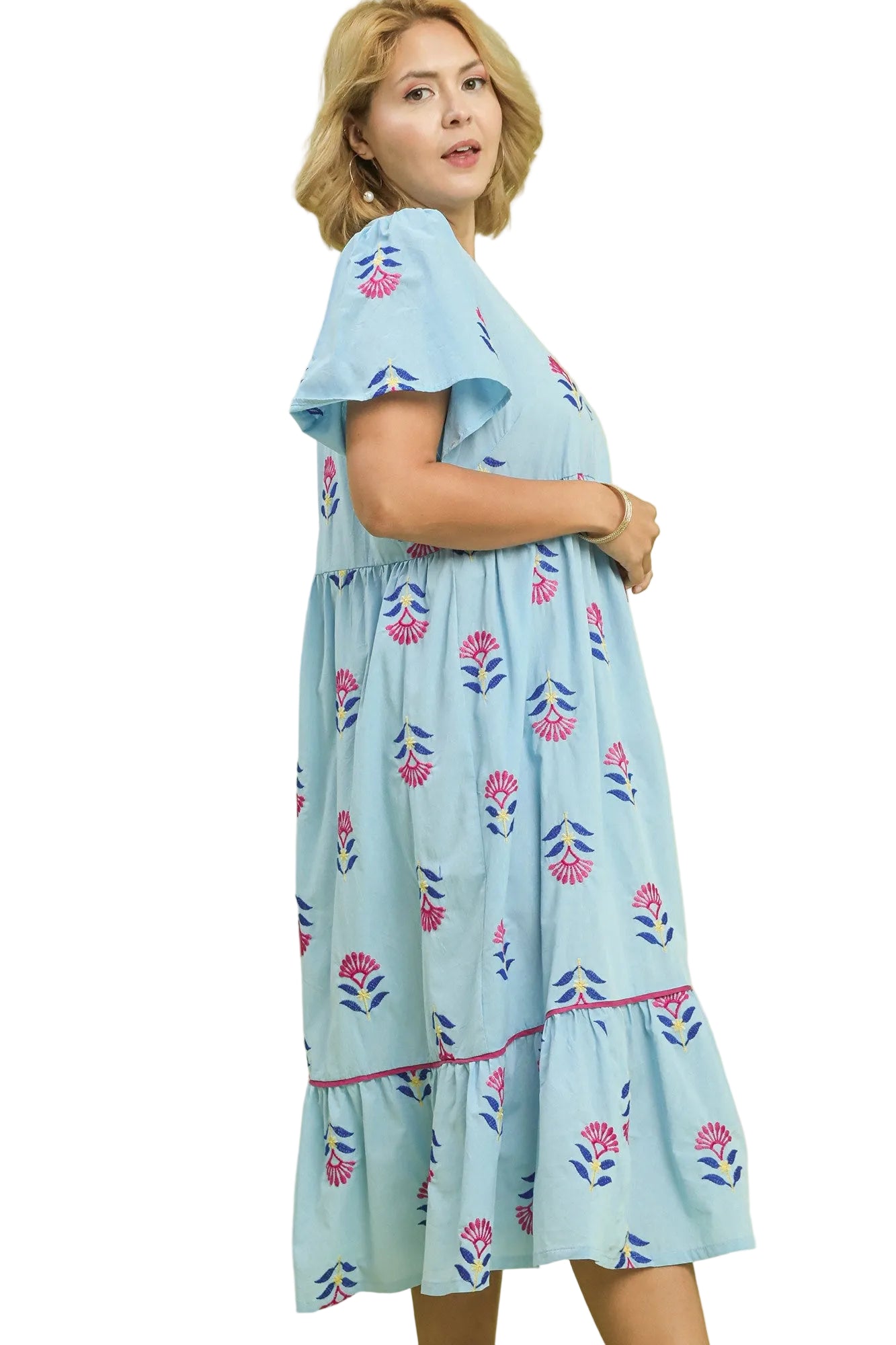Take action and own your style in the Taking Action Dress, a gorgeous tiered midi that celebrates your curves! Featuring delicate embroidered details that add artisanal charm, this dress combines elegance with comfort in the most wonderful way. The layered tiered design creates beautiful movement and dimension while flattering your silhouette perfectly. From brunch to evening events, this dress empowers you to feel confident, gorgeous, and ready to conquer anything!
