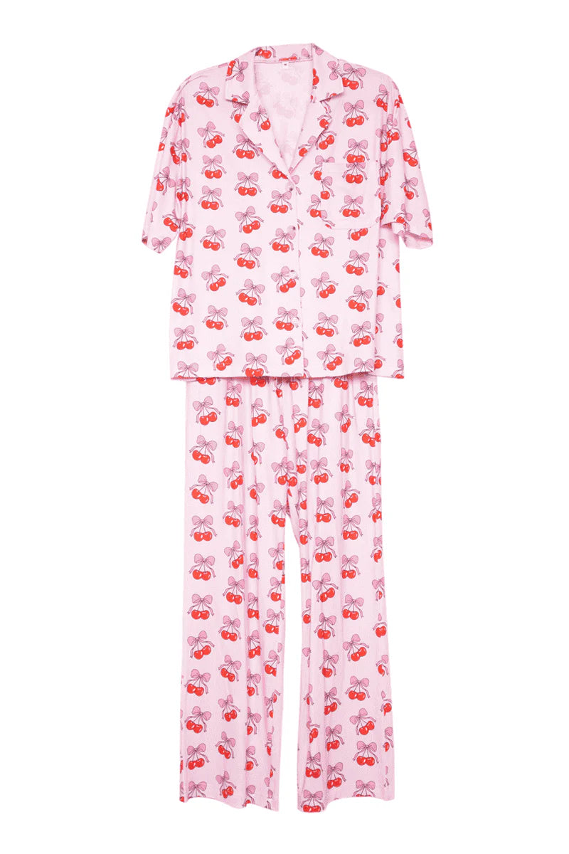 This pajama pant set is bursting with fruity flair and feminine vibes. Covered in a playful cherry bow print, the button-front top and matching pants with an elastic waistband create the ultimate coquette-inspired sleep set. And yes, these cherry bow pajamas come with pockets—because cuteness should always be convenient.