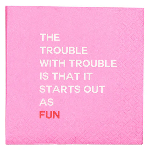 The "The Trouble With Trouble is That it Starts Out as Fun ." cocktail napkin is perfect for your next girls’ night or cocktail party! Striking pink with white and red makes this napkin a great choice for any party décor.  Both men and women love this fun saying! Mary Phillips cocktail napkins toss out the underlining element of fun and attitude, making yours an event they’ll not soon forget. You can also pair this little number with a bottle of wine for a most coveted hostess gift!! Each pack contains 20 5 x 5 three-ply cocktail napkins *super thick* packaged in polypropylene. Stock up for your next book club or to give to the hostess!