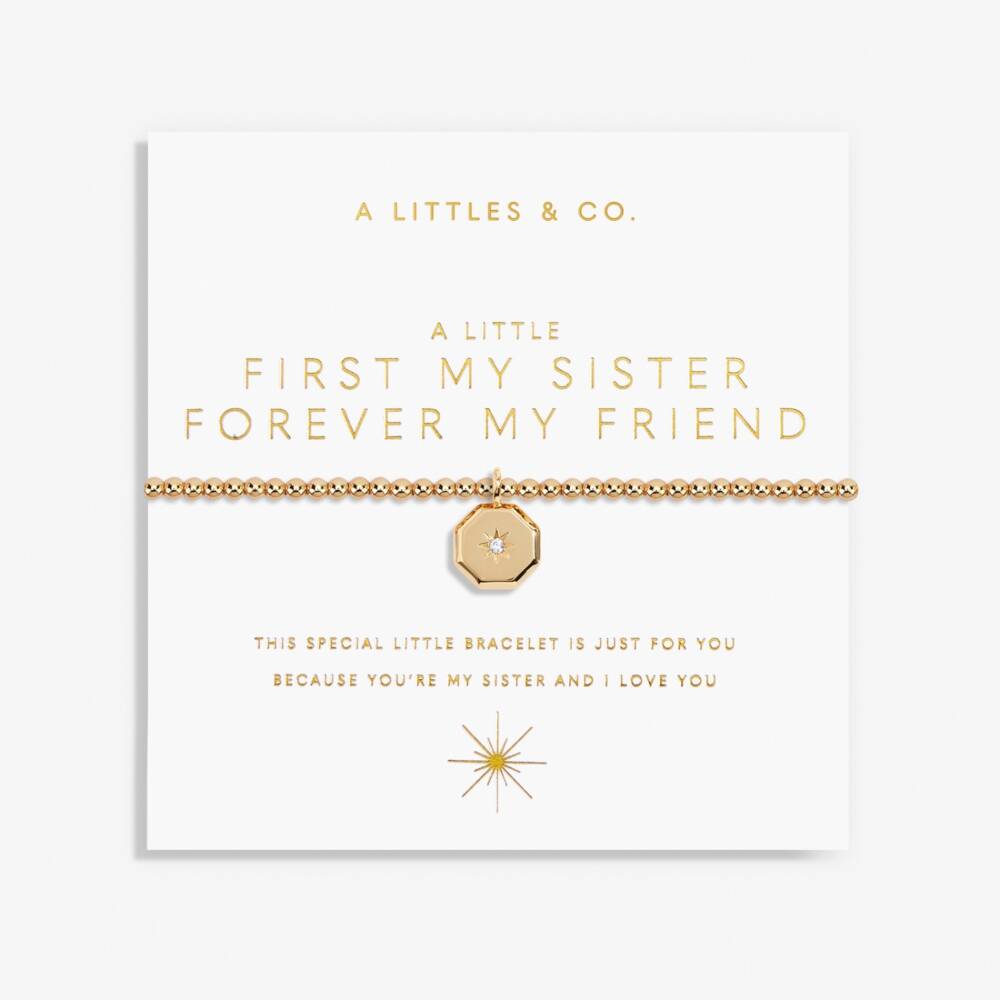 Celebrate all of life's treasured moments with those that mean the most with our ever-growing collection of Gold-Tone Plated A Littles. Featuring our signature beaded design that ensures a comfortable fit on any wrist, and crowned with a gold-tone plated octagonal disc charm, finished with a beautiful cubic zirconia gemstone to represent the bond you share with your sister, the A Little 'First My Sister Forever My Friend' Bracelet In Gold-Tone Plating comes carefully wrapped around a sentiment-stamped presentation card, ready to spread joy and make the sweetest addition to your loved one's stack.