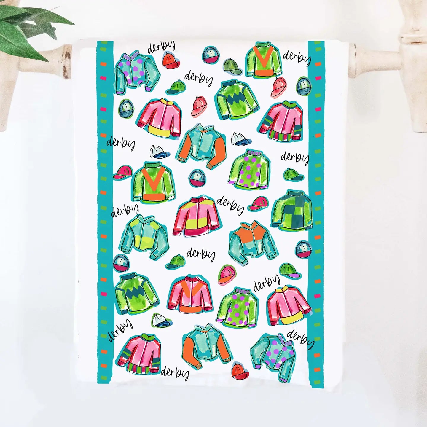 Our cotton kitchen tea towel is the perfect gift for all the Derby loving ladies! The artwork is all things colorful derby! Enjoy hanging this 19x28 dish towel in your kitchen, displaying at your next derby party, or using it as a hostess gift!