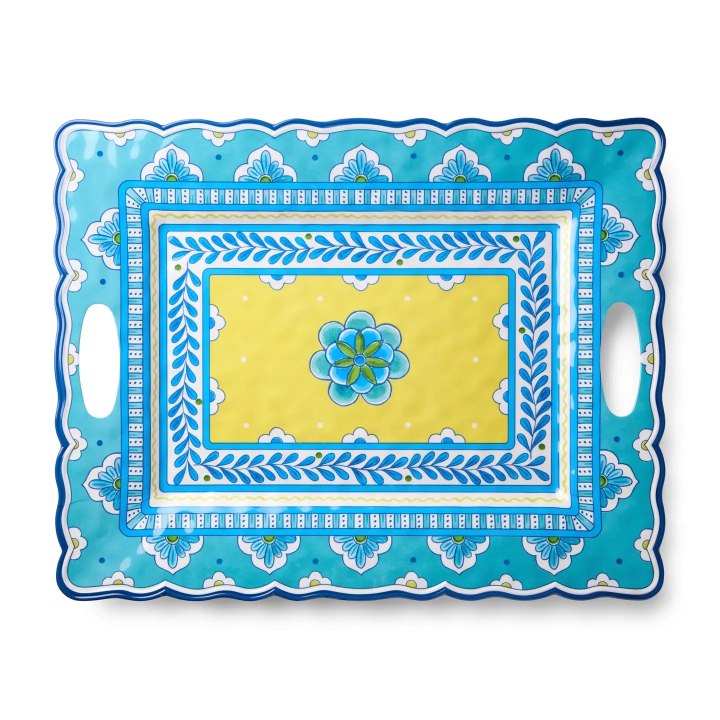 Designed for effortless entertaining with bold Mediterranean flair, the Porto Rectangular Platter with Handles features vibrant layers of cobalt blue, turquoise, and sunny yellow in intricate hand-painted motifs. Softly scalloped edges and integrated handles make serving both elegant and easy. Crafted from durable melamine, it delivers the beauty of ceramic with everyday practicality, perfect for appetizers, seafood, desserts, or shared favorites indoors or out. Porto brings warmth, color, and joyful hospitality to every gathering.