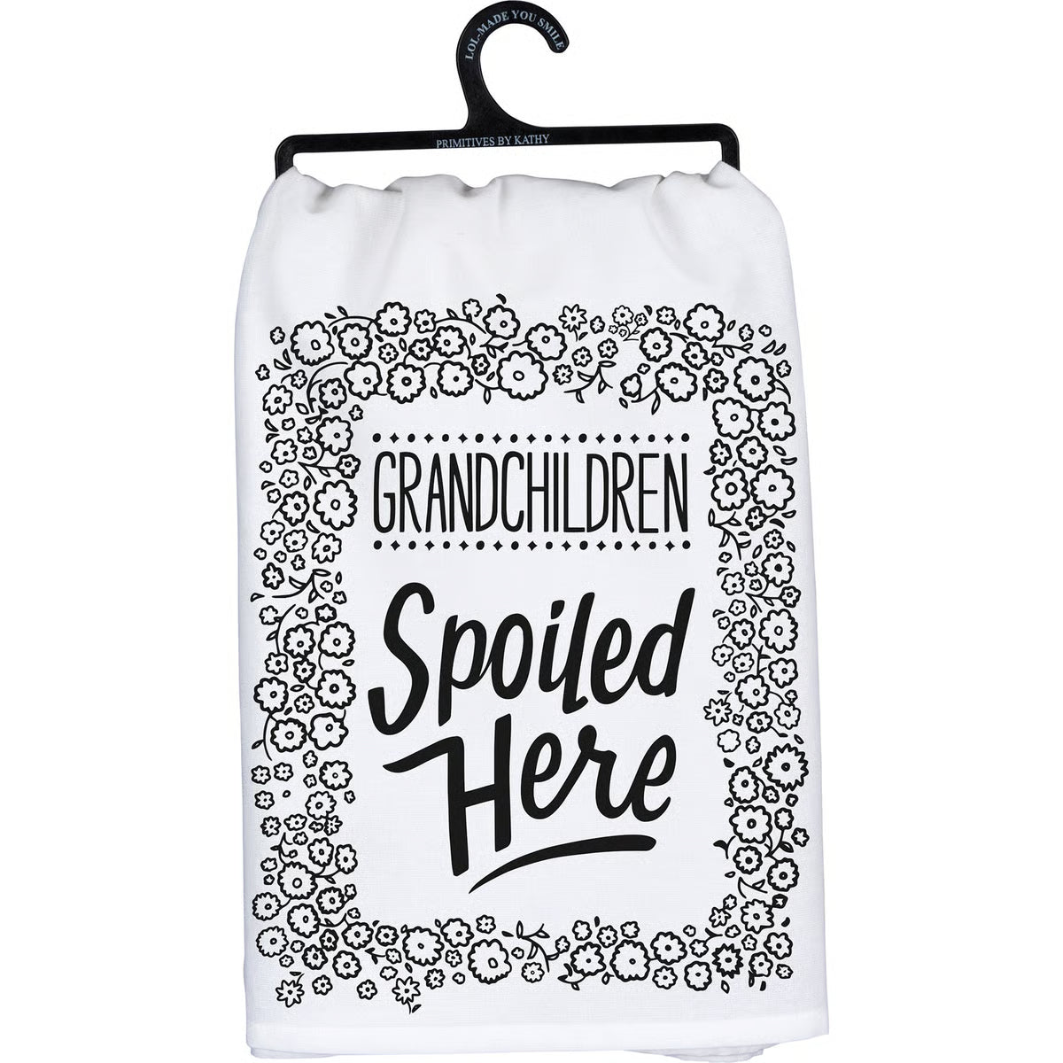 A black and white cotton kitchen towel featuring "Grandchildren Spoiled Here" sentiment and floral design. Machine-washable.