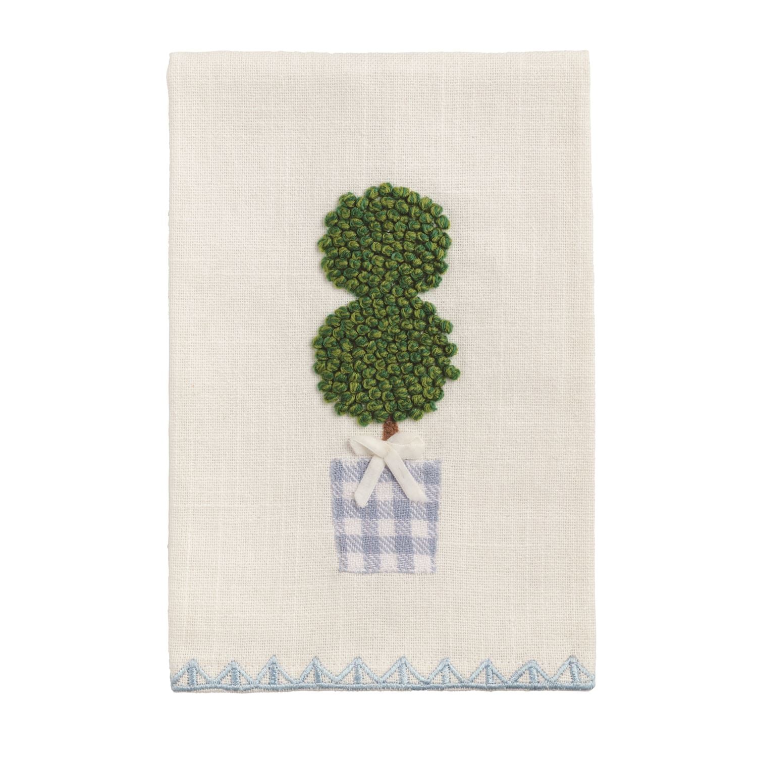 Woven yarn-dyed stripe towel features embroidered icon with dimensional embellishments.