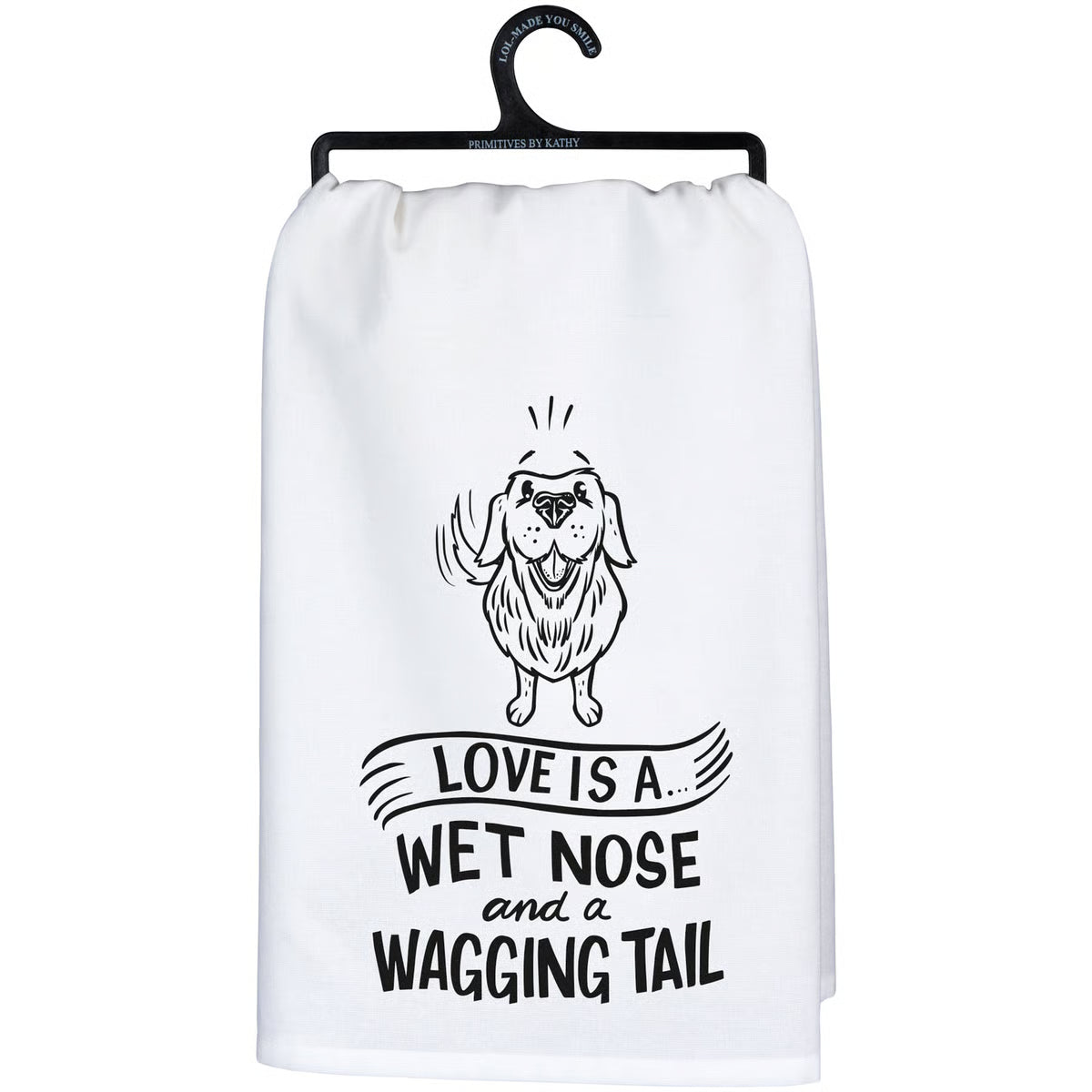 Our Wagging Tail kitchen towel is conveniently machine-washable for easy cleaning. Packaged on a black plastic hanger to easily display on rack. A fun pet-themed kitchen accessory perfect for everyday use.