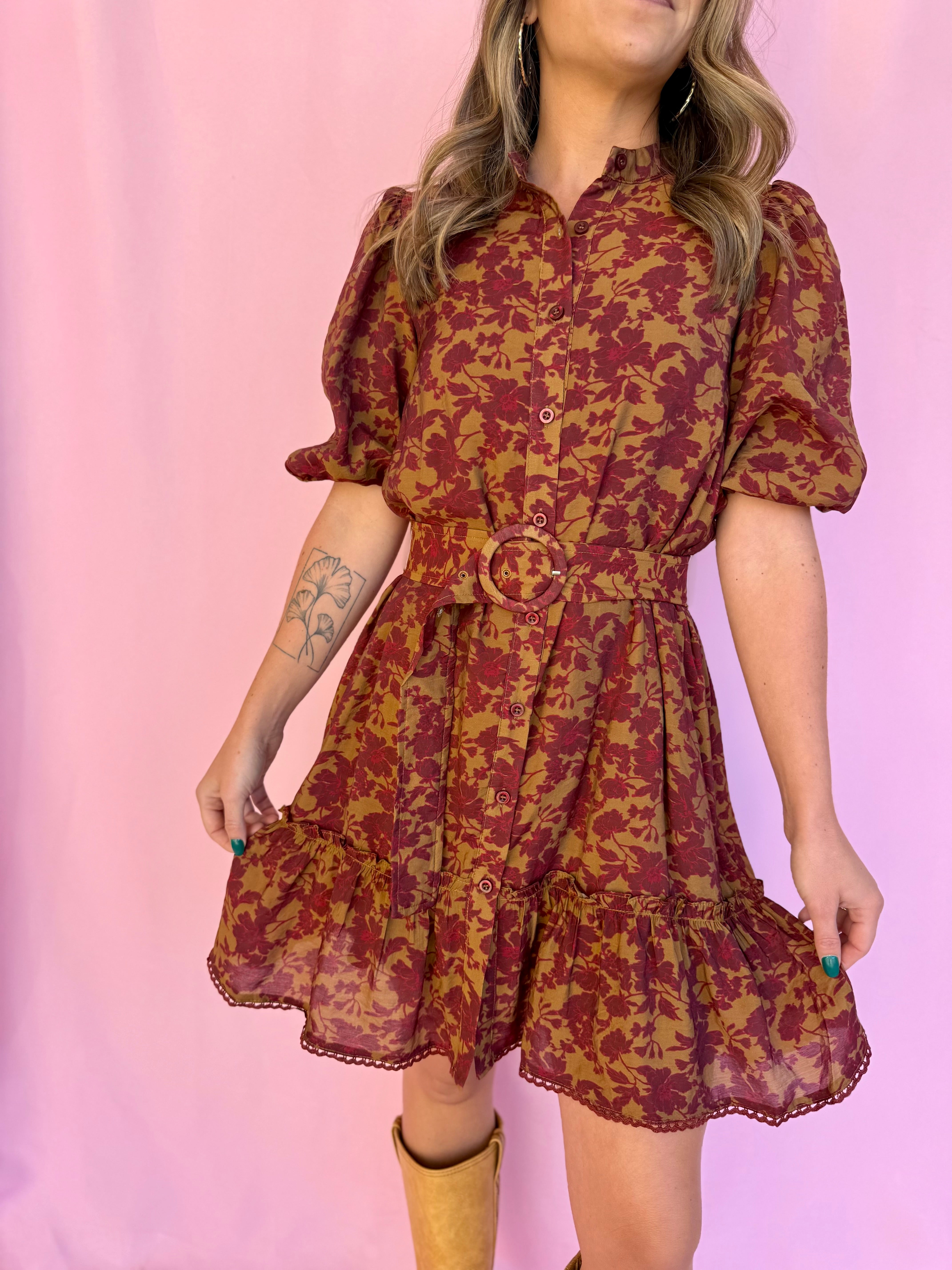 Twirl into autumn in this absolutely adorable mini dress featuring a gorgeous burgundy and burnt orange floral print that's totally giving cozy season vibes! The fitted silhouette is super flattering, and we're obsessed with the belt details that cinch at just the right spot for that perfect hourglass moment. Whether you're heading to a casual brunch or a cute date night, this dress is your new go-to for effortless style. The rich jewel tones and delicate florals make it perfect for layering with your favorite cardigan or jacket. Get ready to feel like the main character in this sweet little number!