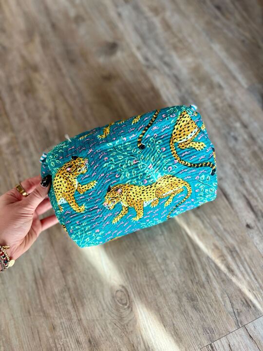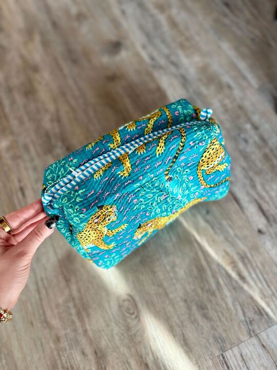 Roar into your beauty routine with this adorable teal tiger print makeup bag! Featuring a playful quilted design, it's the perfect blend of wild style and practical storage. Keep your cosmetics, brushes, and essentials organized in one fabulous pouch that's as fun as you are. Whether you're heading to the gym, traveling, or just need a cute way to stash your glam, this tiger-printed beauty is ready to go wherever you do. Totally fierce, totally fabulous!