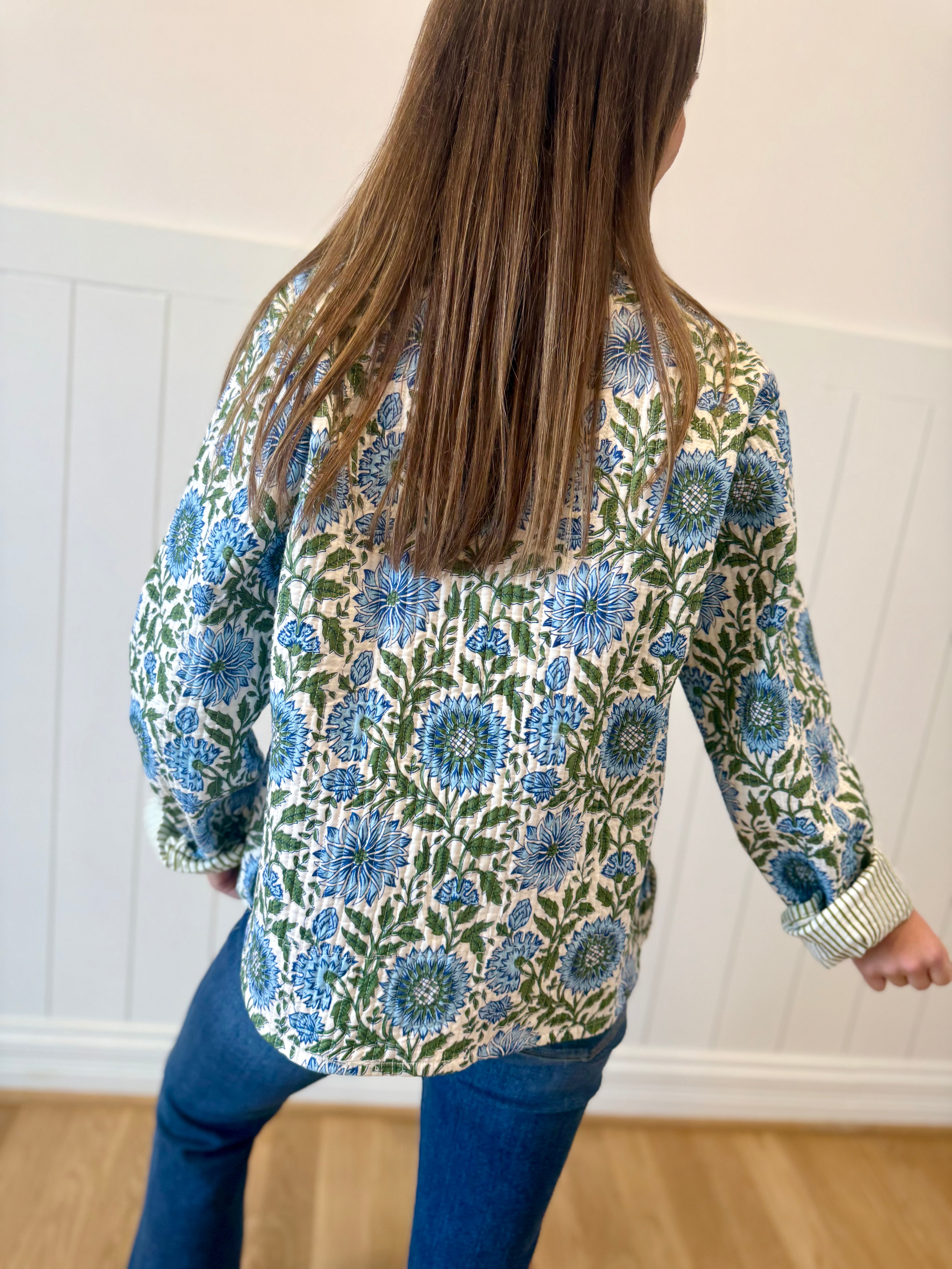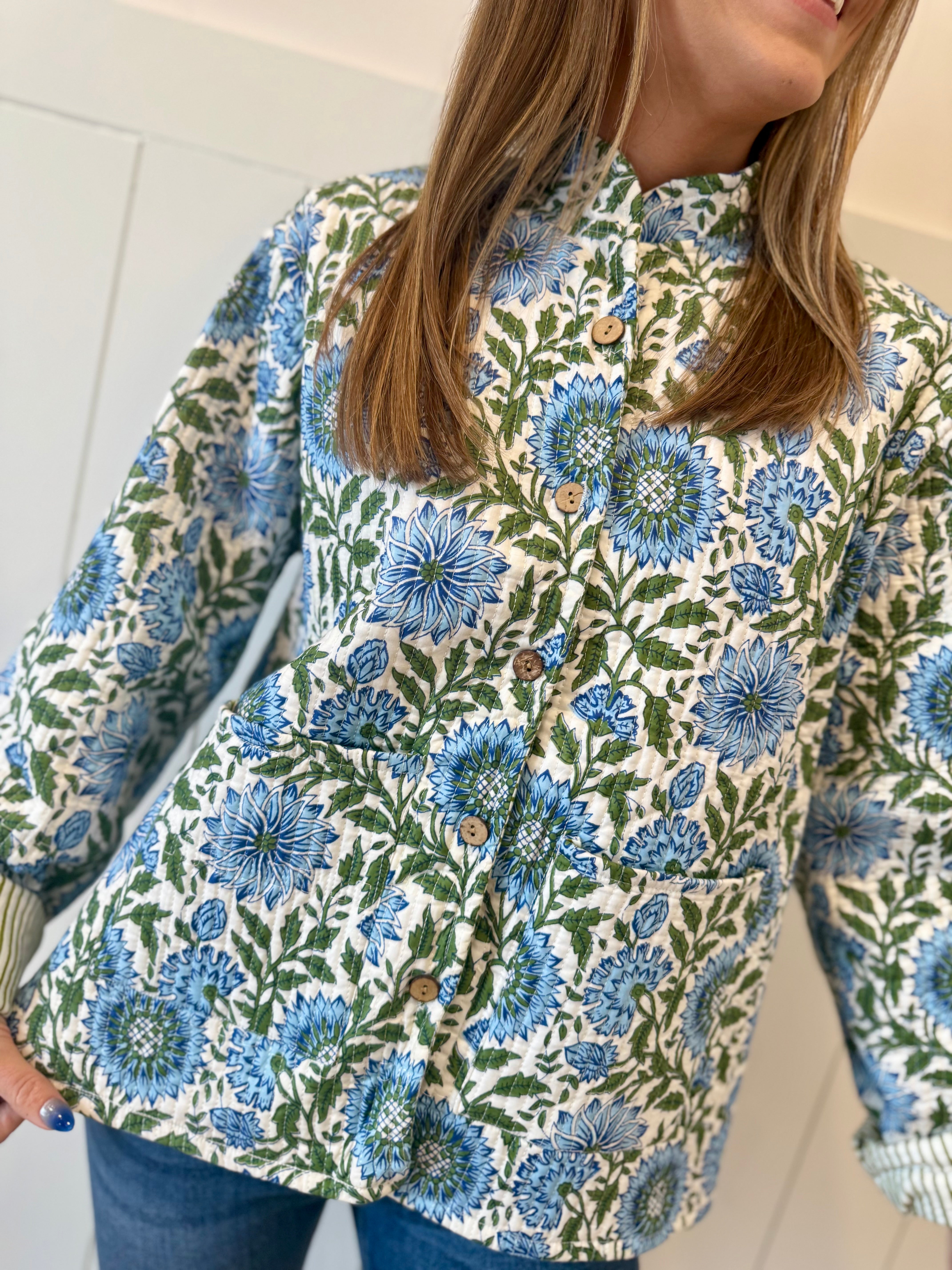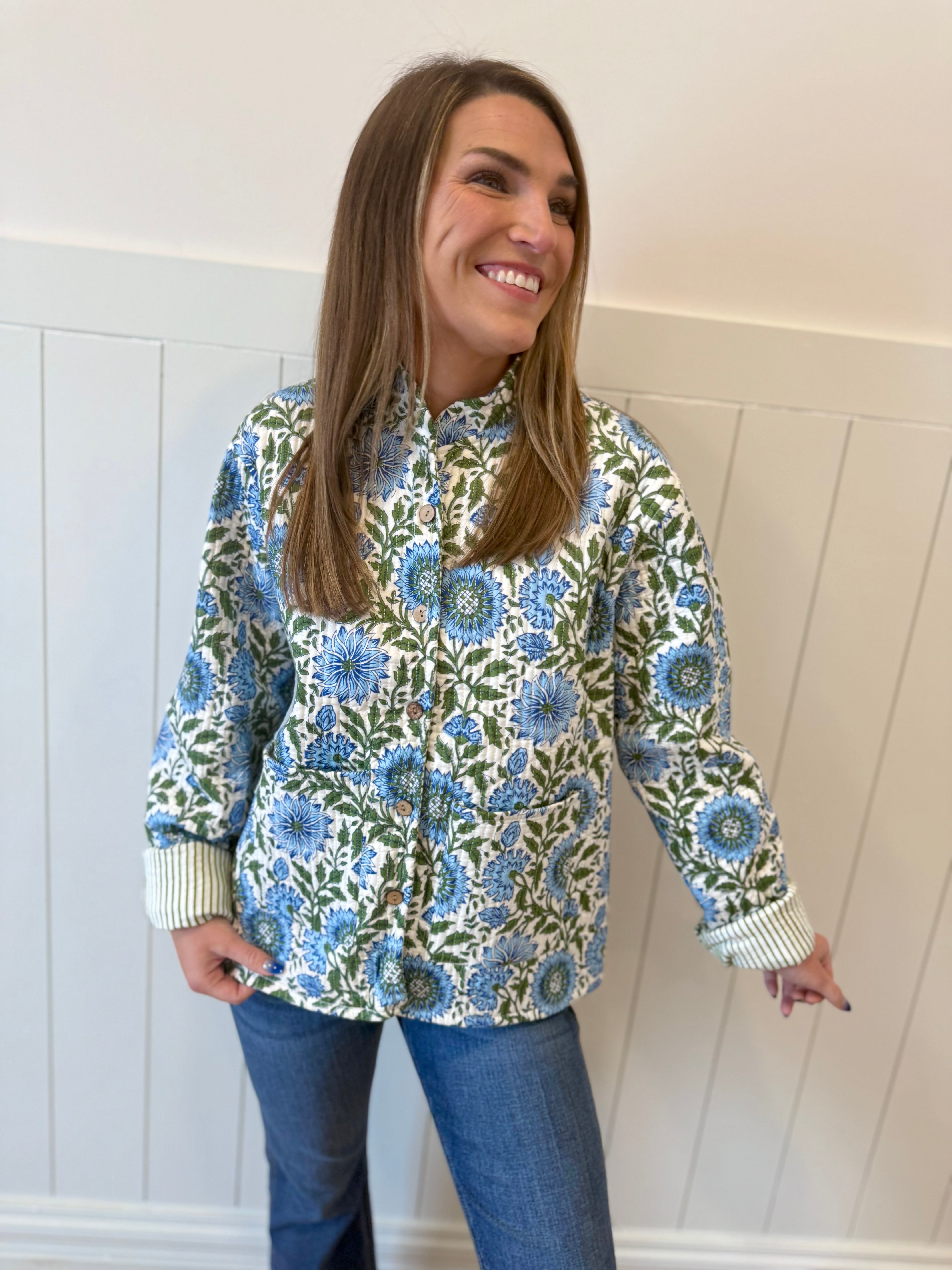 Step out in style with this gorgeous blue floral quilted button-up jacket! Featuring a beautiful floral print on the outside and a fun striped lining on the inside, this jacket is as charming as it is practical. The quilted construction keeps you cozy and warm while the classic button-up design makes it easy to layer over any outfit. Whether you're running errands, meeting friends, or enjoying a casual day out, this jacket adds the perfect touch of sweetness and sophistication to your look. Show off both sides of your style!