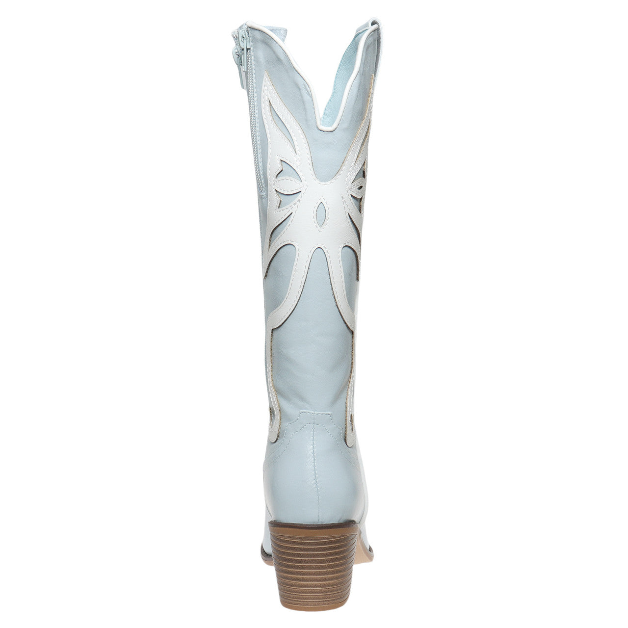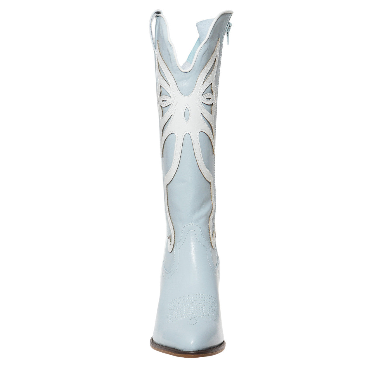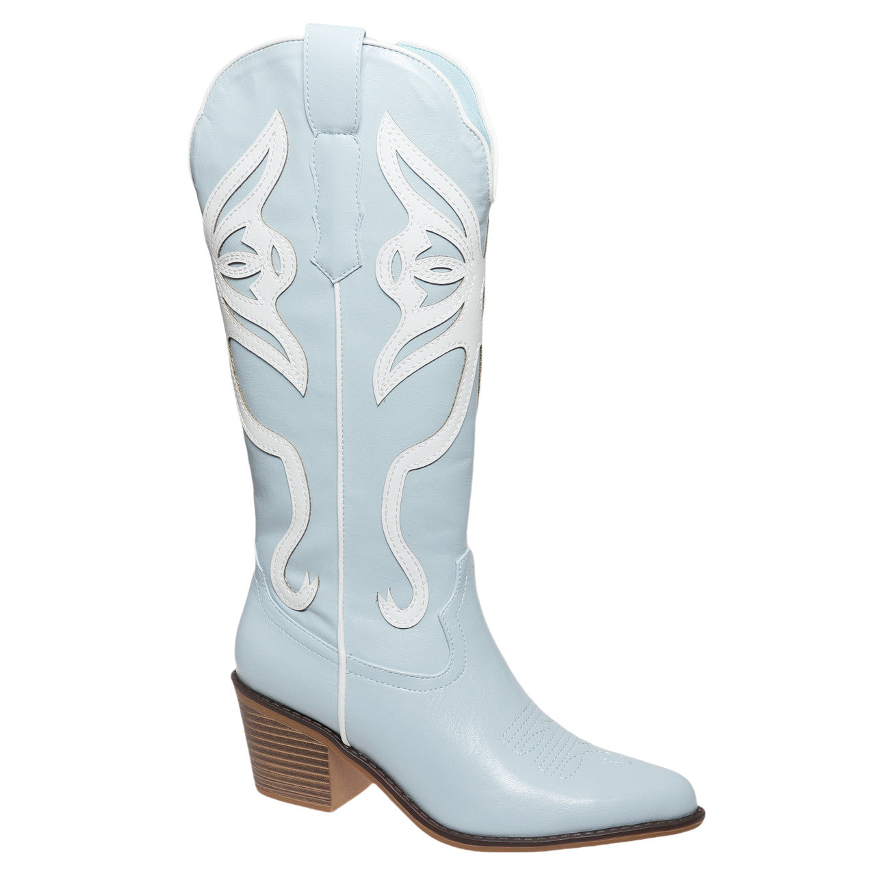 Step into sunshine with the Blue Whitney Cowboy Boot! This light blue, mid-rise boot sparkles with a playful design that adds a pop of fun to any outfit. Perfect for dancing, strolling, or making a statement, these boots blend comfort and charm for a happy, head-turning look.