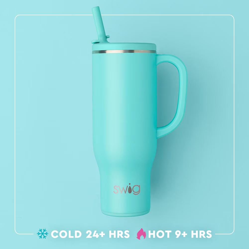 New lid, zero leaks, same great size! This print blooms with timeless charm, featuring clusters of soft blue hydrangeas scattered across a delicate blush and white pinstripes background. Your favorite Mega Mug just got an upgrade with our new dual threaded Flip + Sip leakproof lid! The straw features a curved tab that makes it easy to flip open for smooth sipping. When you're on the go, snap the straw shut for a leakproof, worry-free experience.