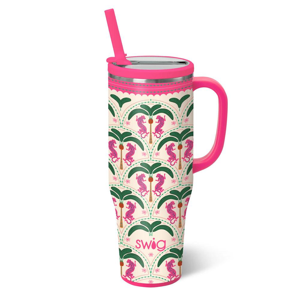 New lid, zero leaks, same great size! Step into a stylish safari with Palm Royale, where vibrant pink leopards prowl beneath swaying palm fronds on a glitter ivory background.