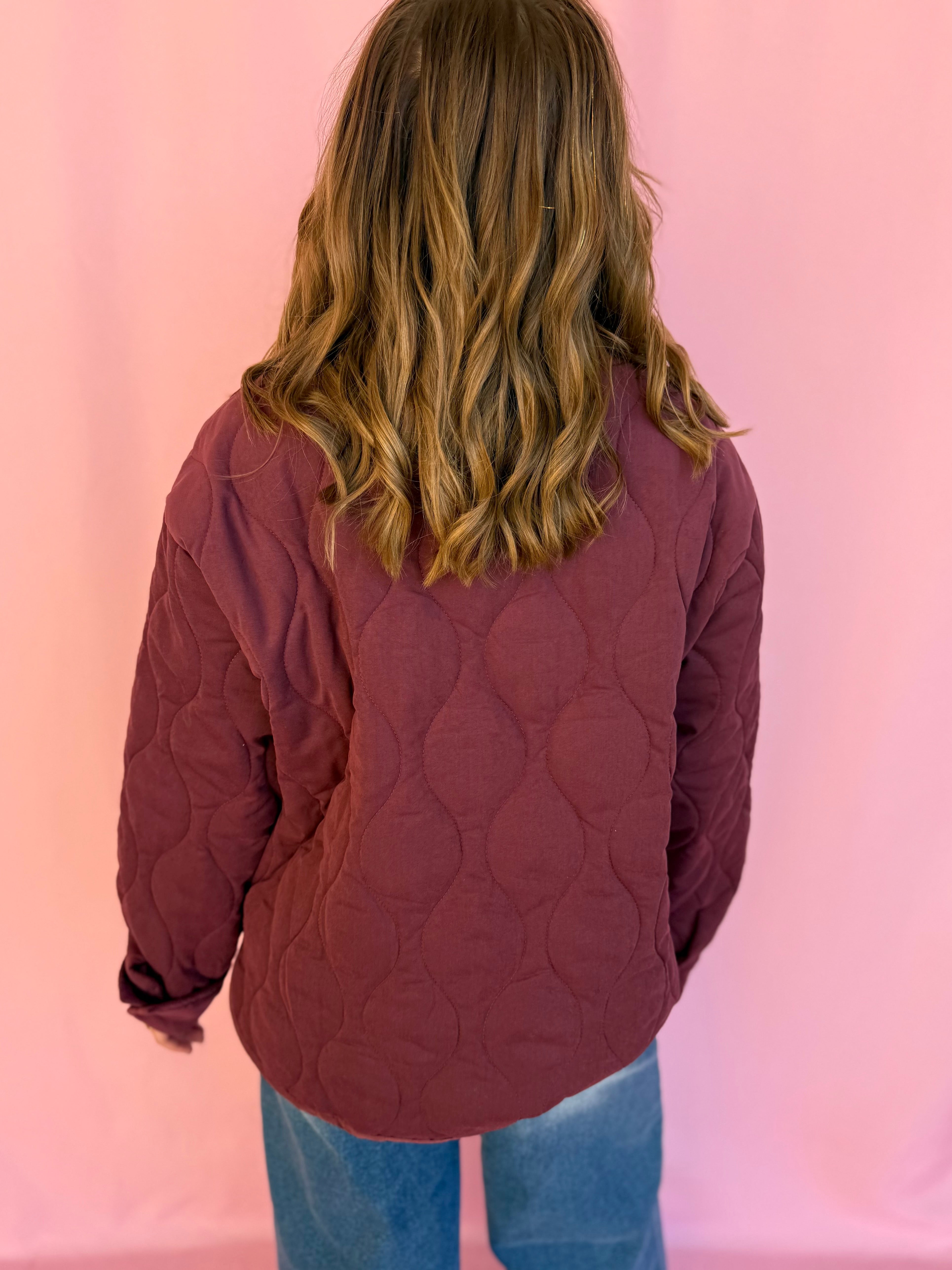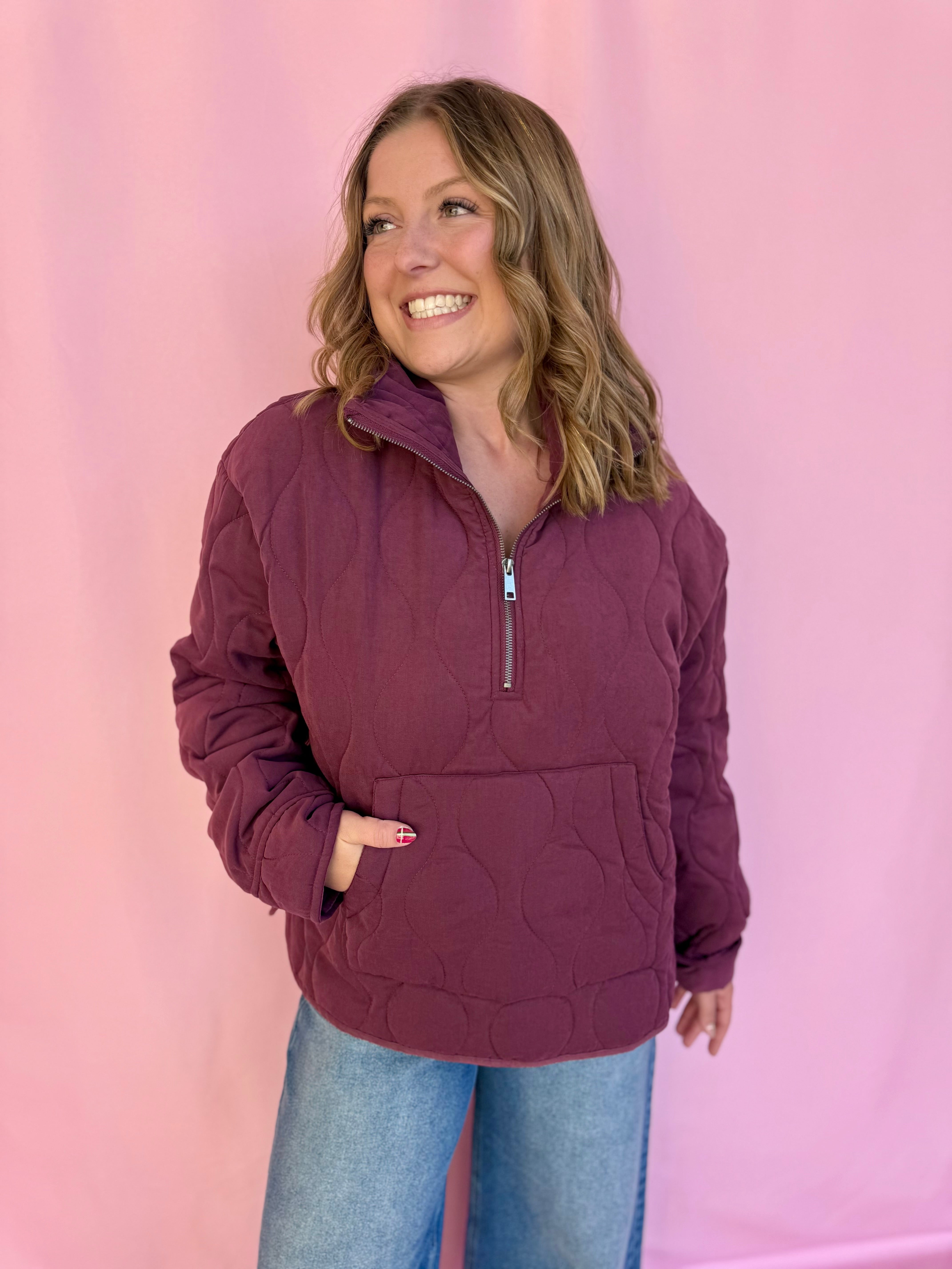 Meet your new favorite cozy companion! This stunning red and burgundy quilted pullover is the ultimate layering piece that works with literally everything in your closet. The quilted texture adds such a cute dimension and keeps things interesting, while the rich jewel tones are totally versatile for any season. Slip it on over your favorite tee or wear it solo for that effortlessly chic vibe. Perfect for those days when you want to feel snug and stylish without sacrificing an ounce of comfort. This is the kind of sweatshirt you'll reach for again and again because it just makes you feel amazing!