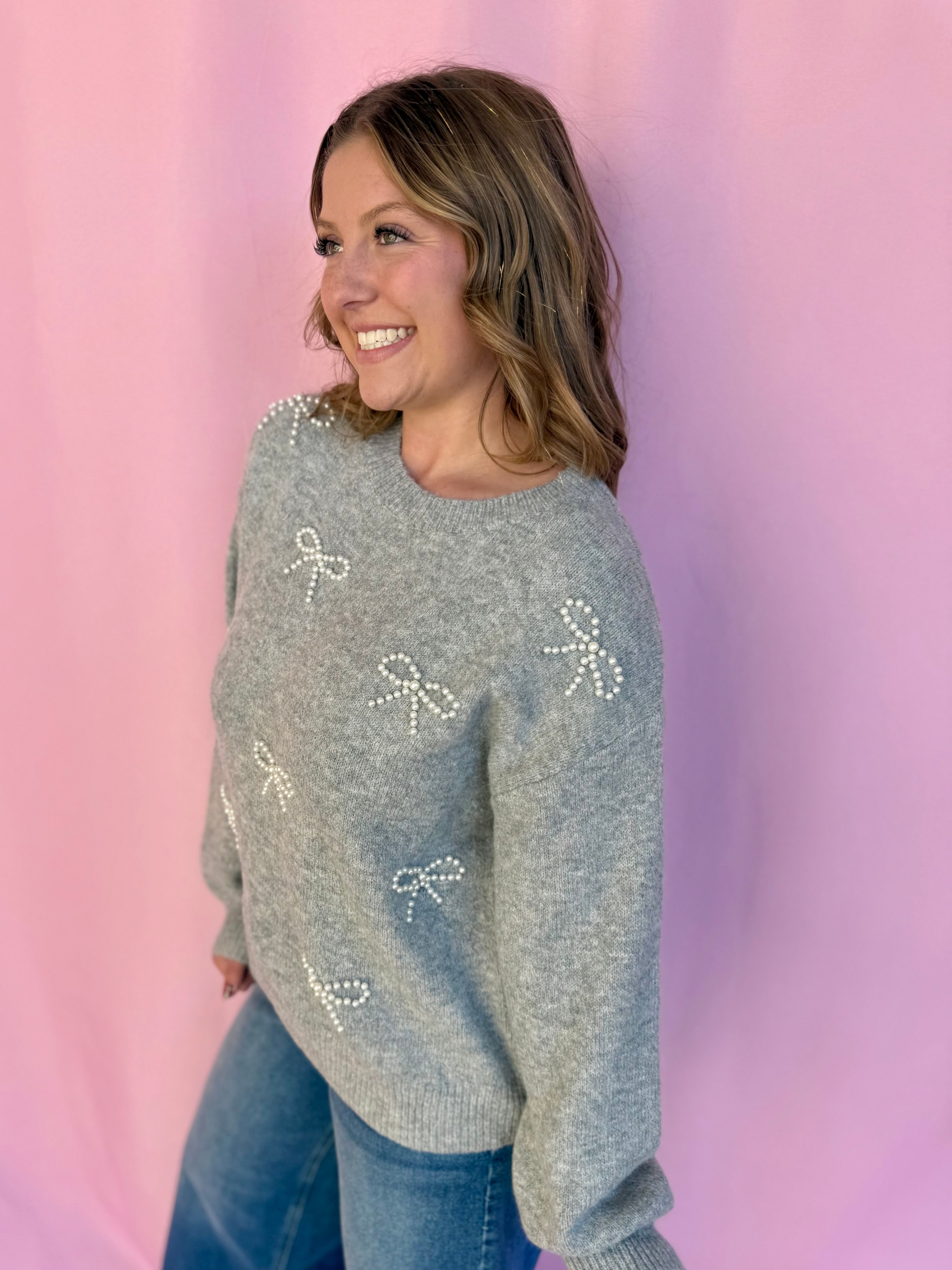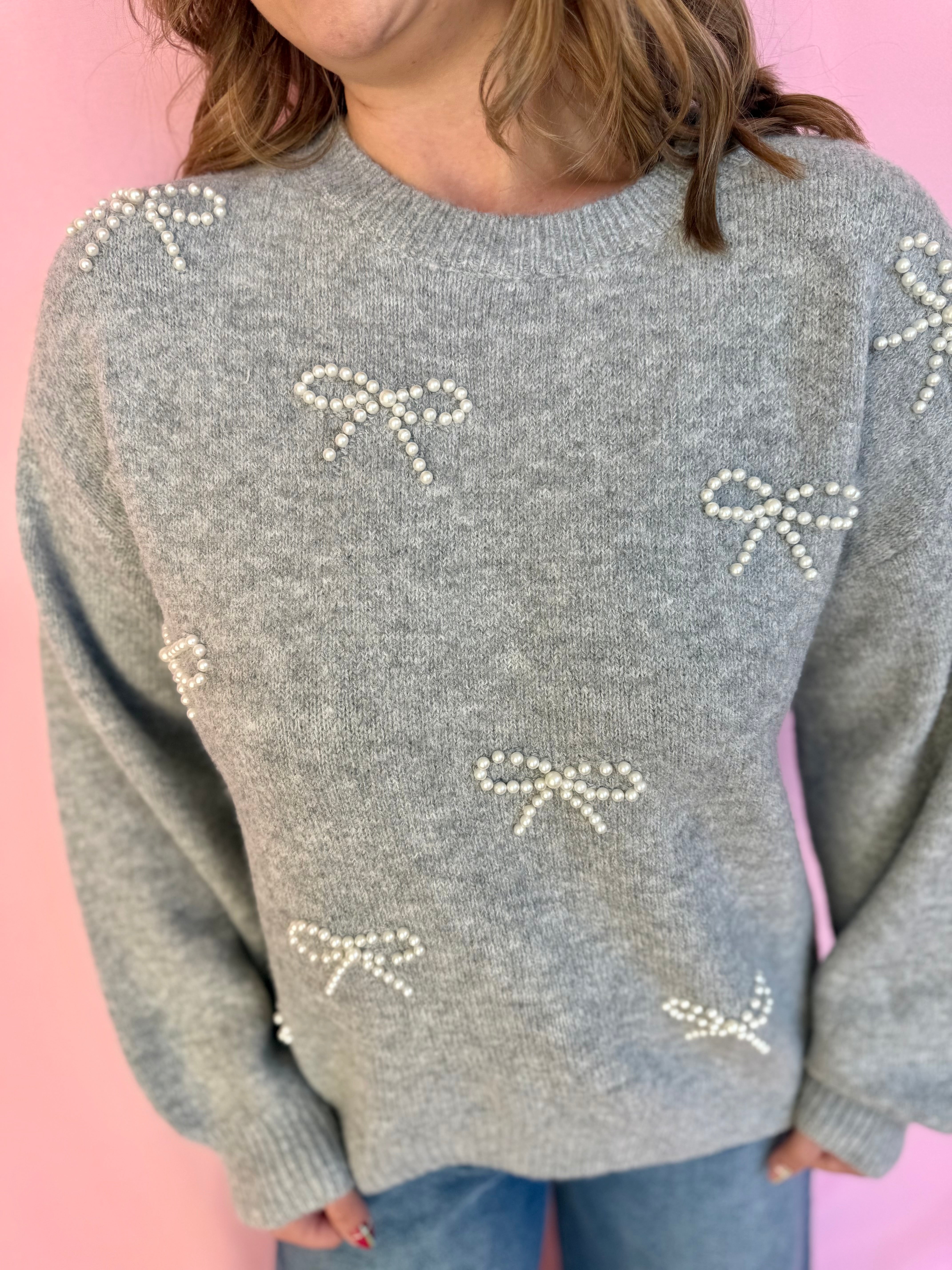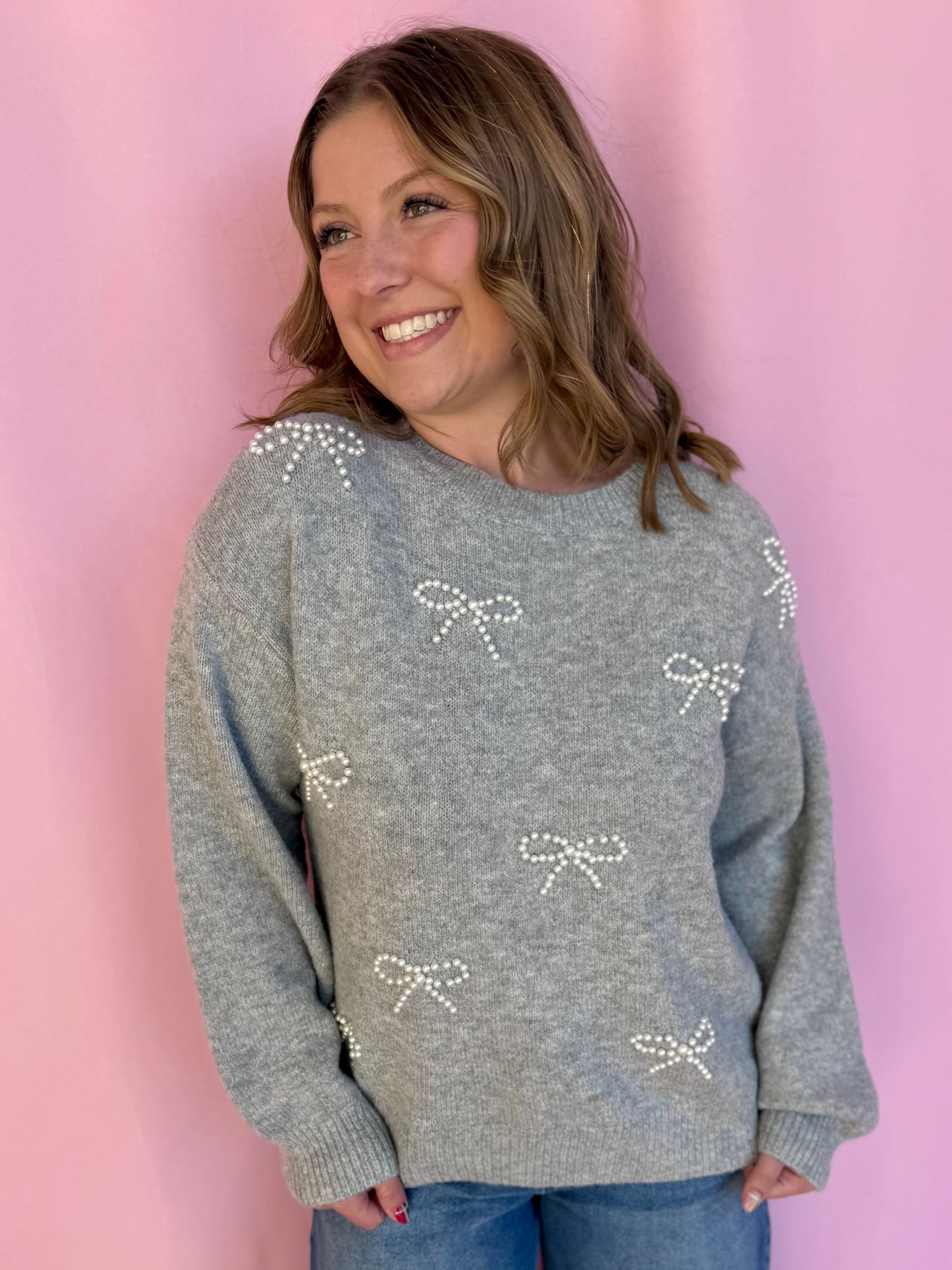 This precious grey sweater is giving all the elegant, feminine energy with its stunning pearl bow details! Soft, cozy, and absolutely charming, it's the kind of piece that instantly elevates your everyday look. The delicate pearl embellishments add such a sweet touch of sophistication without being over the top. Layer it over a crisp white shirt, pair it with your favorite jeans, or wear it solo for that effortlessly put-together vibe. Whether you're heading to the office or meeting friends for coffee, this sweater makes you feel polished and pretty. It's the perfect blend of comfort and style that'll have you reaching for it constantly!