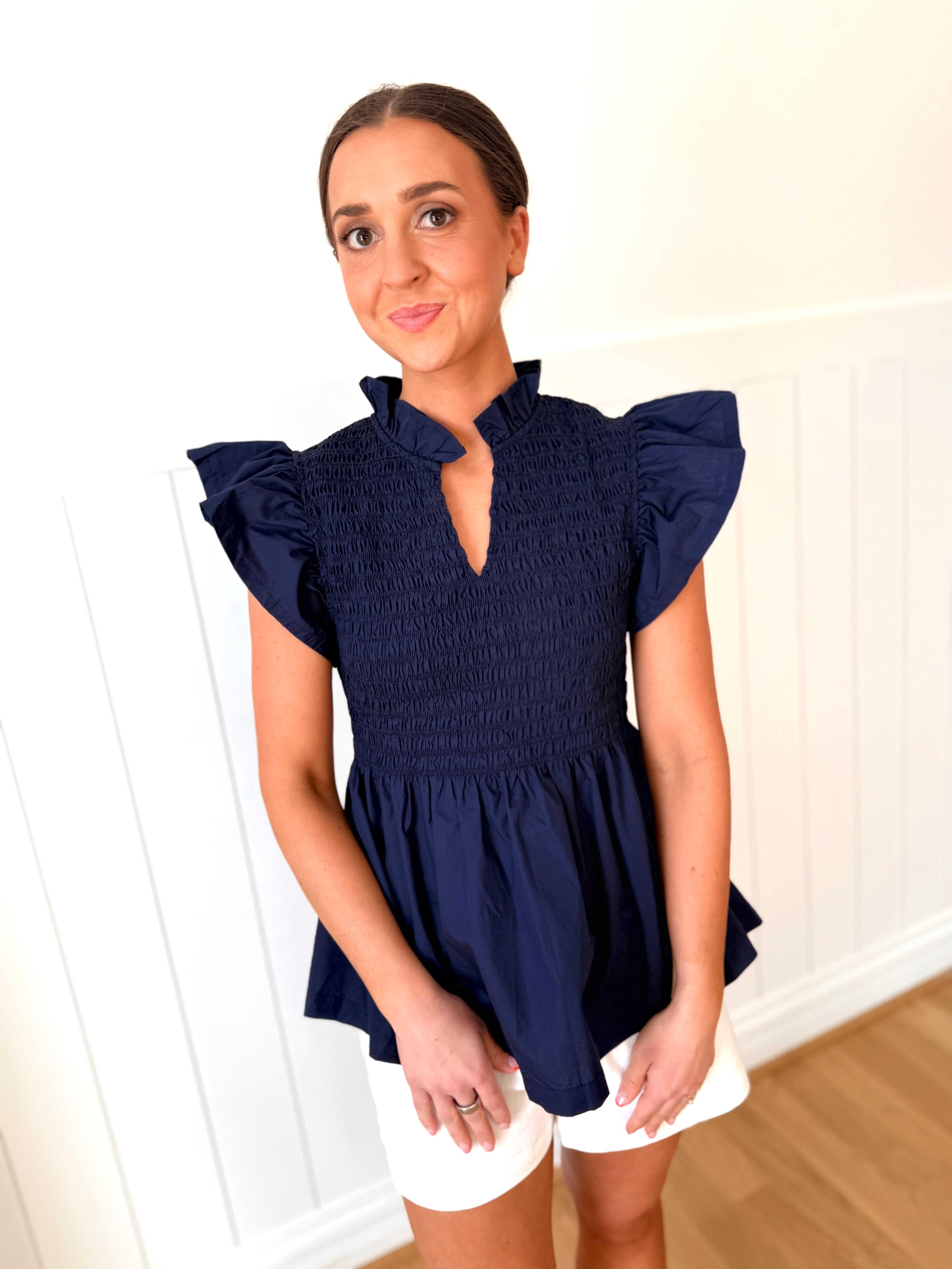 Twirl into your next outfit with this adorable peplum top! Featuring delicate flutter sleeves and charming smocking details, it's the perfect blend of playful and polished. The flattering peplum silhouette adds a fun pop of dimension, while the smocking gives you that effortless, gathered elegance. Whether you're dressing up for a special occasion or keeping it casual, this top brings instant joy and movement to your wardrobe. A sweet staple that makes you feel as fabulous as you look!