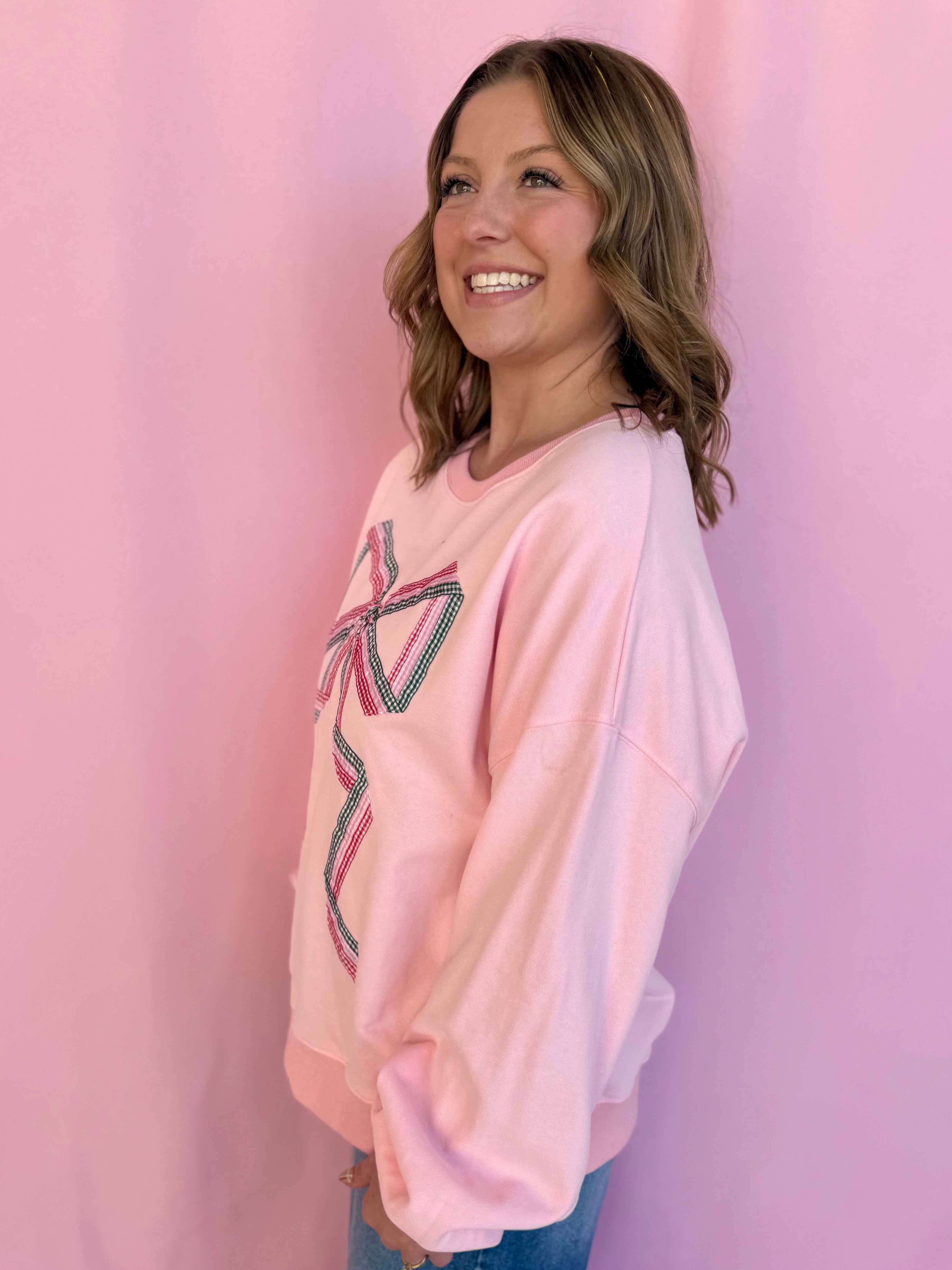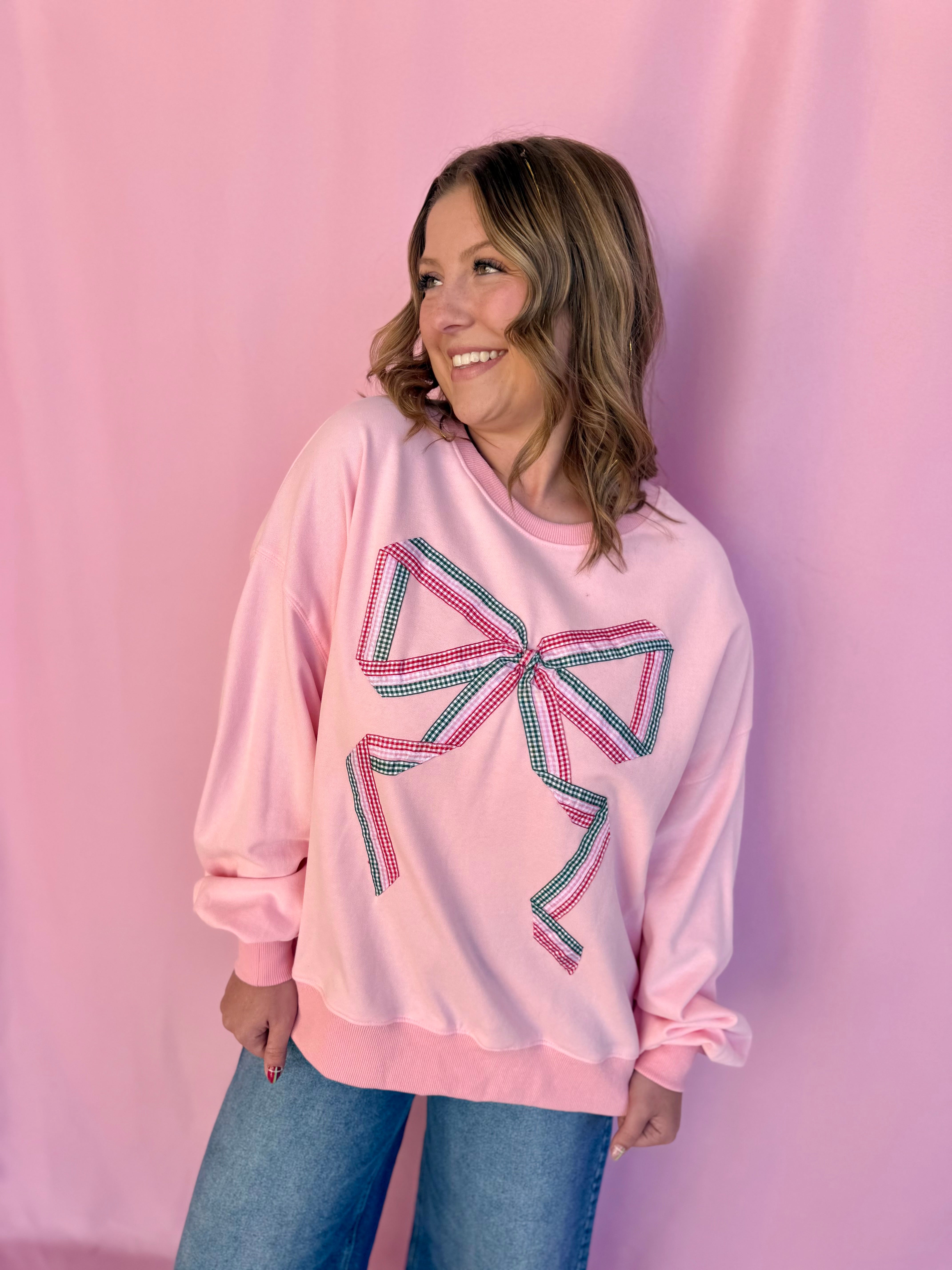 Fall in love with this precious pink crewneck that's sweetly adorned with a charming plaid bow detail! The soft, flattering silhouette pairs perfectly with the preppy bow accent, creating a look that's both timeless and playfully feminine. Versatile enough to dress up or down, this top brings instant cheerfulness to any outfit and makes you feel effortlessly put-together. Perfect for layering or wearing solo, it's the kind of piece that becomes an instant favorite in your wardrobe!