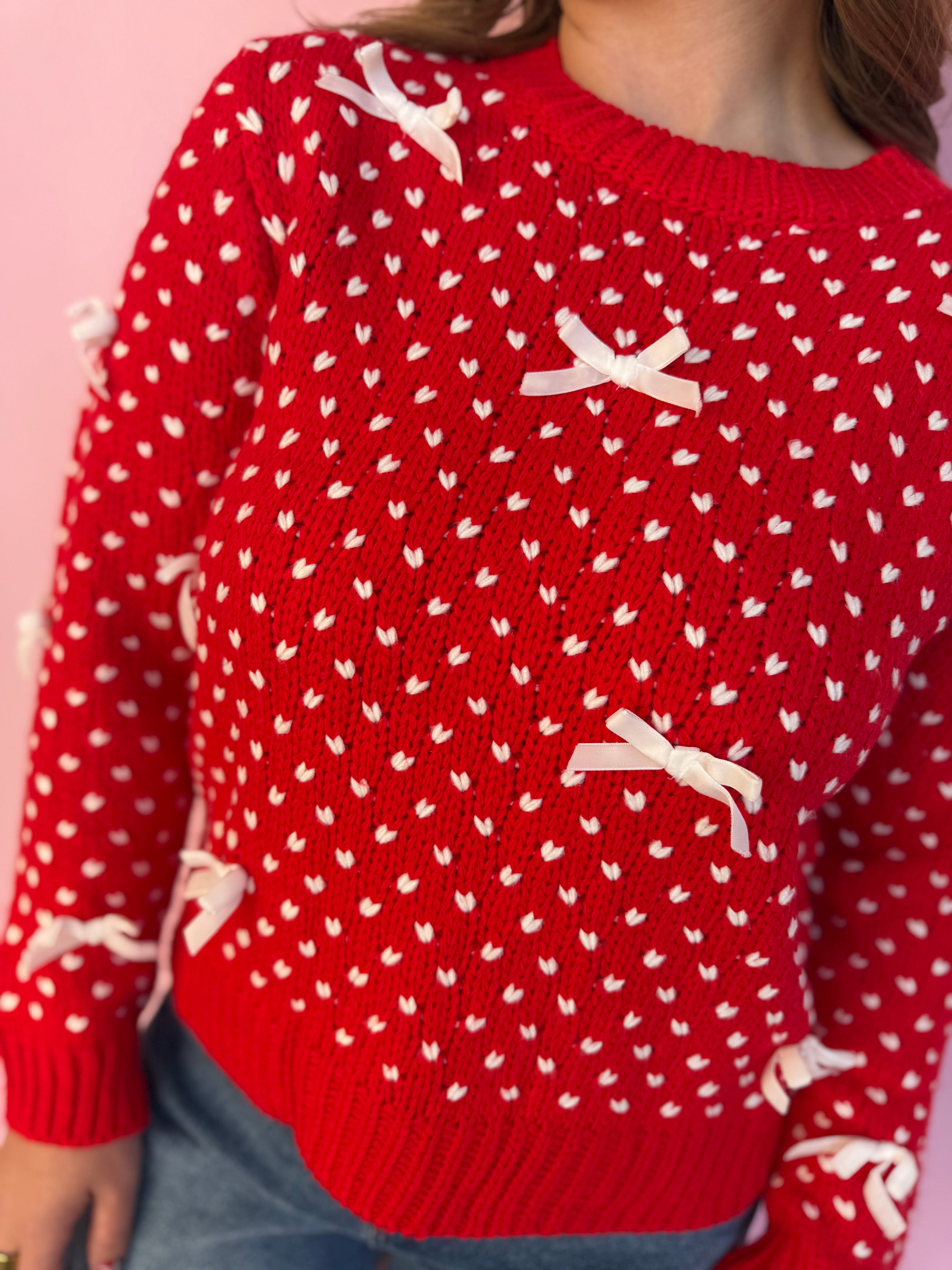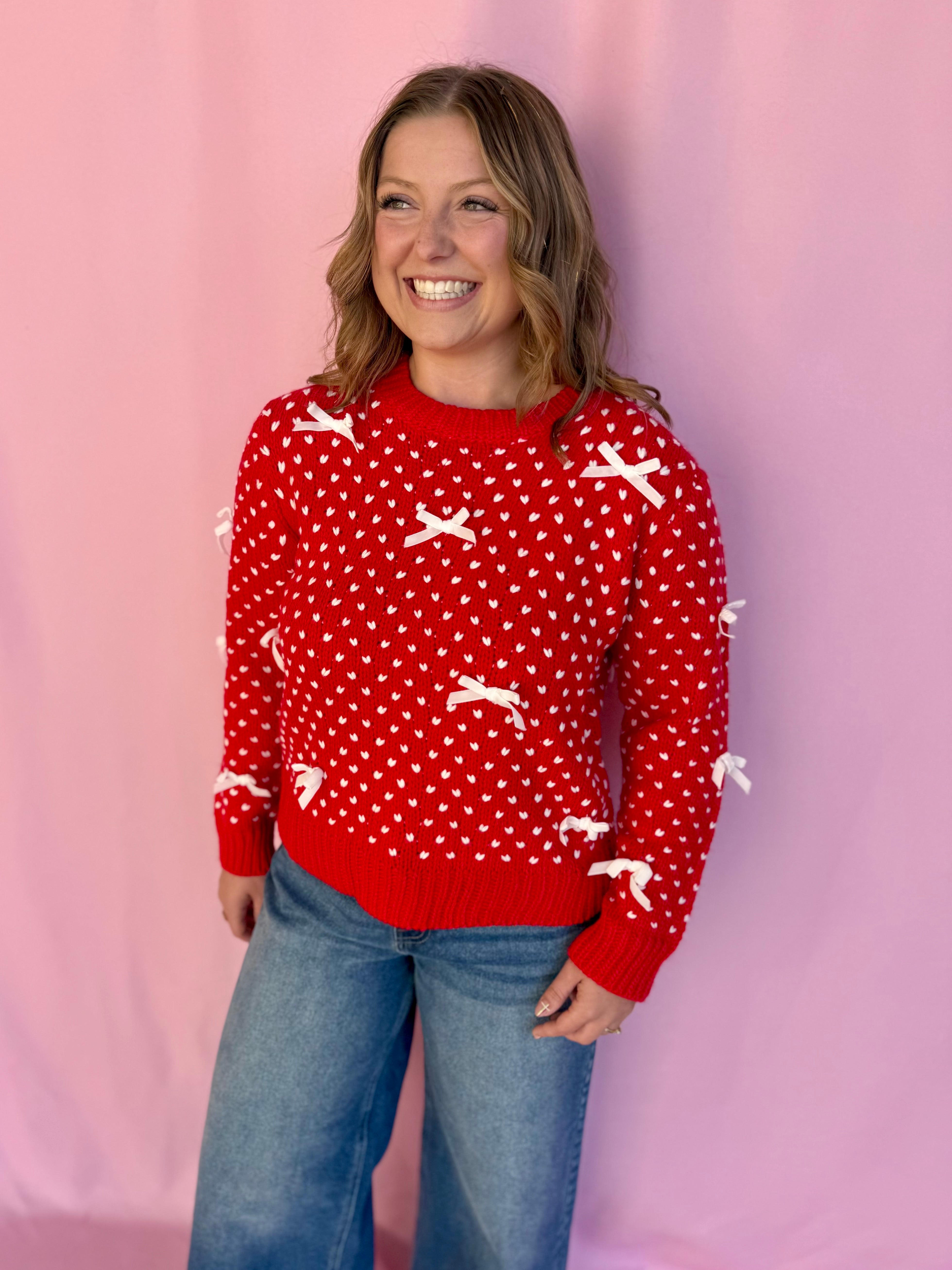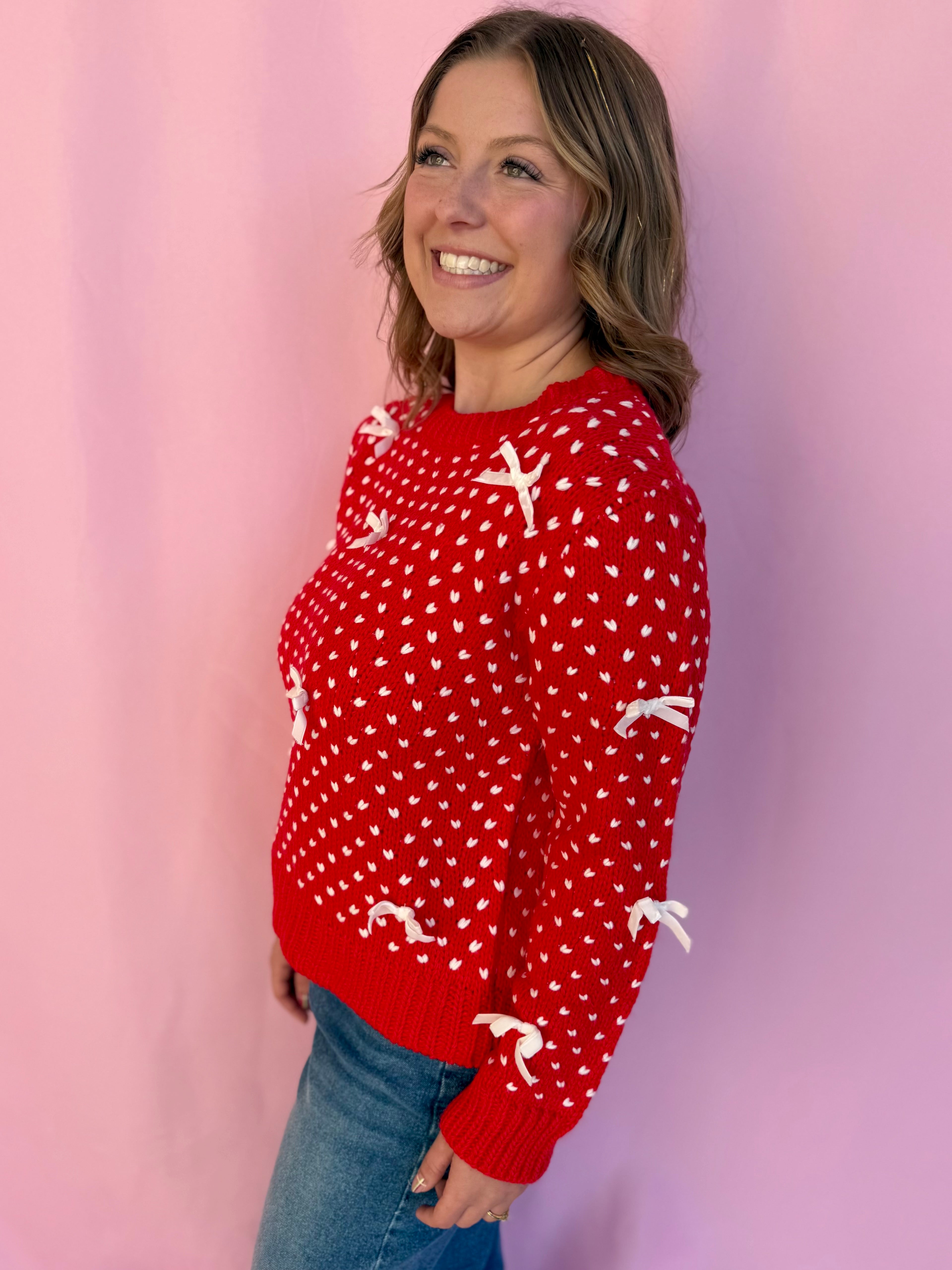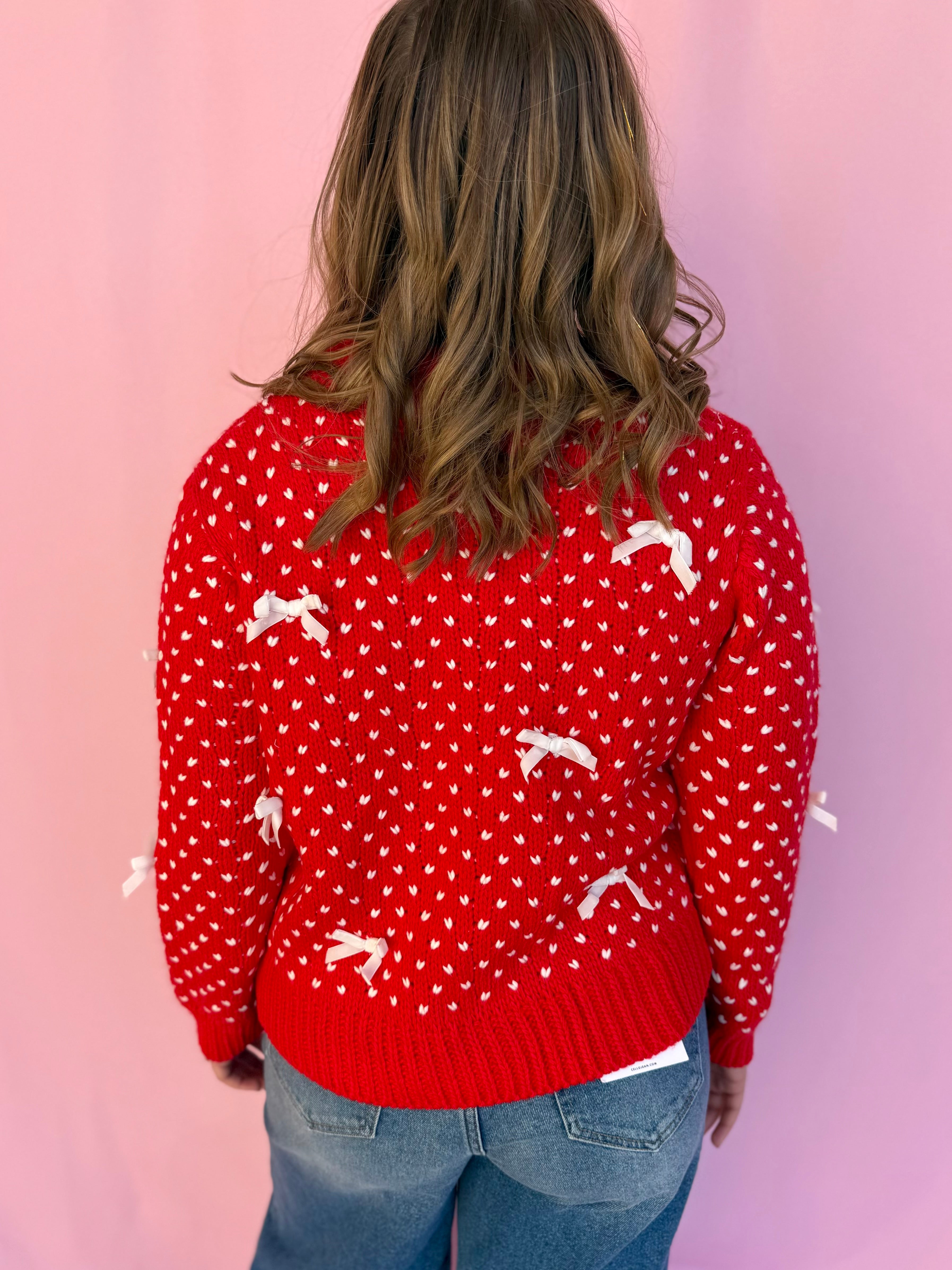 Get ready to feel absolutely adorable in this stunning red sweater featuring the cutest white bow details! The classic color combo is so timeless and works with practically everything in your closet. The bow accents add that perfect pop of feminine charm that makes this sweater totally special. Cozy enough for lazy days but cute enough to turn heads, it's your new go-to for looking effortlessly put-together. Throw it on with your favorite bottoms and instantly feel like the sweetest version of yourself. This is the kind of sweater that brings out your inner darling and makes every day feel a little more magical!